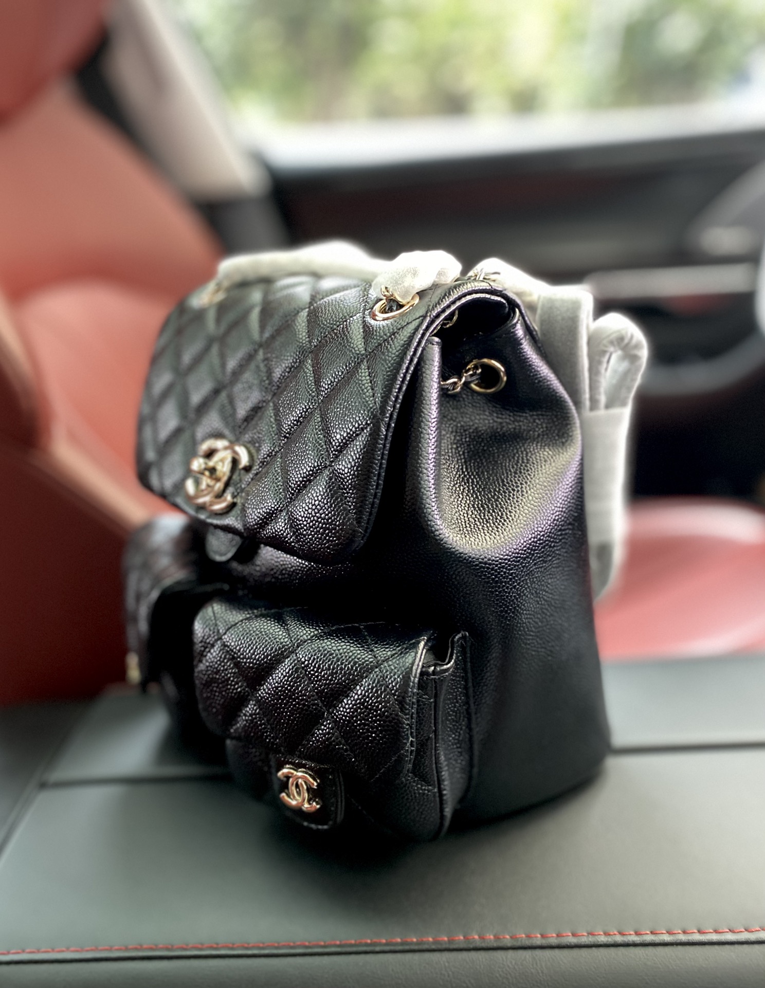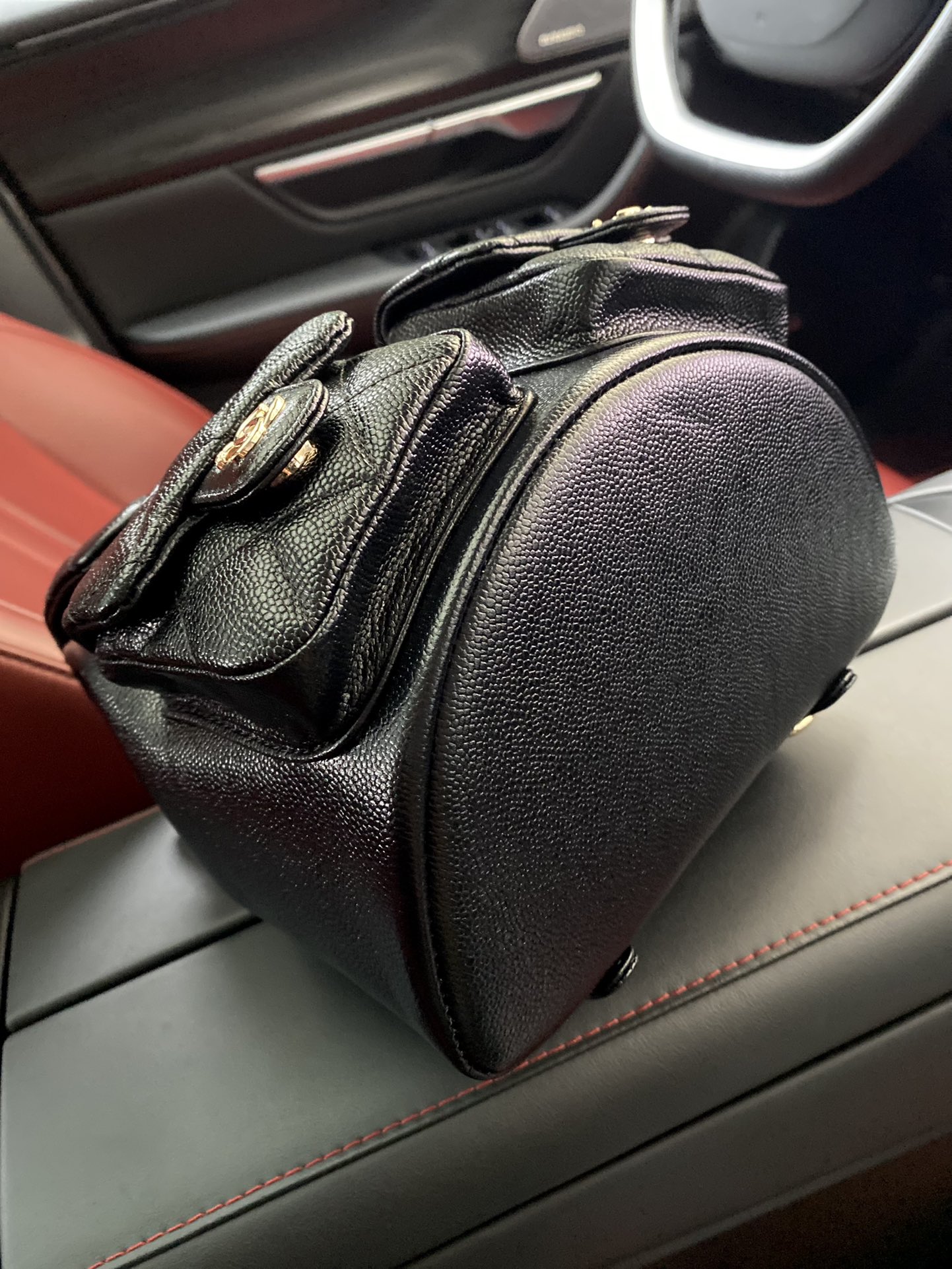 This Chanel backpack is a stylish and functional accessory for the modern woman. It is designed to be both eye-catching and practical, suitable for a variety of occasions.