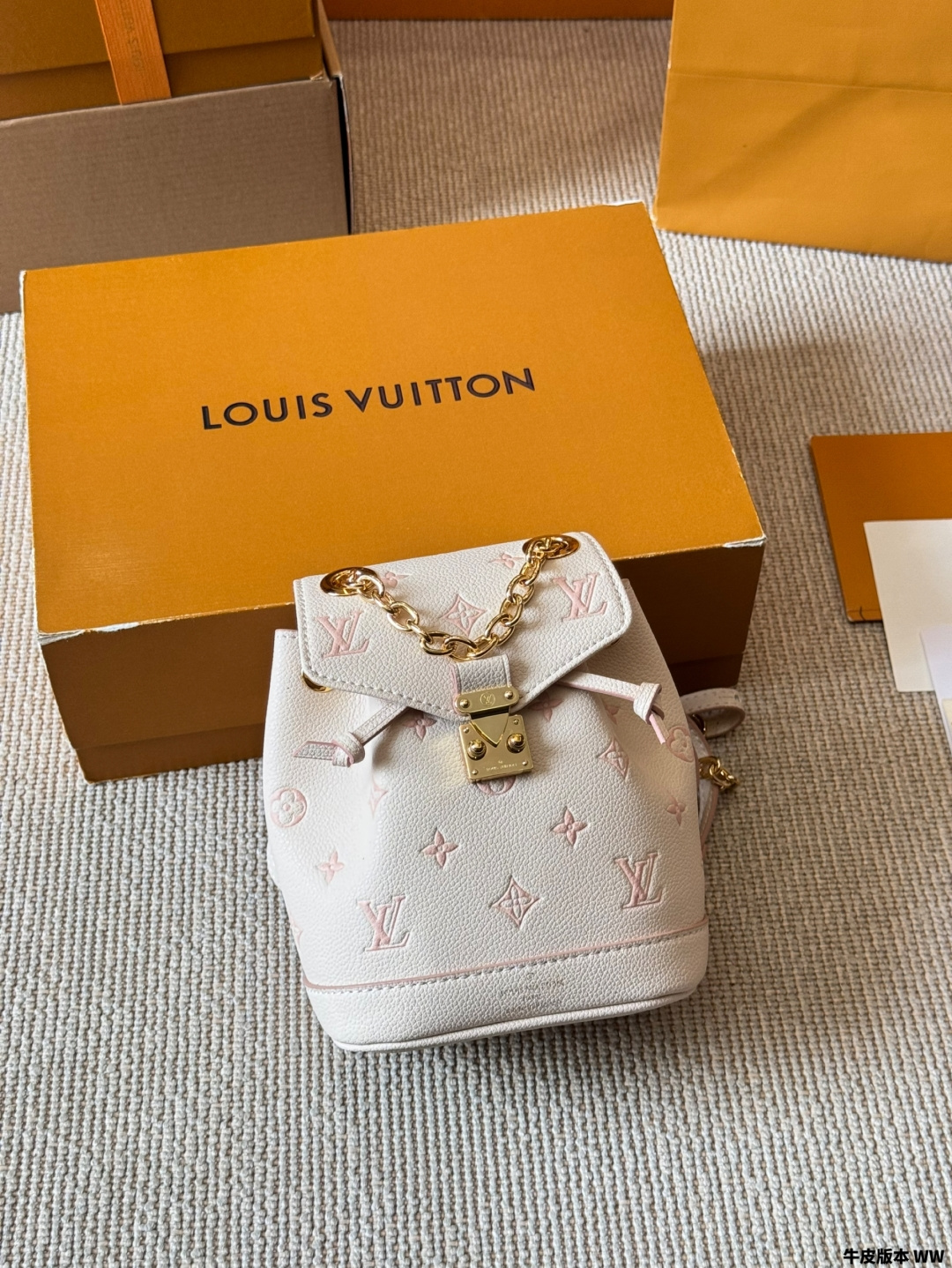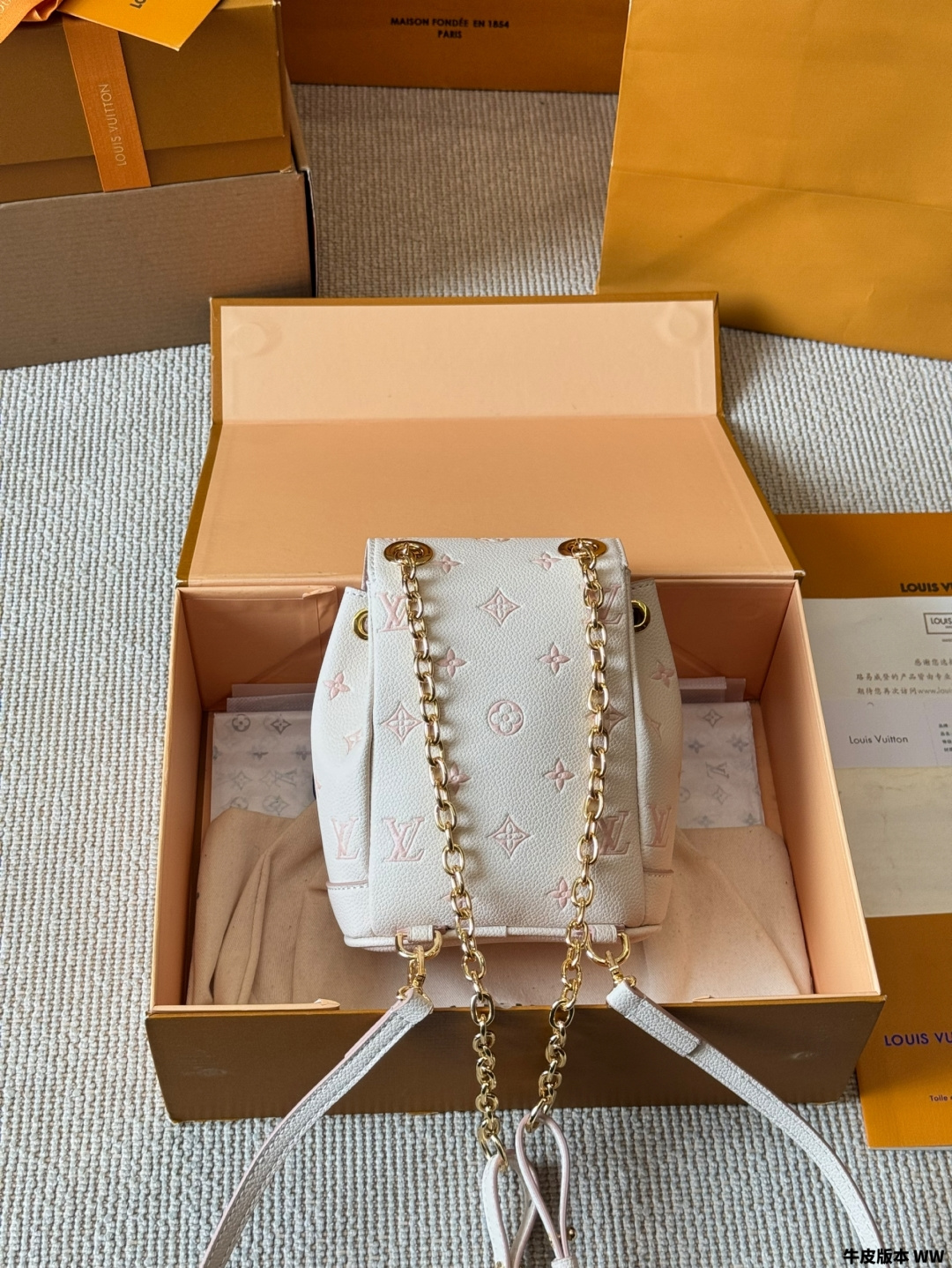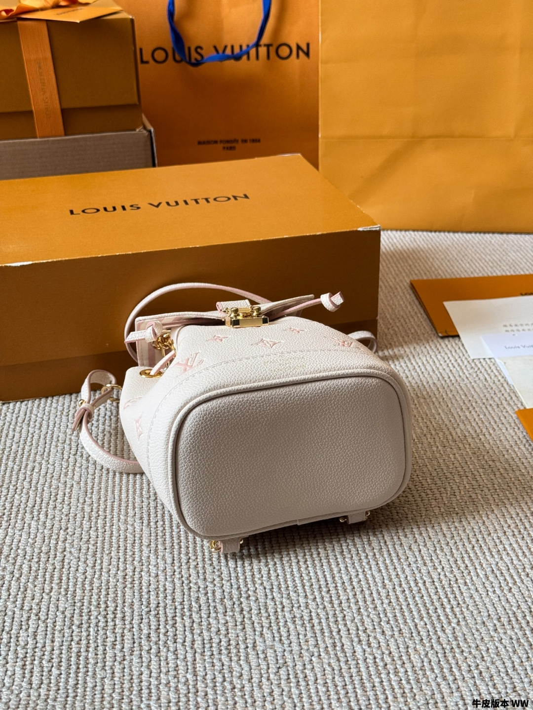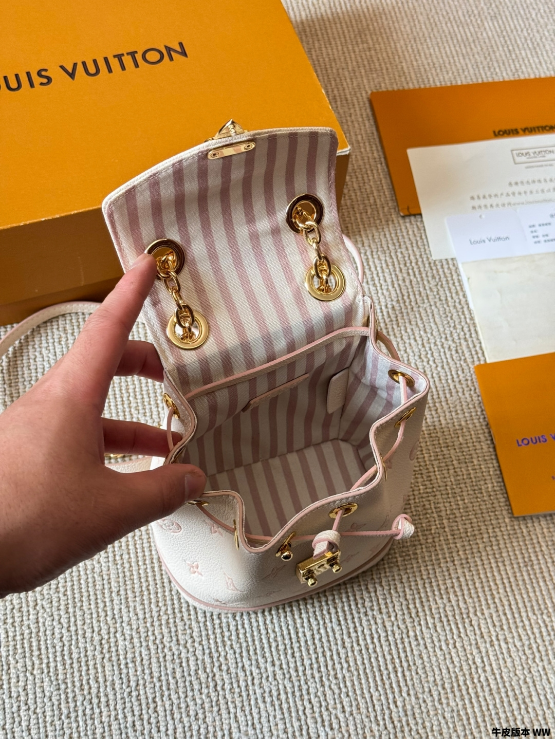 The Louis Vuitton Nano Noe Mini Backpack in cream strawberry leather. Compact, stylish, and perfect for carrying your essentials. Size: 13 x 18cm.
