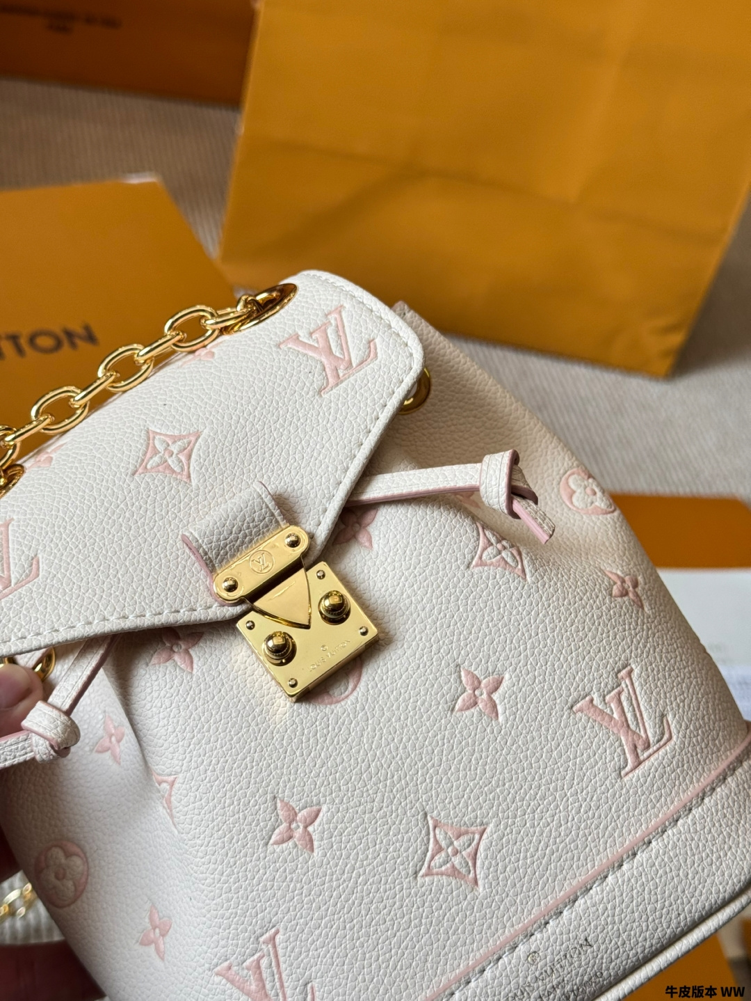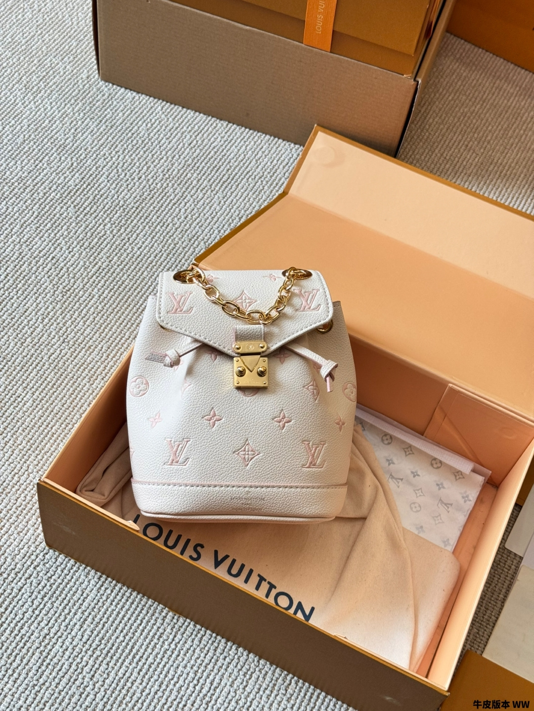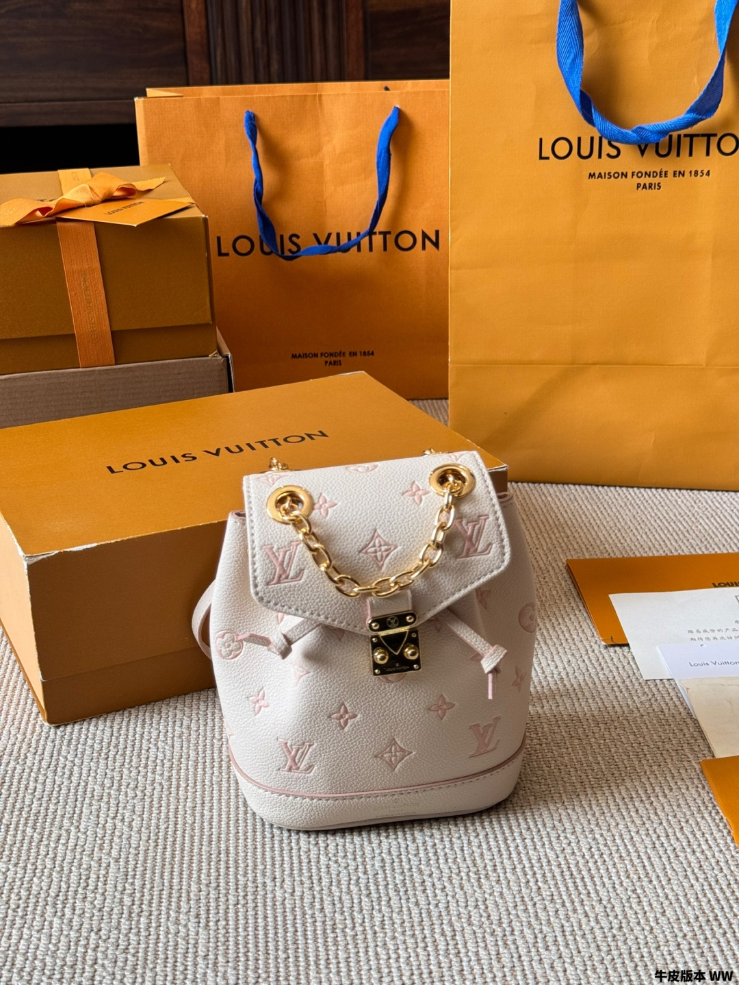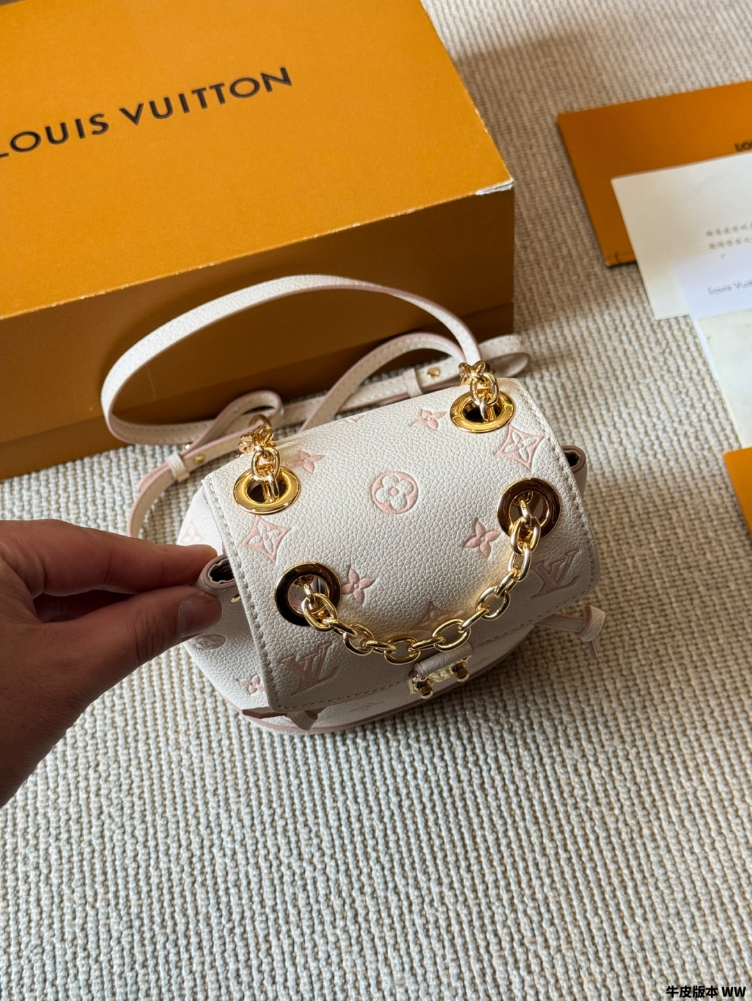 The Louis Vuitton Nano Noe Mini Backpack in cream strawberry leather. Compact, stylish, and perfect for carrying your essentials. Size: 13 x 18cm.
