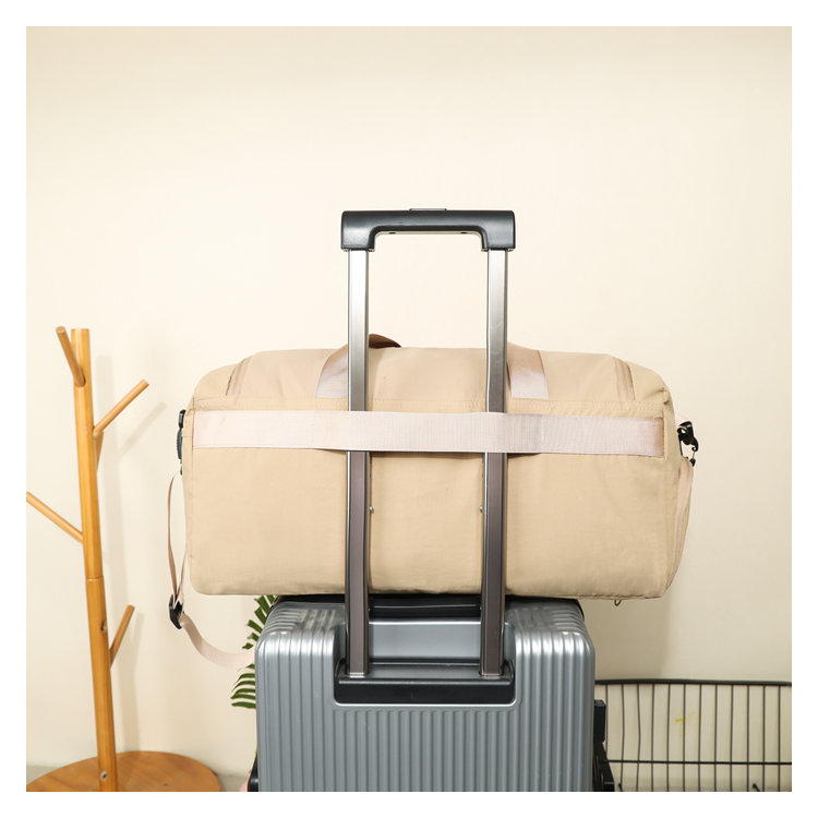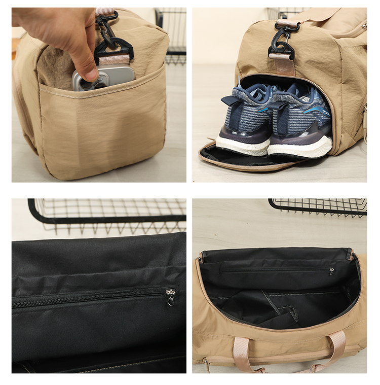 - Compartments: Main compartment, separate shoe compartment, front zipper pocket