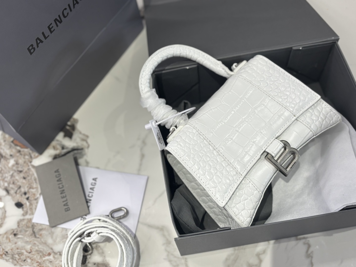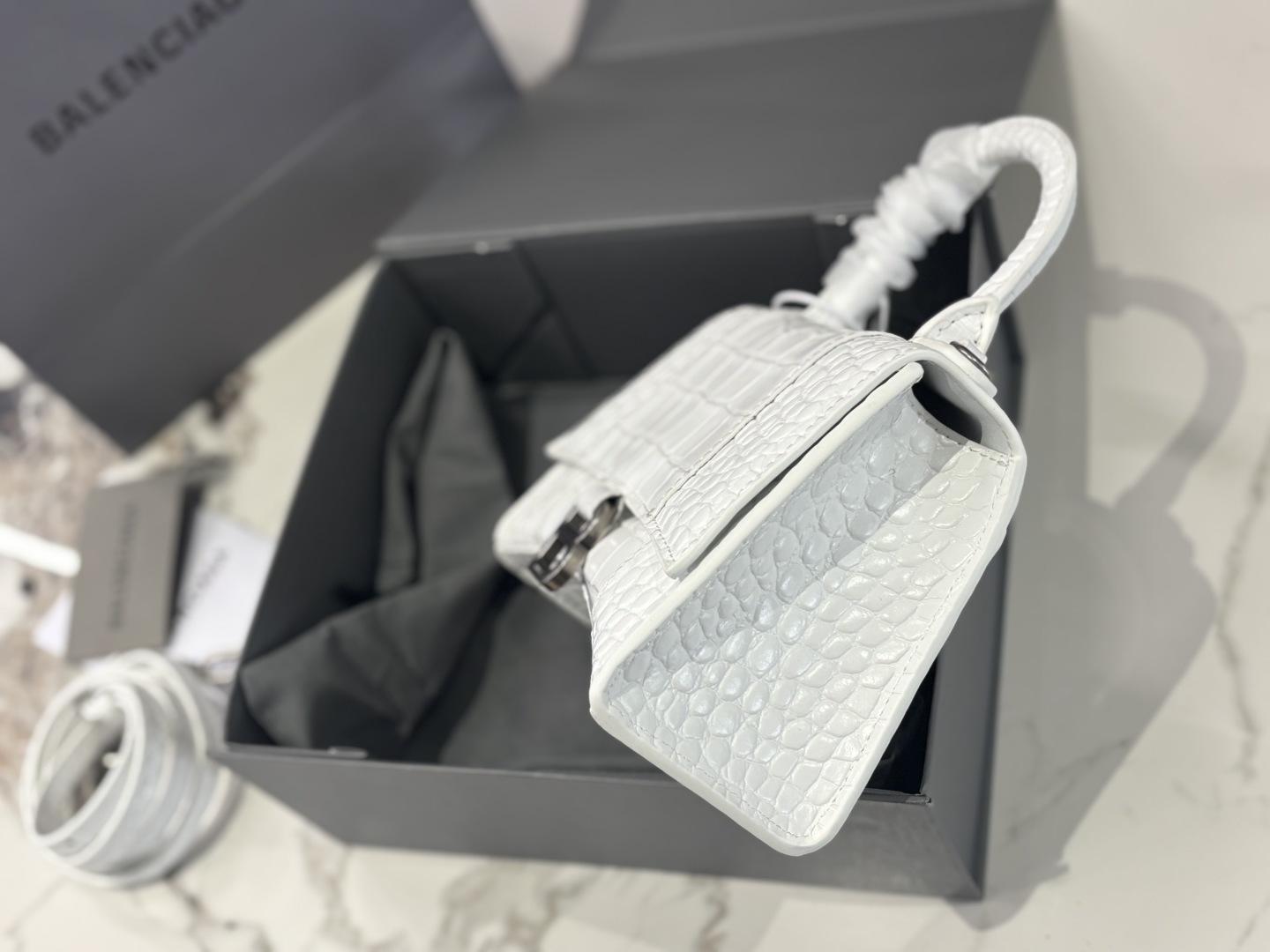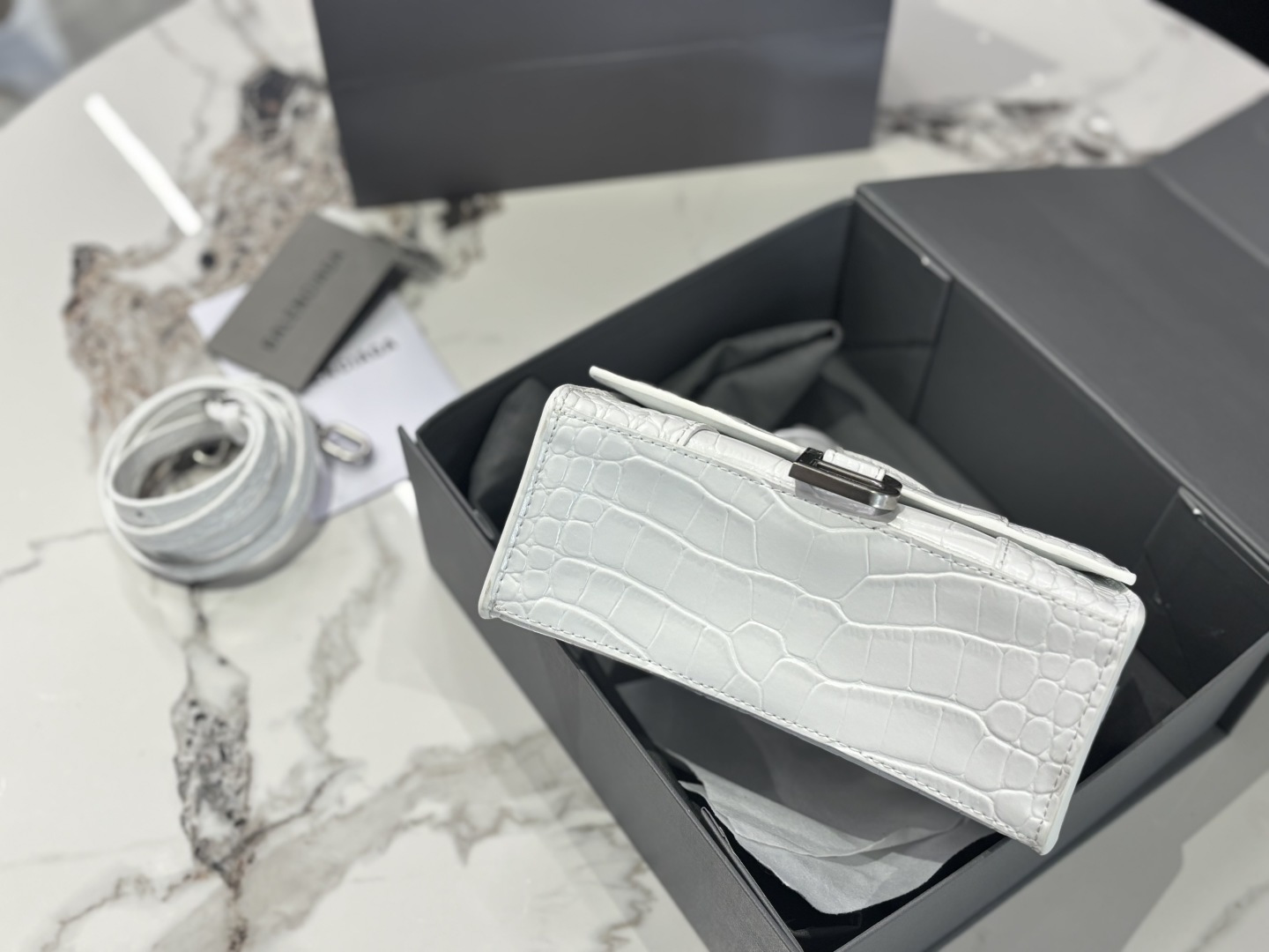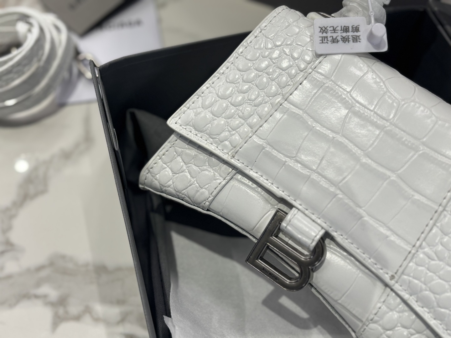 The Balenciaga Hourglass bag is an iconic piece known for its unique curved silhouette and luxurious design. This particular model features a stunning white crocodile embossed leather, making it a standout accessory for any fashion enthusiast.