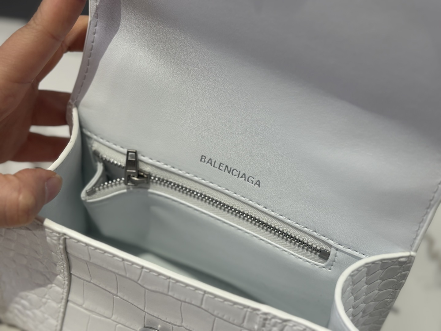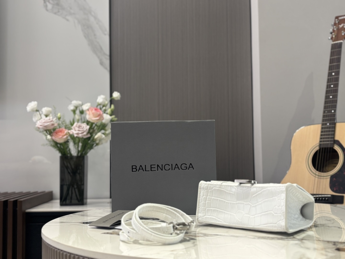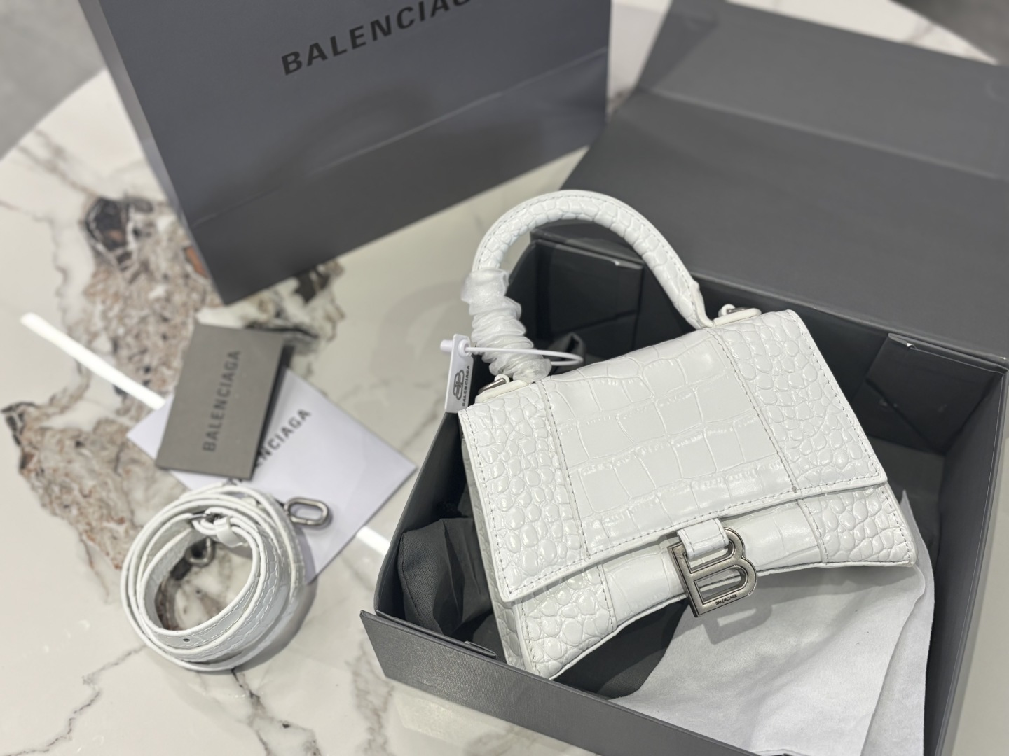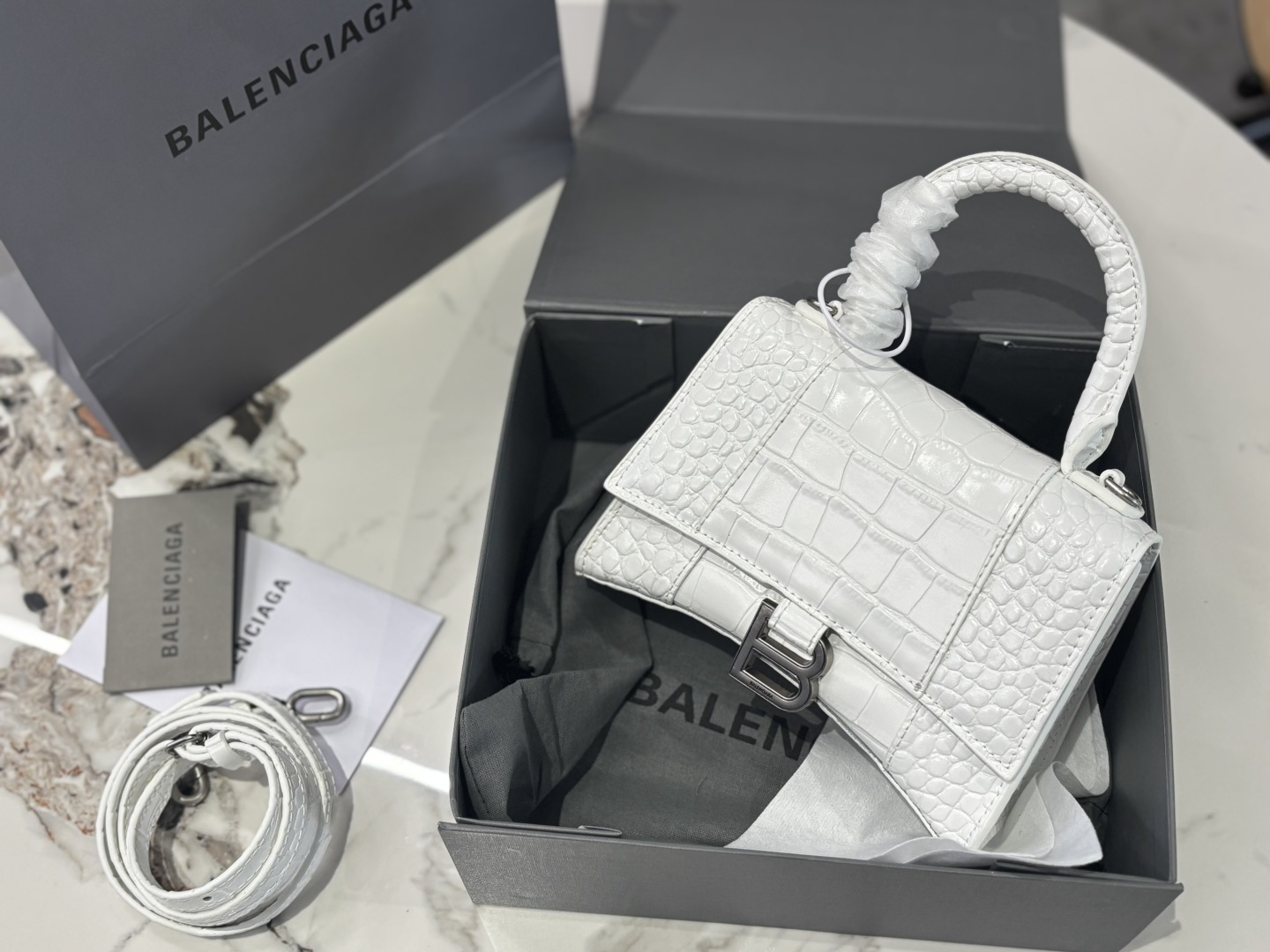 The Balenciaga Hourglass bag is an iconic piece known for its unique curved silhouette and luxurious design. This particular model features a stunning white crocodile embossed leather, making it a standout accessory for any fashion enthusiast.