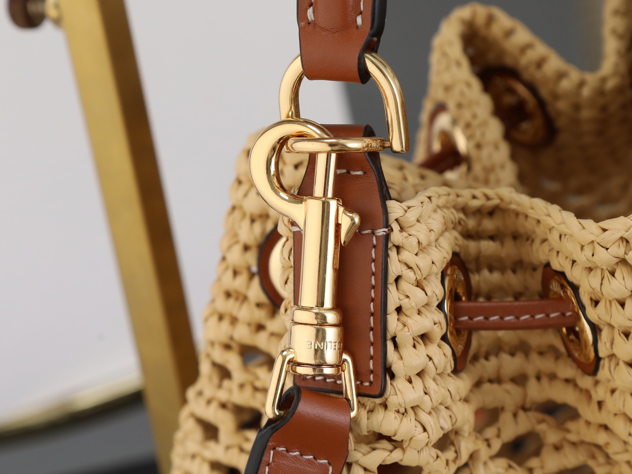 Elevate your style with the Celine Clara basket bag. Crafted from raffia and calfskin, featuring a drawstring closure and adjustable strap.