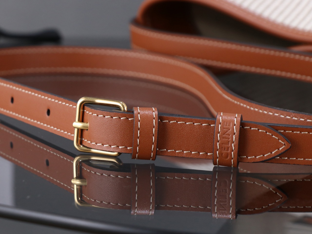 Elevate your style with the Celine Triomphe small bucket bag, crafted in calfskin and linen with adjustable leather strap.