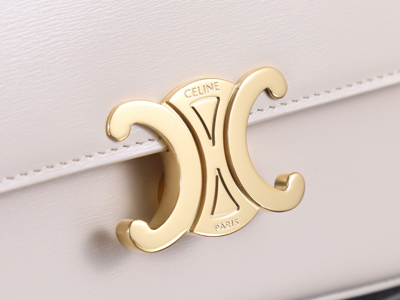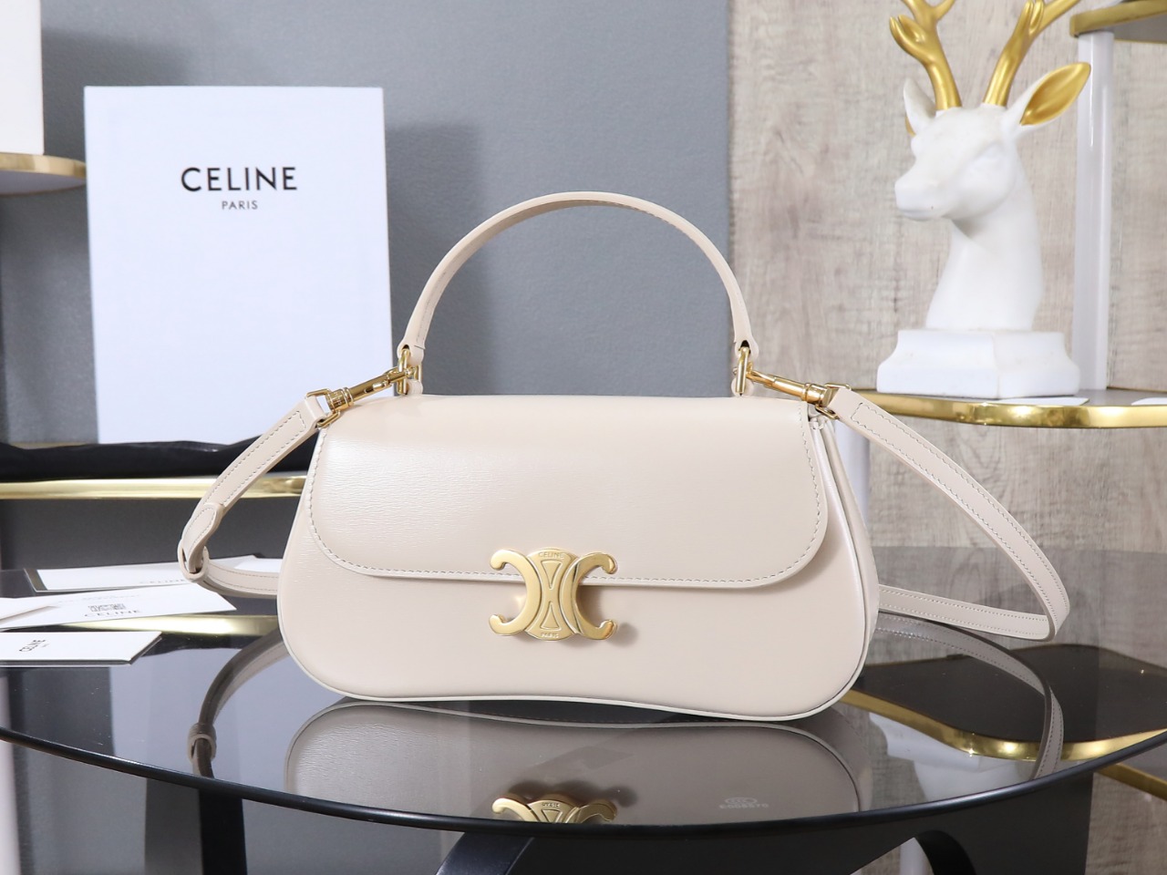 The CELINE Lola bag is crafted from glossy calfskin with a lambskin lining, featuring a Triomphe snap closure, and both a handle and adjustable, removable strap.