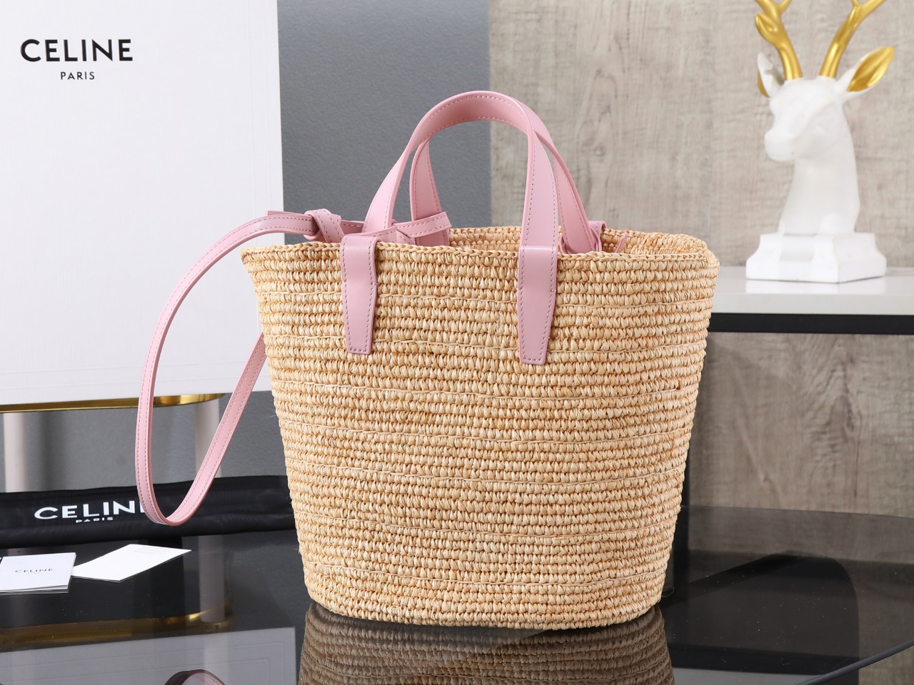 Elevate your style with the Celine Teen basket bag. Handwoven raffia with calfskin accents. Includes removable pouch. Perfect for summer!