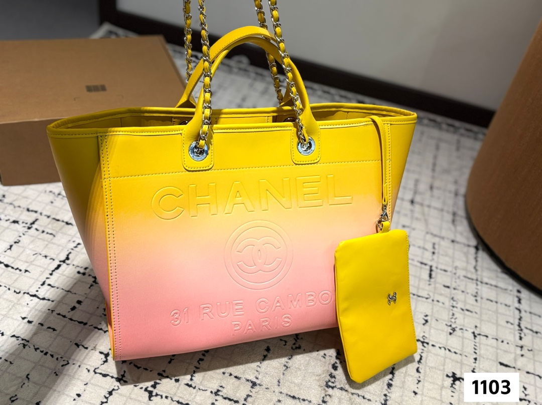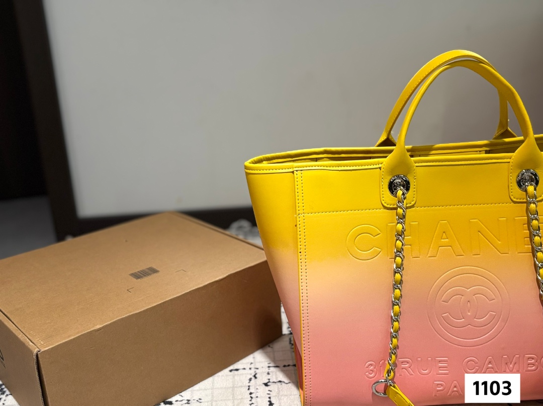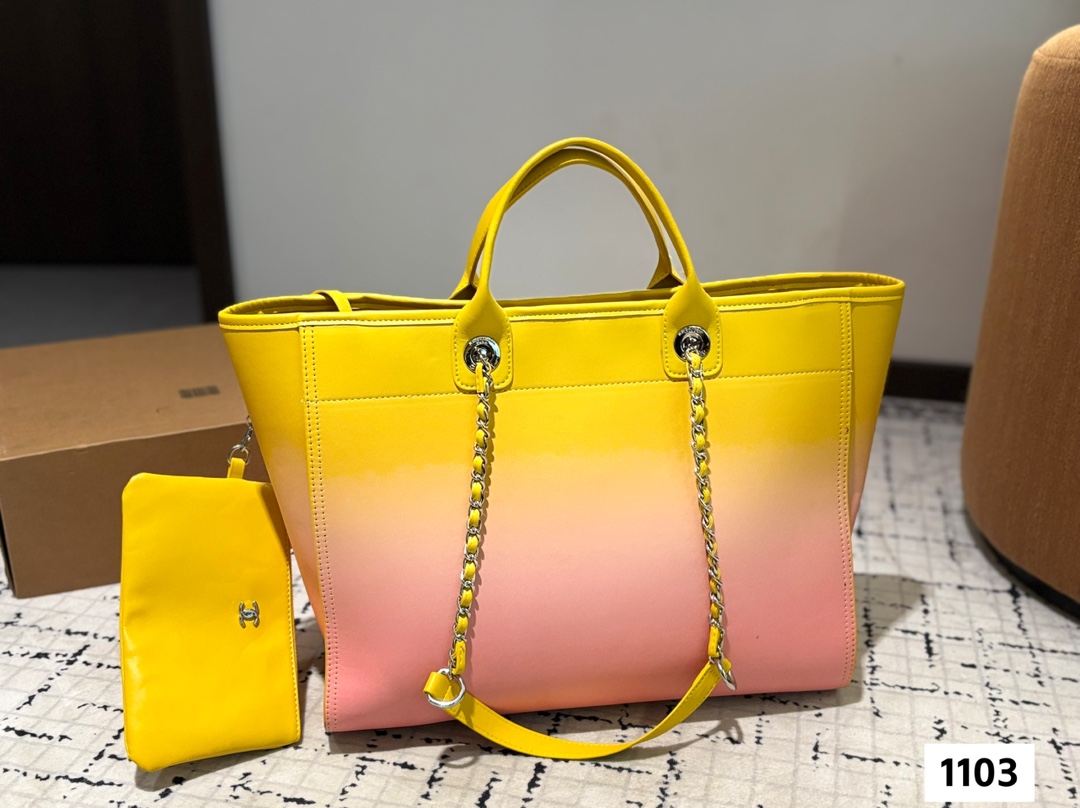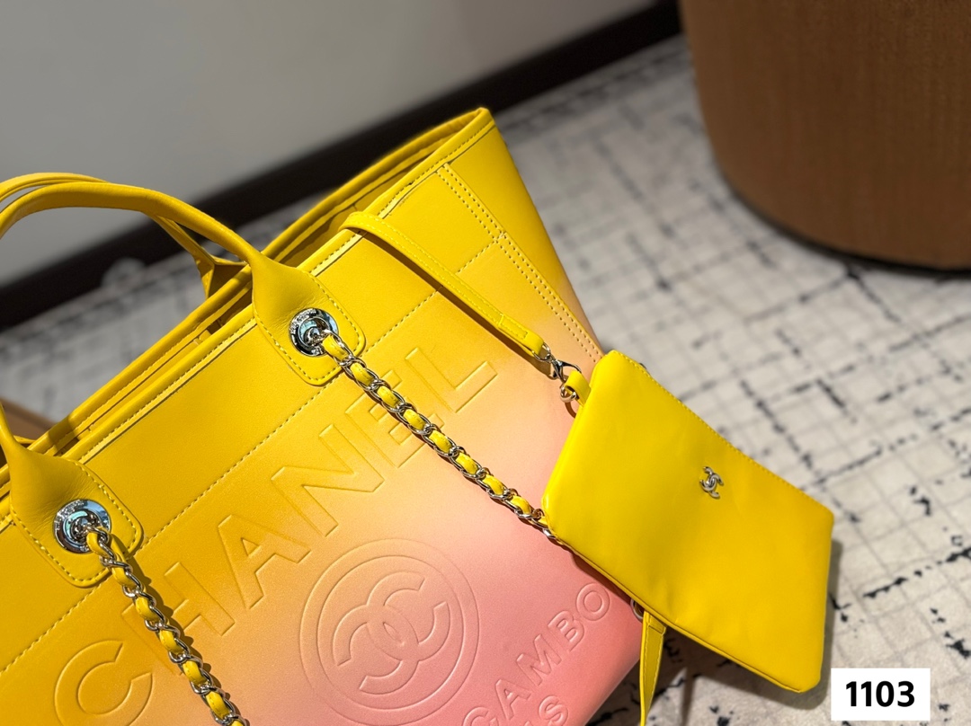 Elevate your summer style with this Chanel beach bag. Crafted from leather, it features a gradient design and chain detailing. Spacious and chic for everyday or travel.