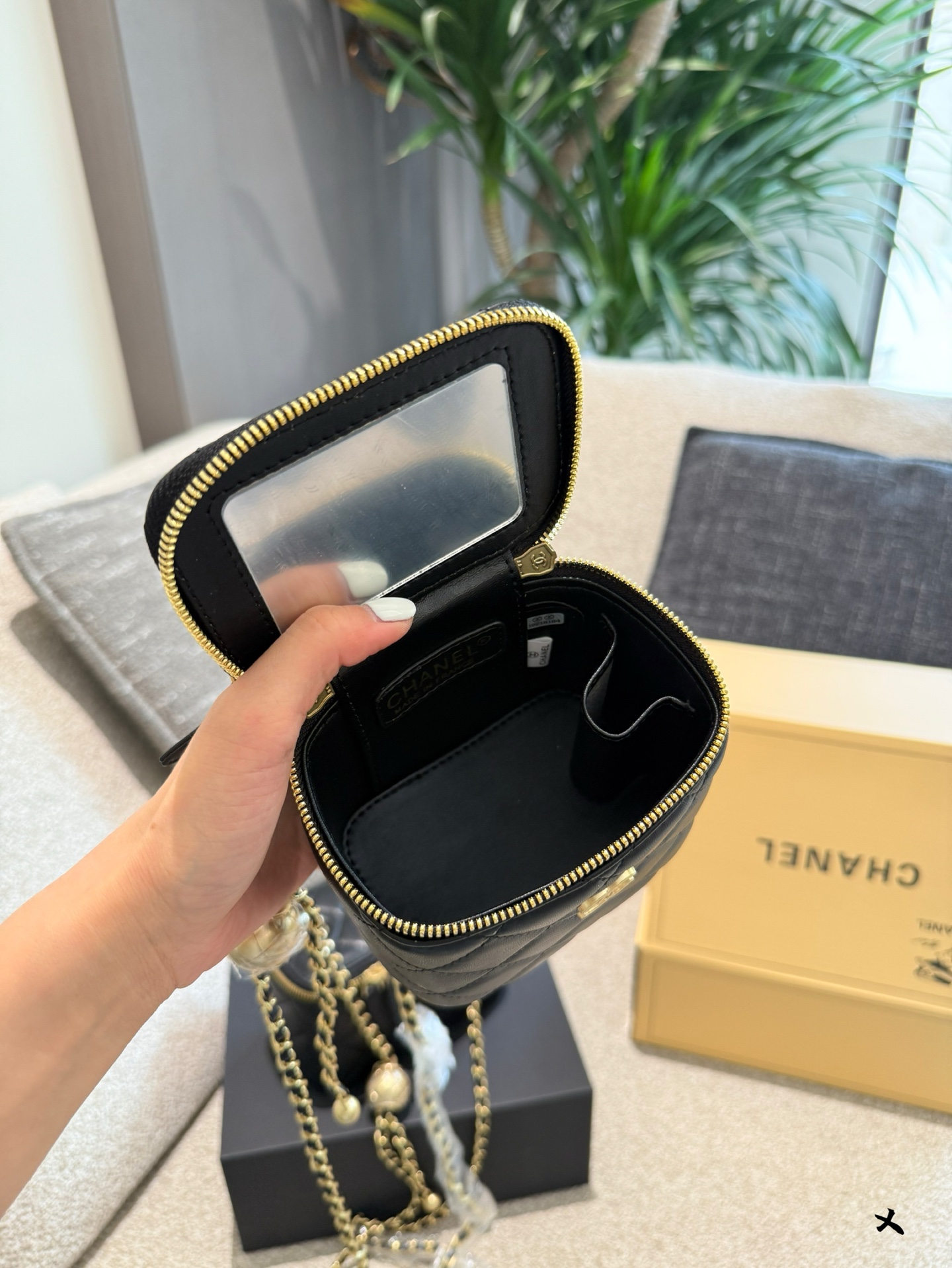 This Chanel vanity case offers a harmonious blend of classic design and contemporary details, making it a must-have for fashion enthusiasts. Its exquisite craftsmanship and timeless appeal ensure that it will remain a cherished piece for years to come. Elevate your style with this iconic accessory that exudes sophistication and elegance.