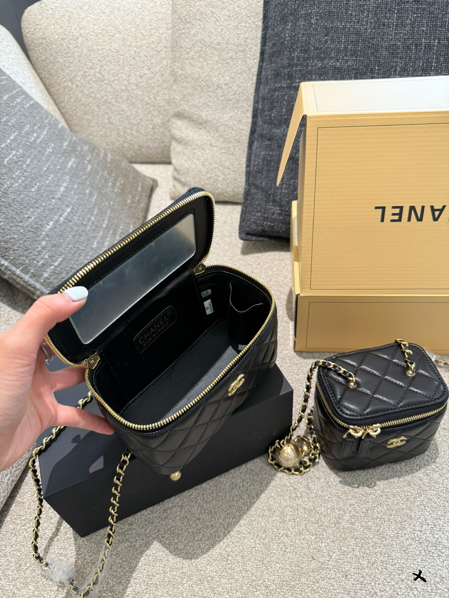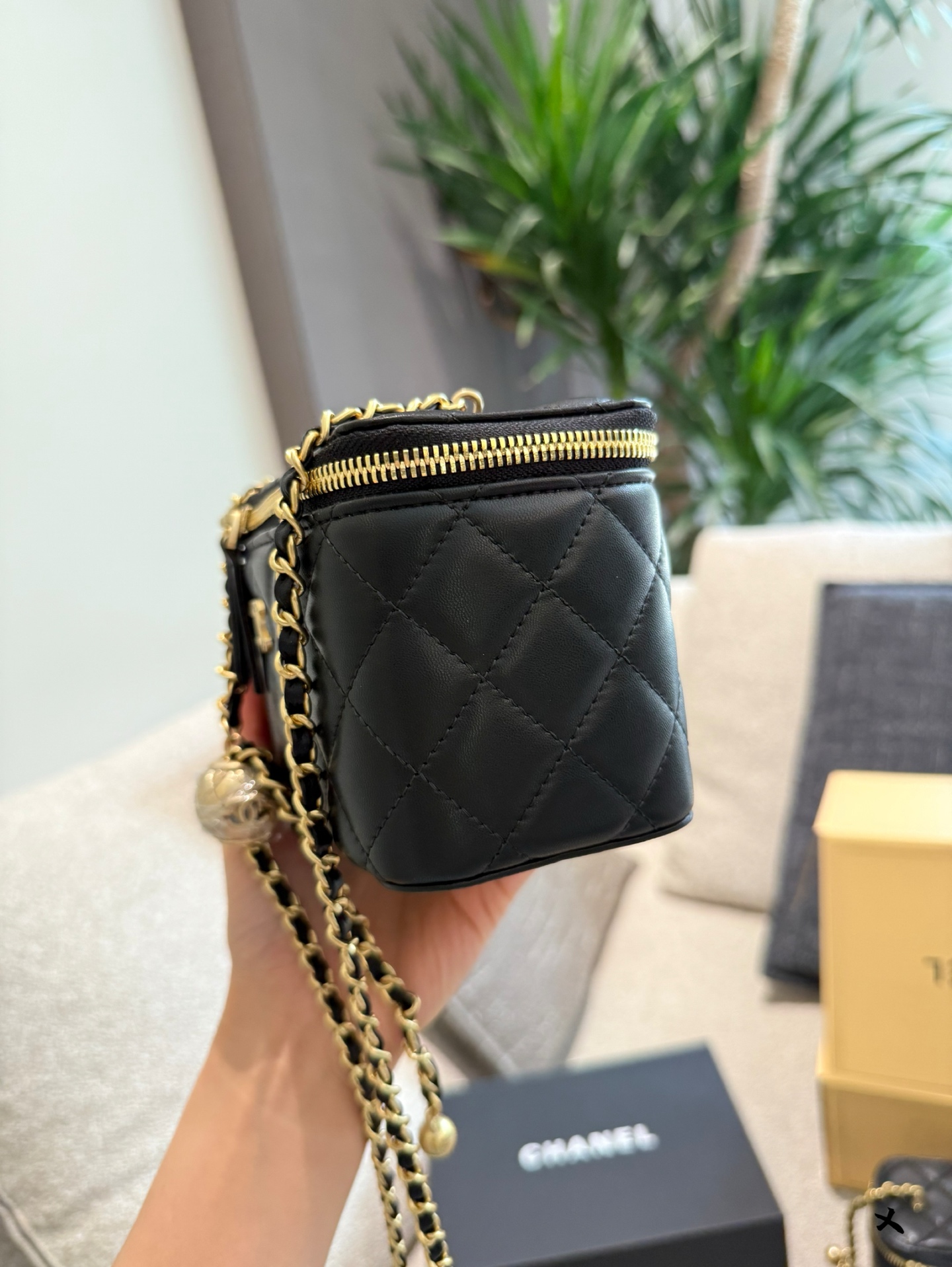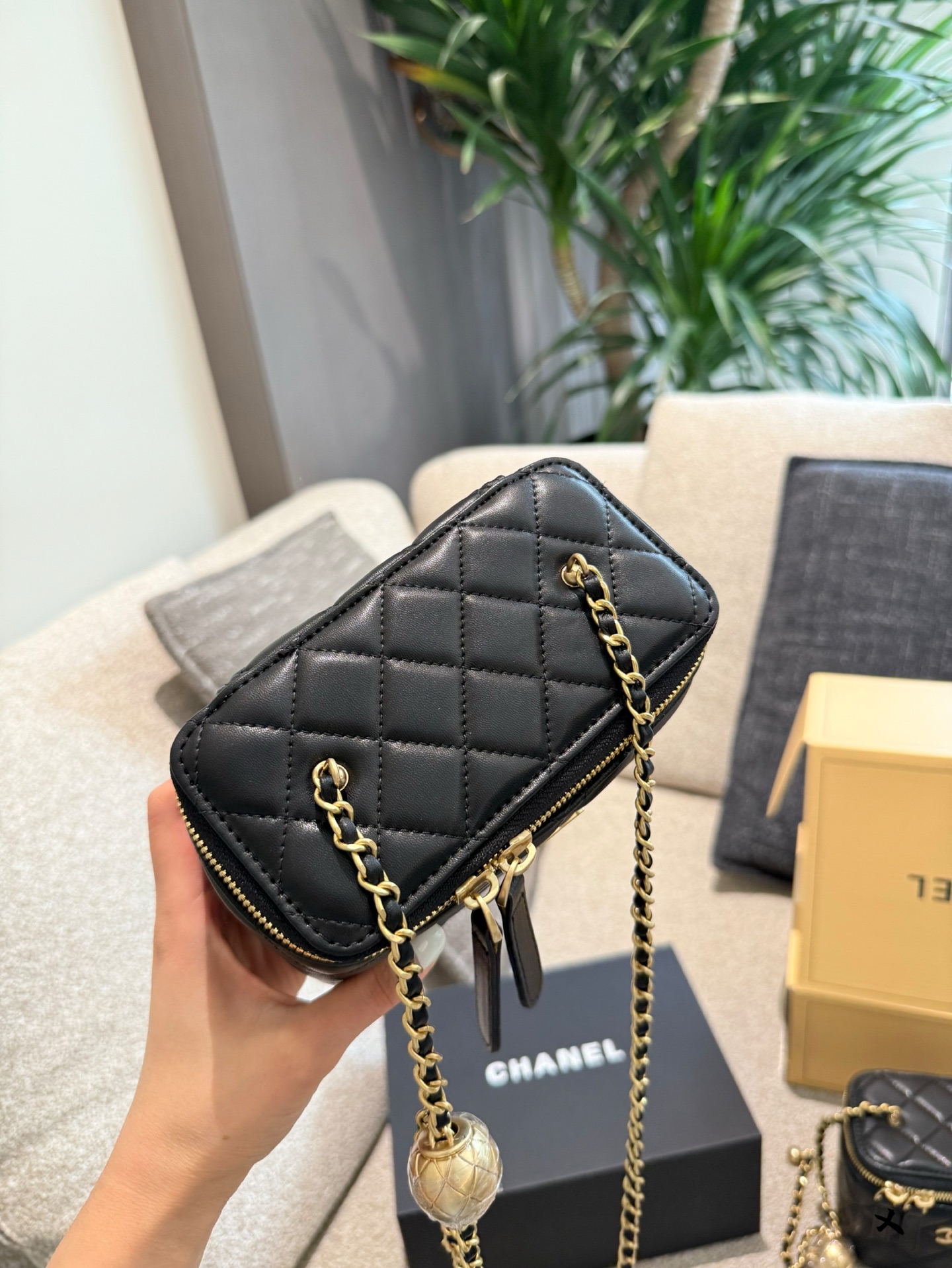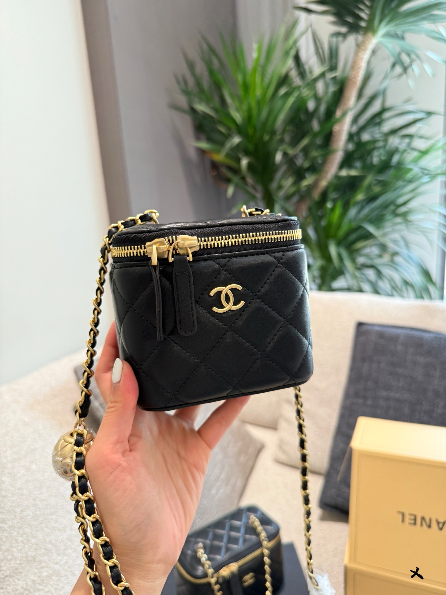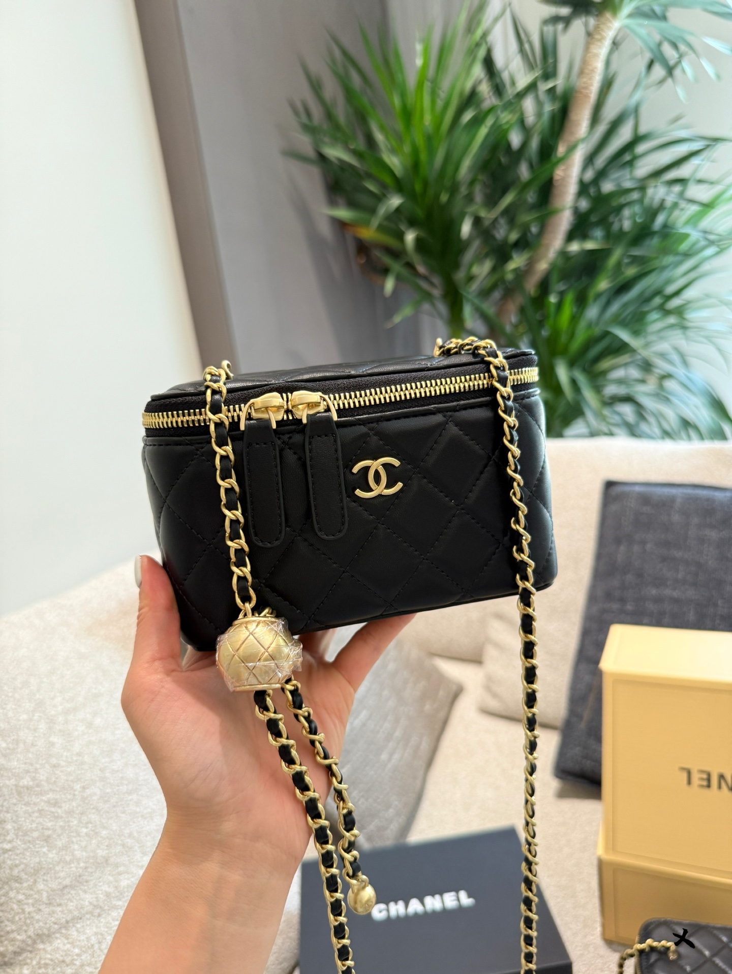 Chanel Black Quilted Leather Vanity Case with Gold-Tone Metal & Golden Ball