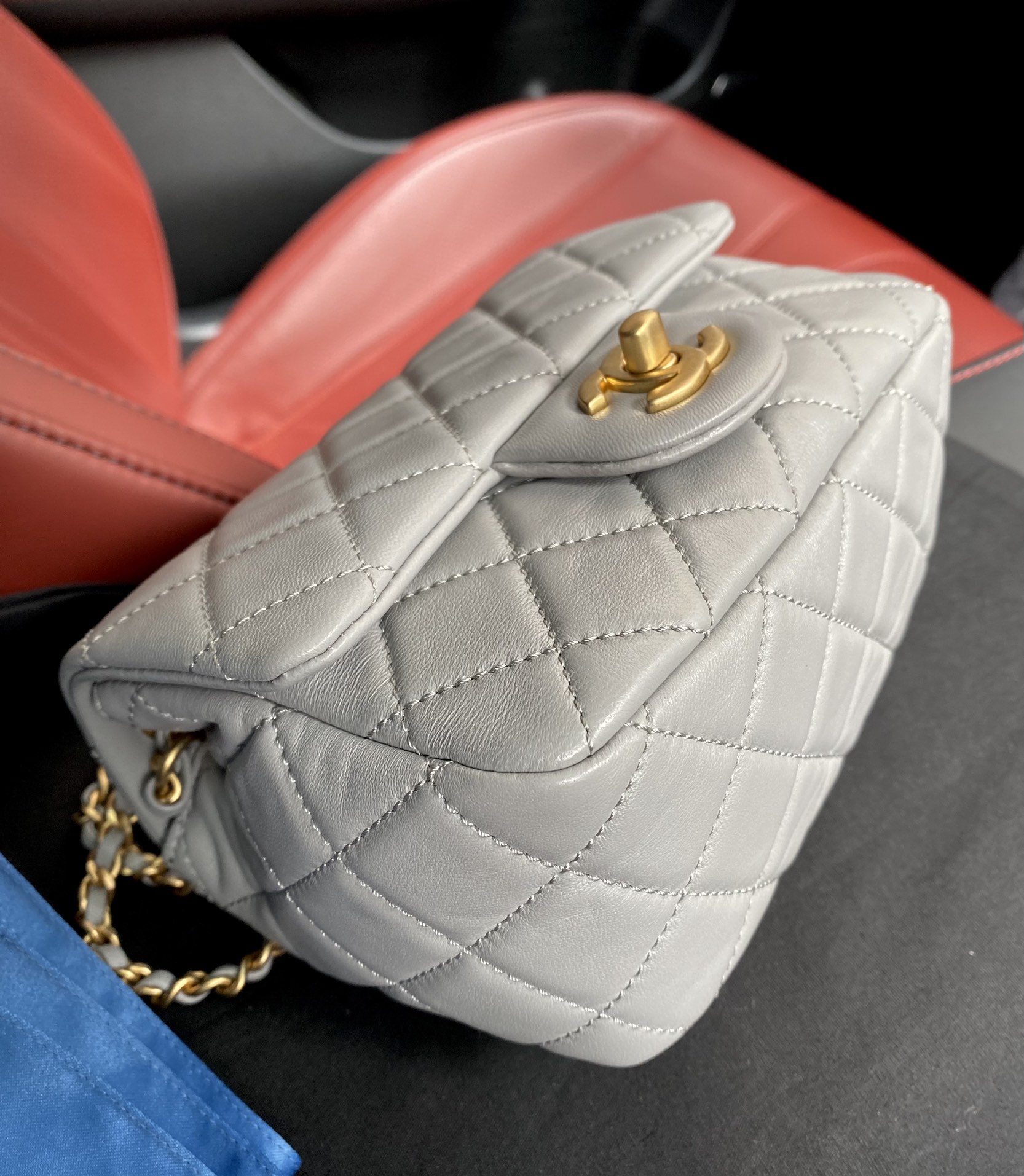 Classic Chanel Flap Bag with a twist! Light grey, original lambskin, adjustable golden ball chain. A rare and stylish find. Size: 13*18*7cm