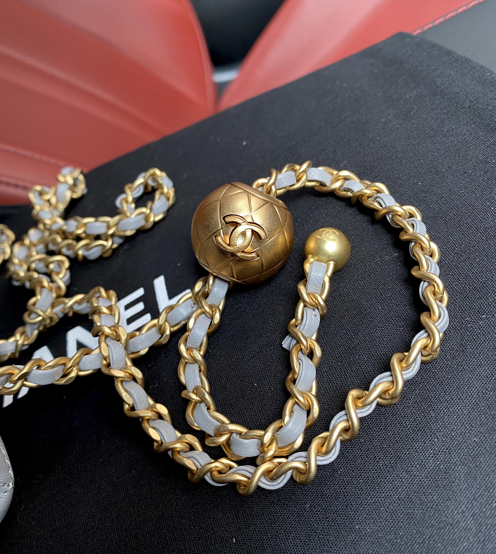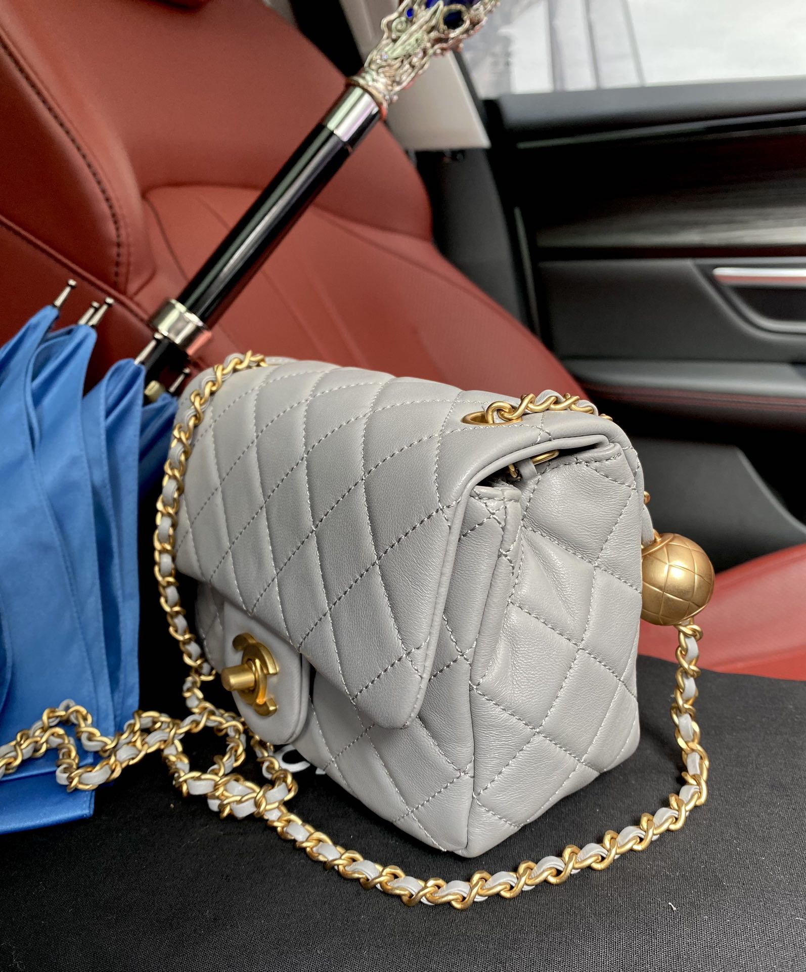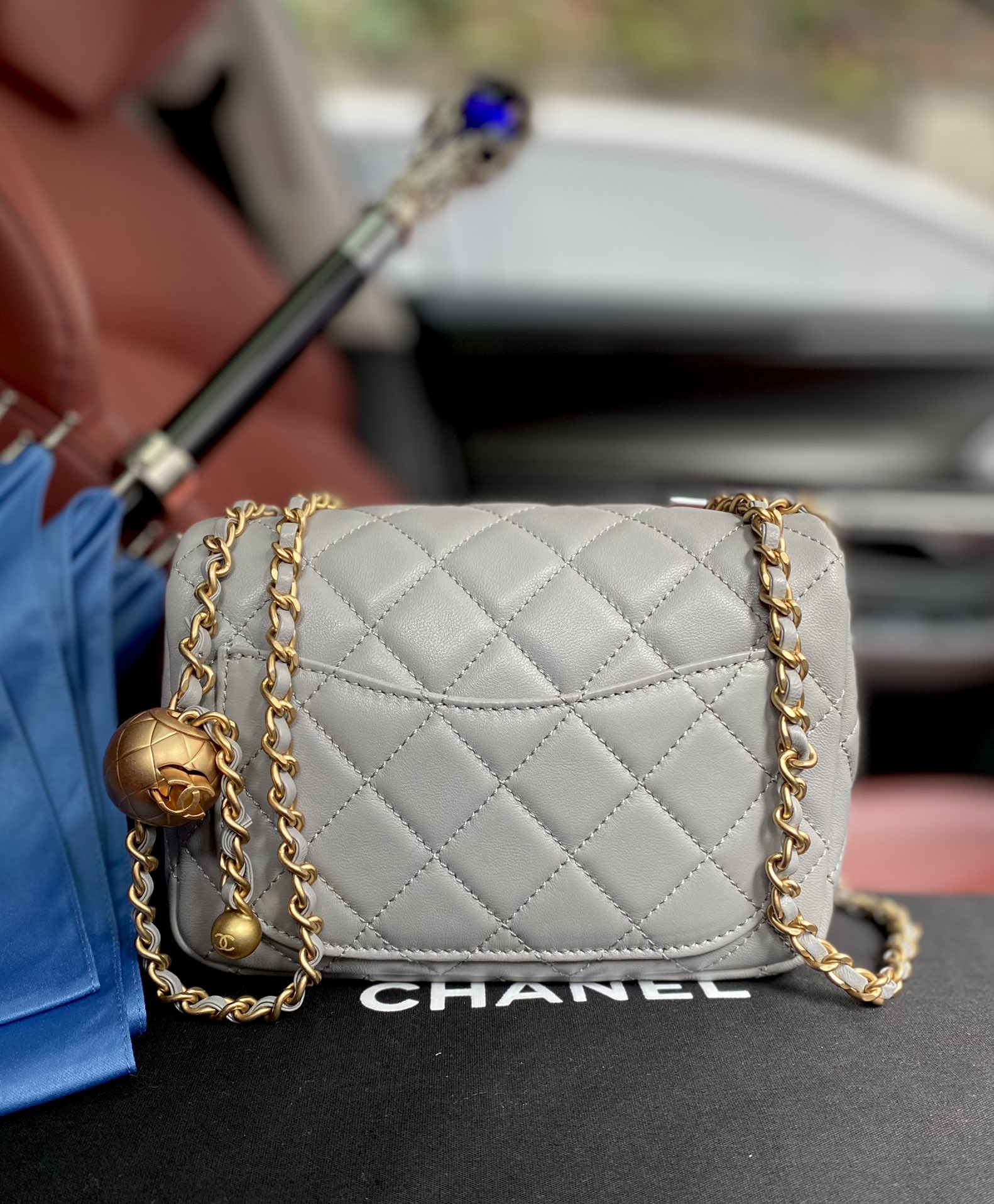 Chanel CF Small Golden Ball Flap Bag, Light Grey Leather, Adjustable Chain
