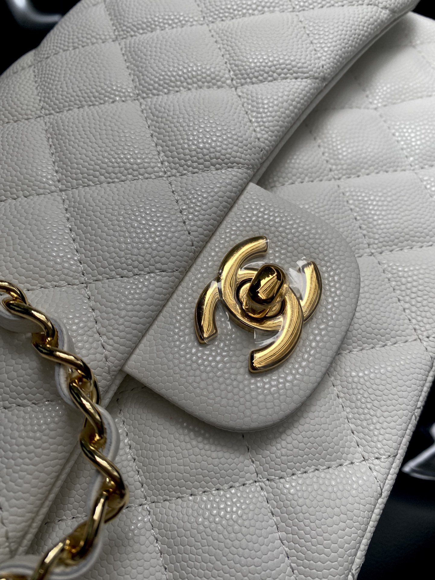 Elegant Chanel Classic CF1112 shoulder bag in white caviar leather with 24K gold hardware. Perfect for any occasion, offering timeless style and sophistication.