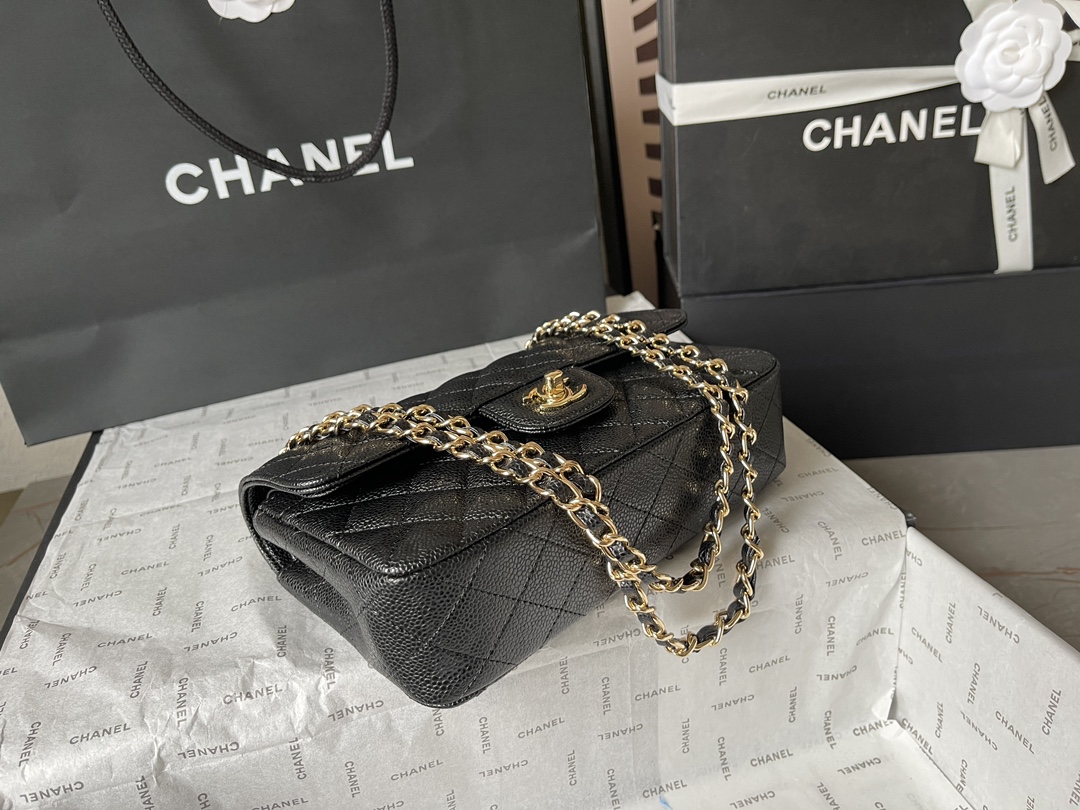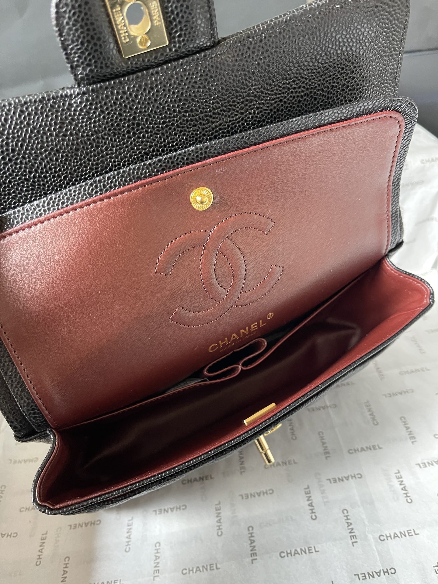 Experience timeless elegance with this Chanel Classic Flap bag. Crafted with caviar leather and gold hardware, this medium-sized bag is a must-have.