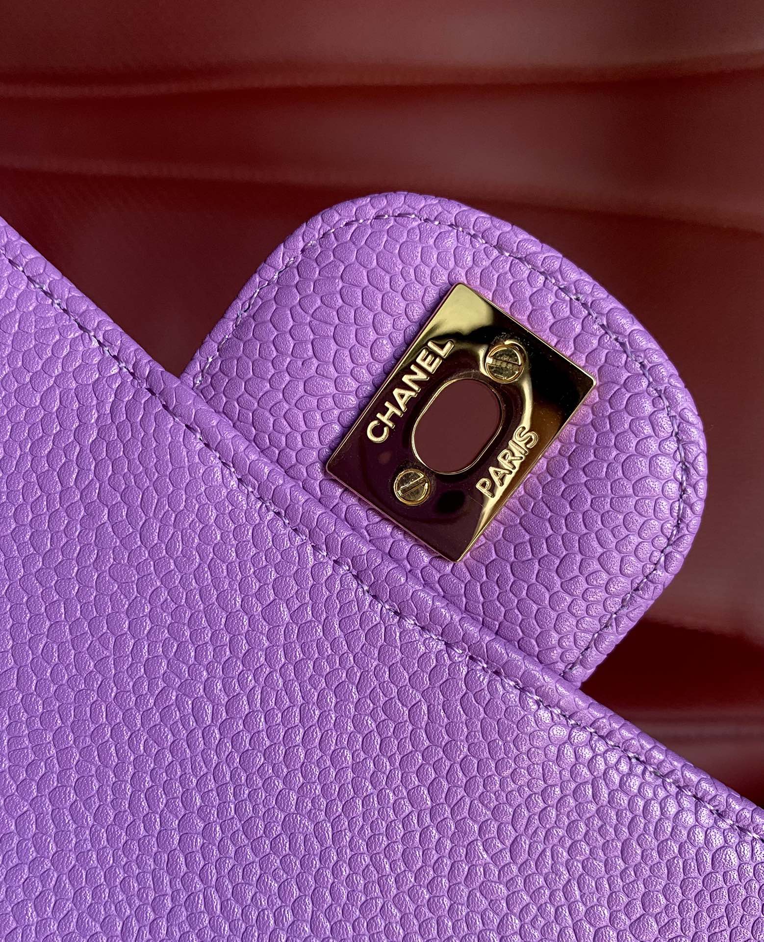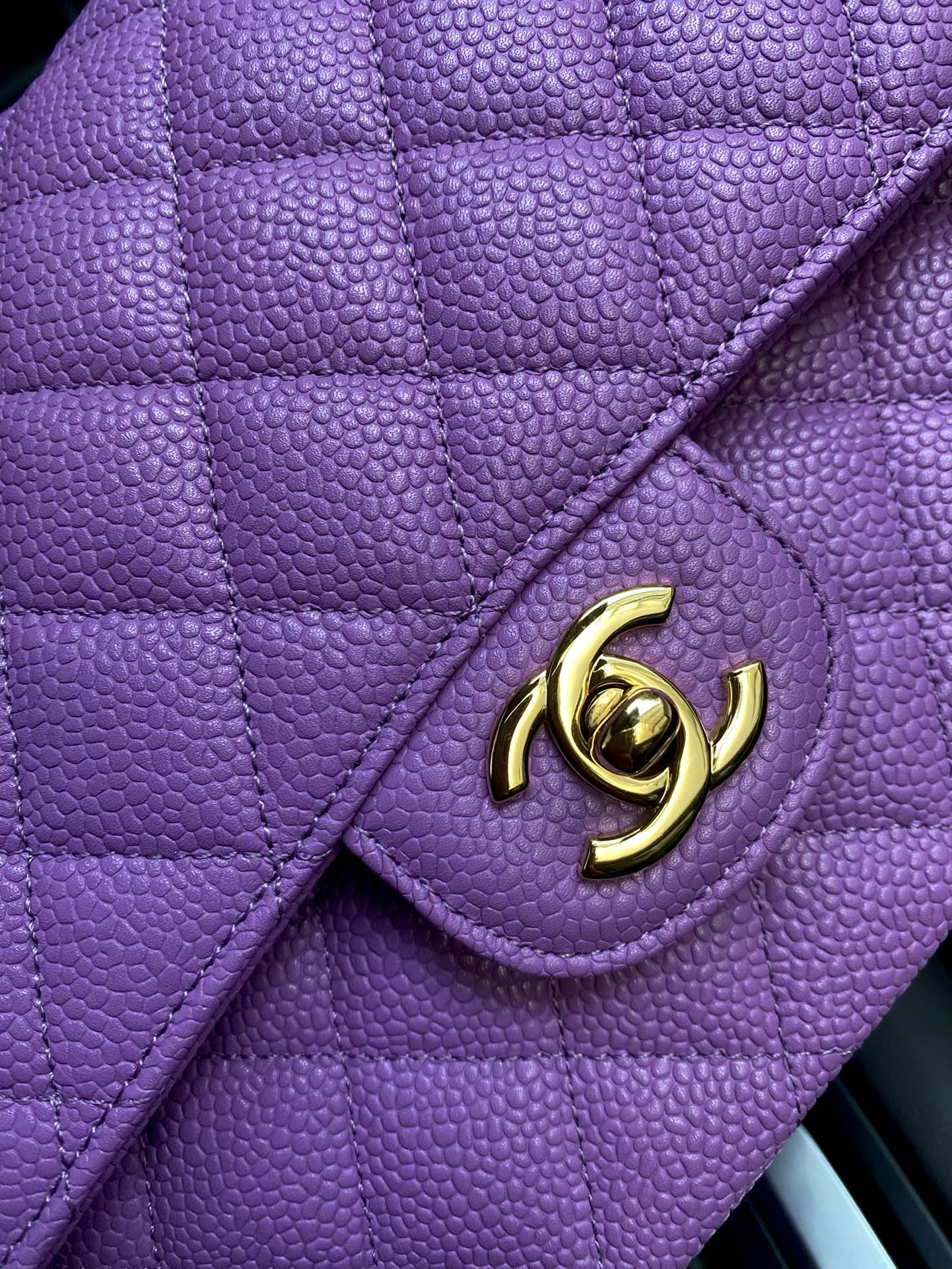 Elevate your style with this Chanel Classic Flap bag. Crafted in purple caviar leather with gold hardware. Perfect for any occasion.