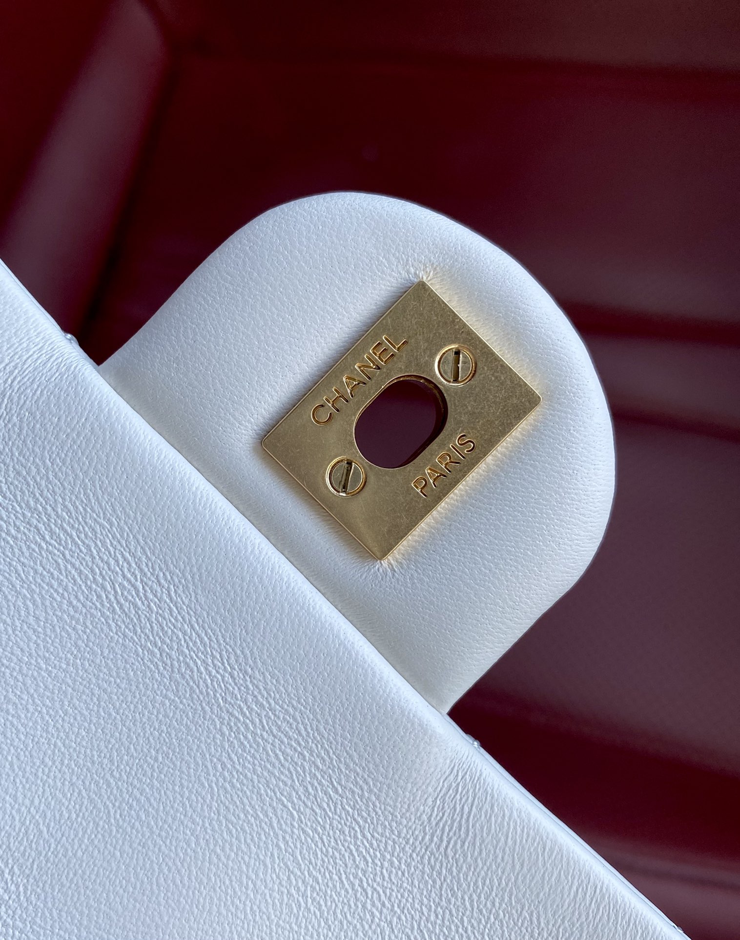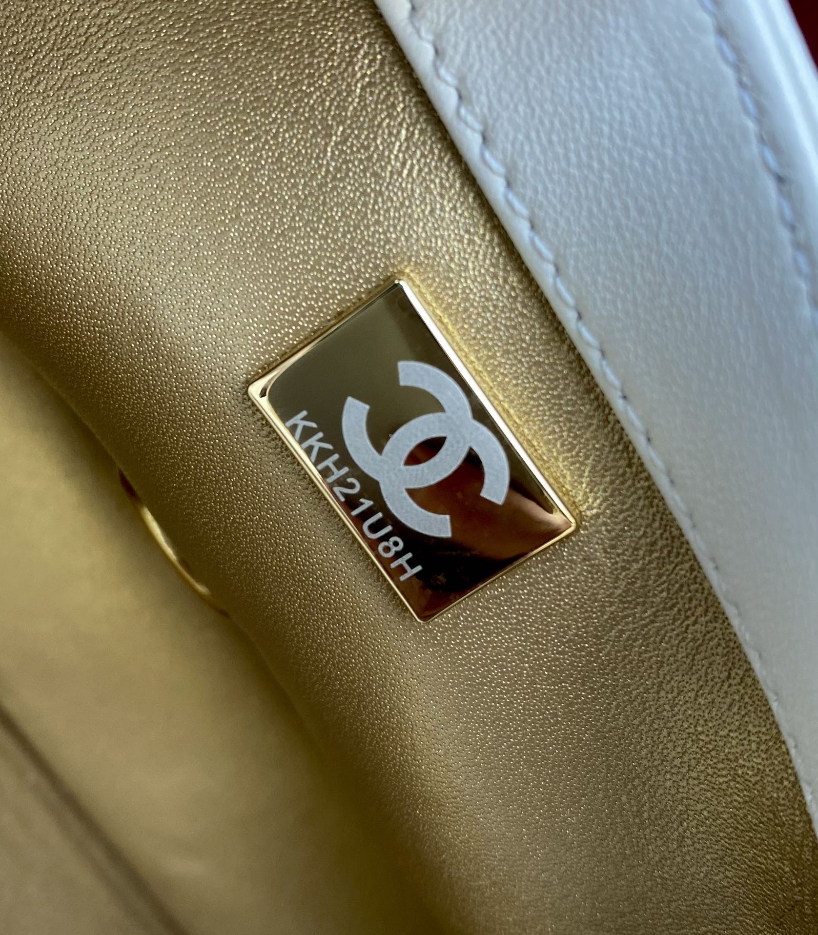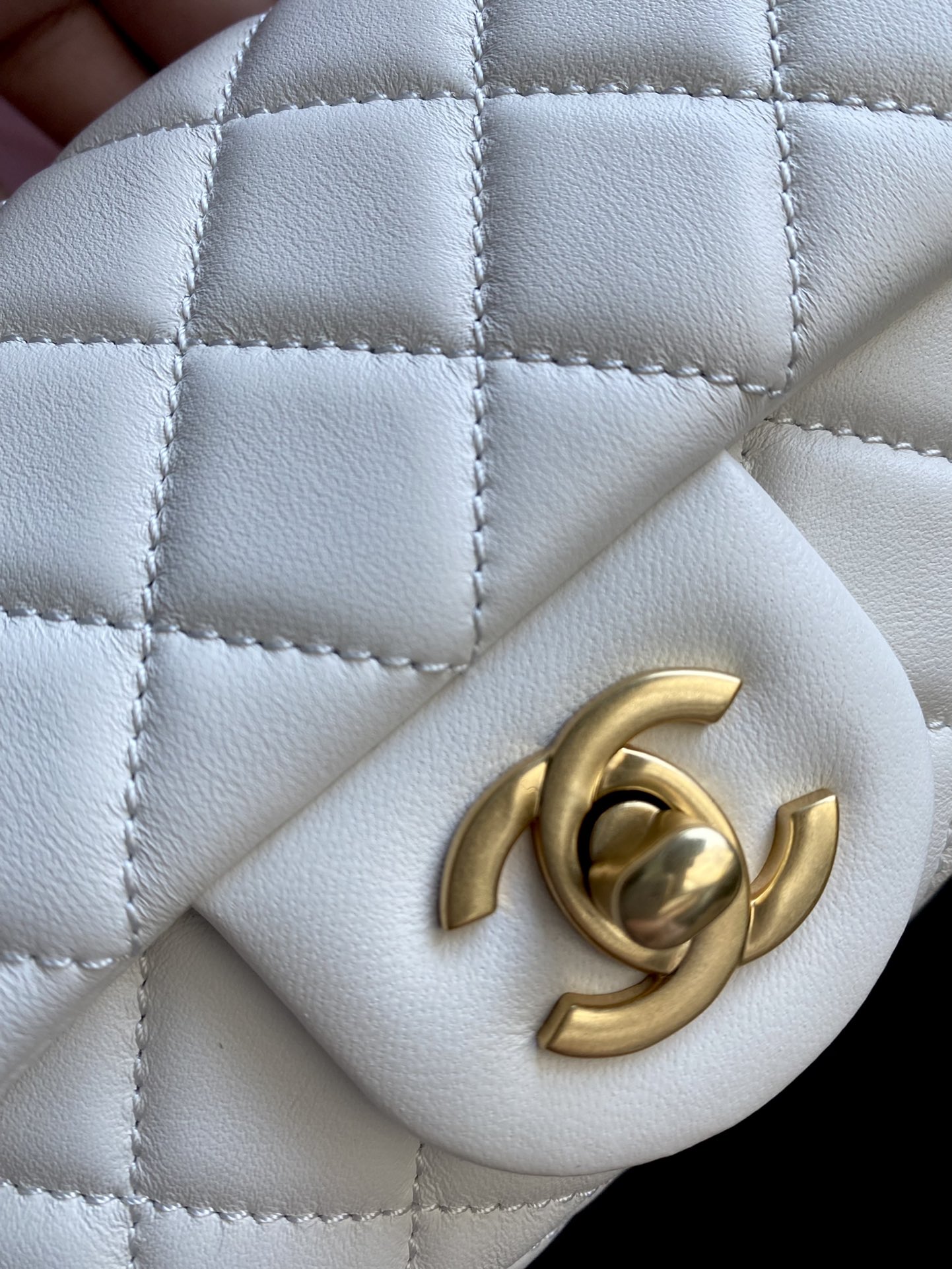 Elegant Chanel Classic Flap bag in white lambskin with adjustable golden ball. Original mold, steel stamp chip version, scannable for website entry.