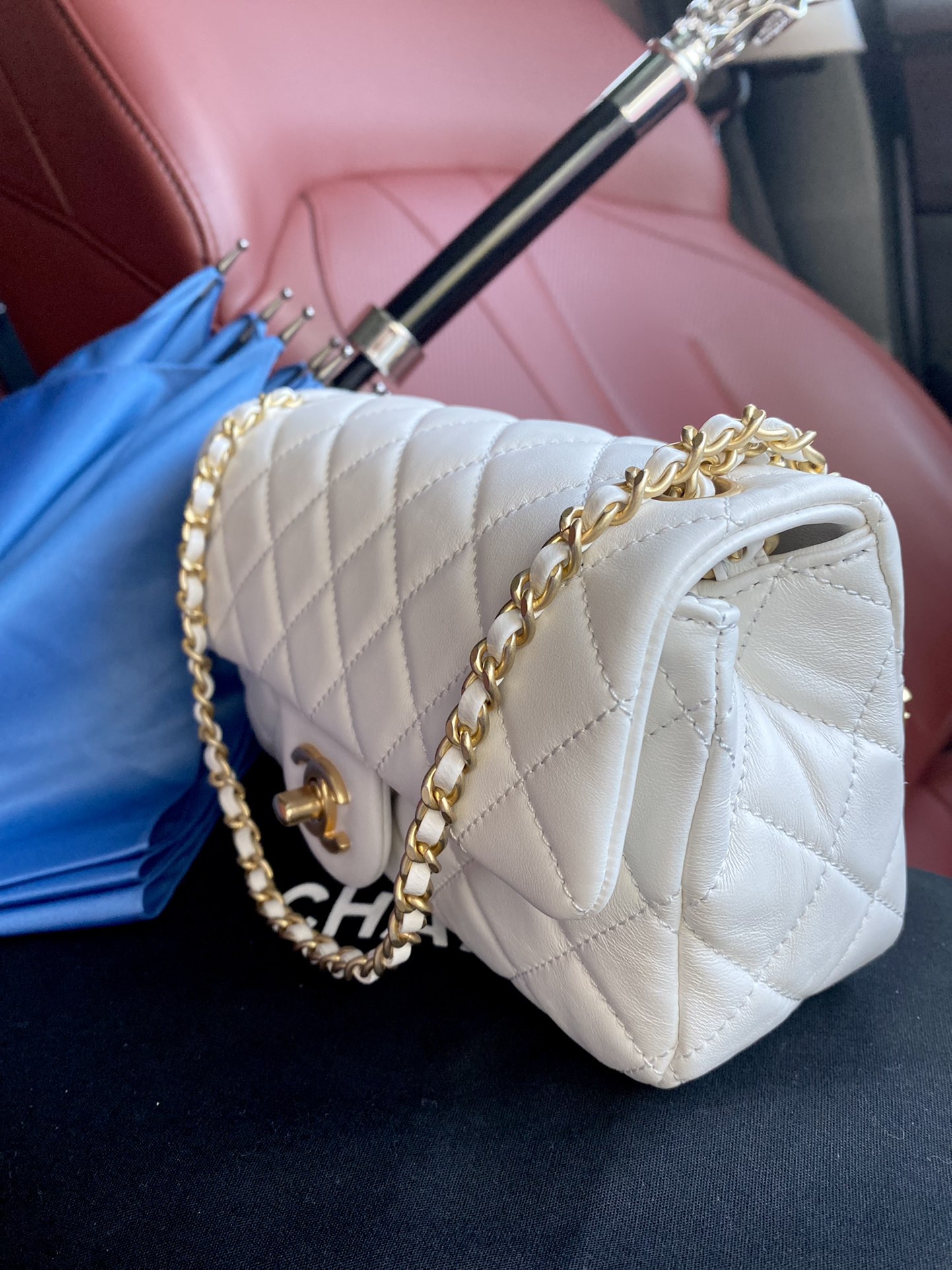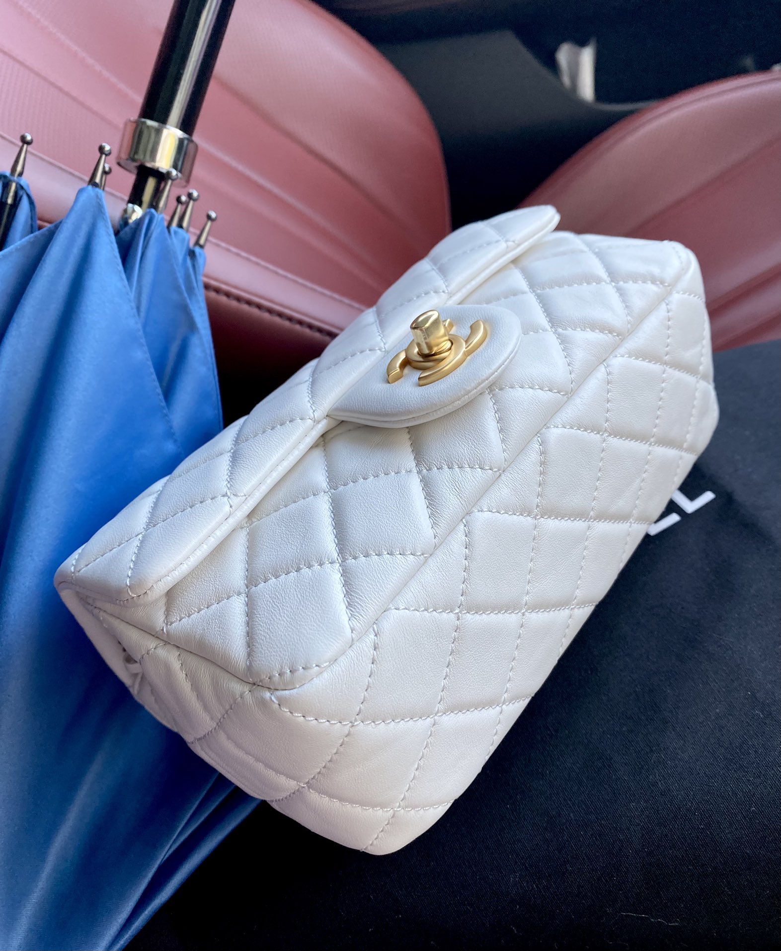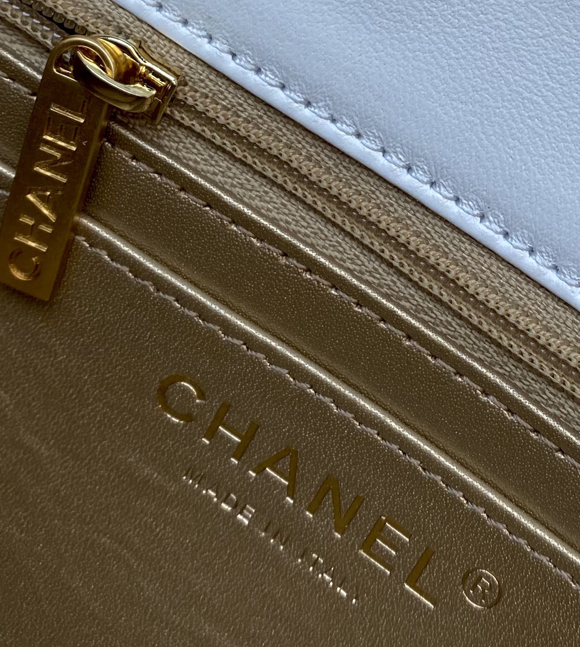 Elegant Chanel Classic Flap bag in white lambskin with adjustable golden ball. Original mold, steel stamp chip version, scannable for website entry.