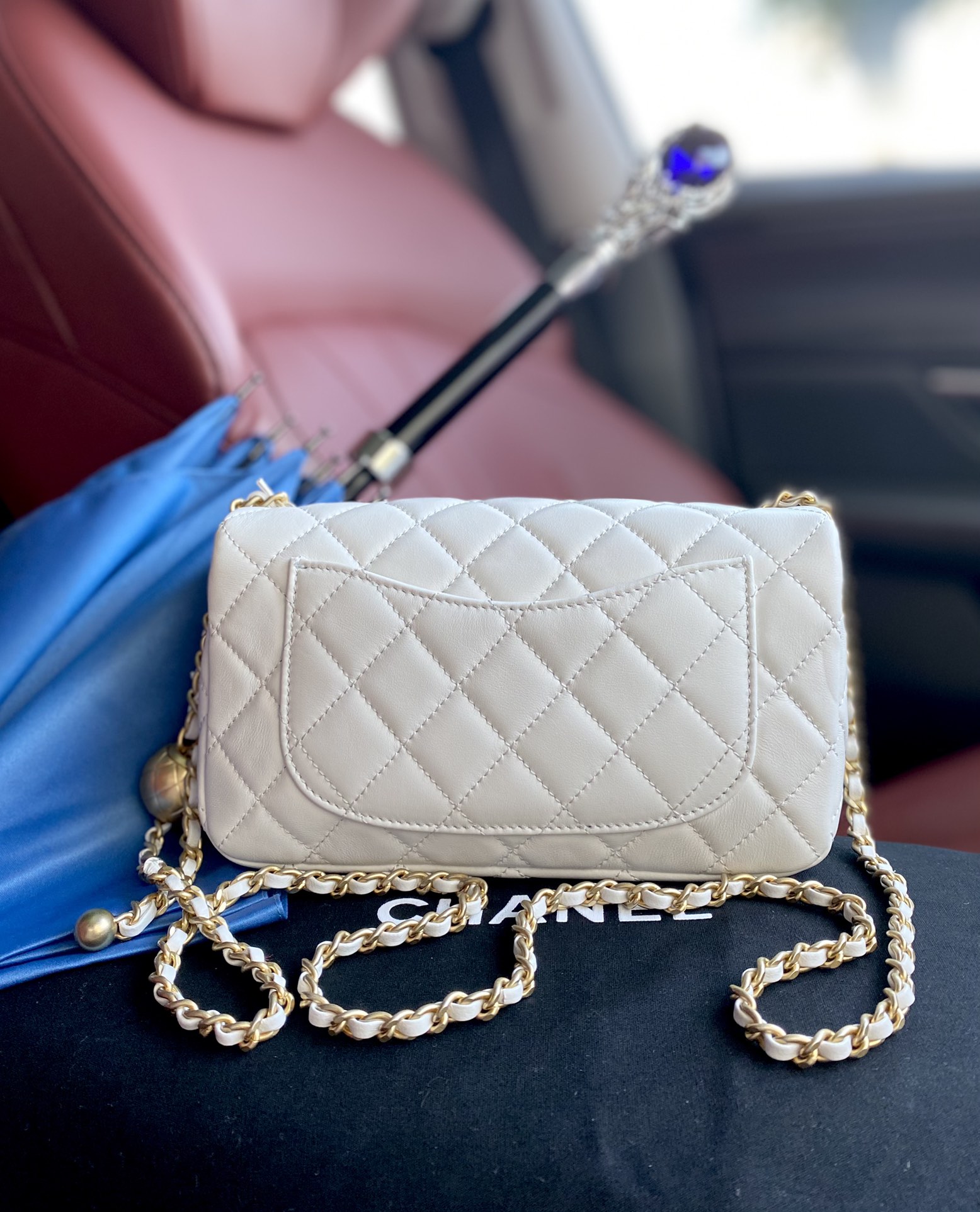 This Chanel Classic Flap bag is a timeless piece with a modern twist. The iconic design is enhanced by the addition of a golden ball detail, making it a standout accessory.