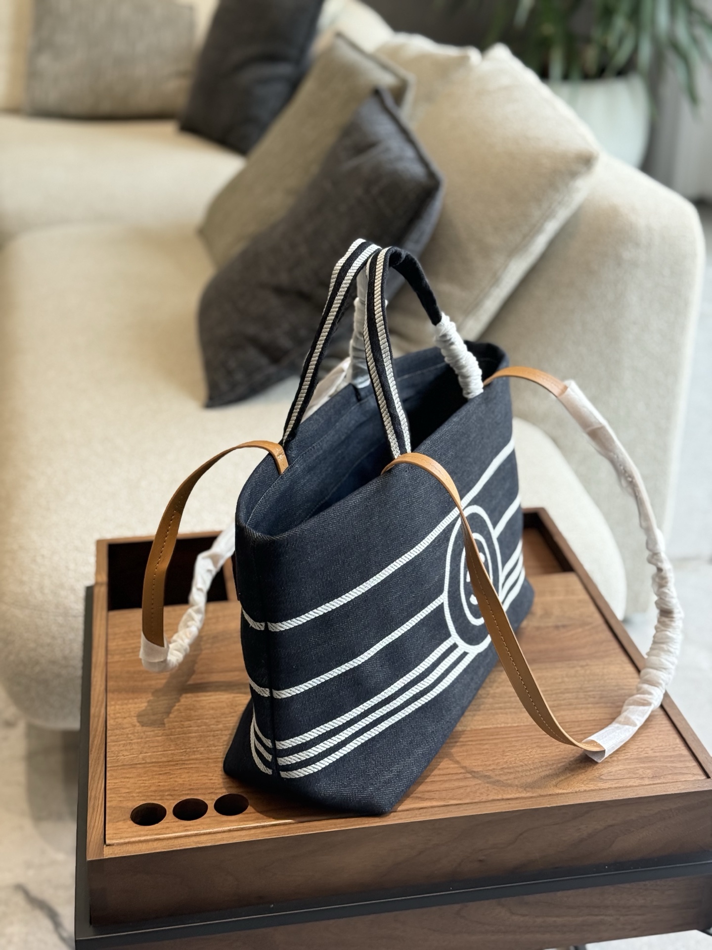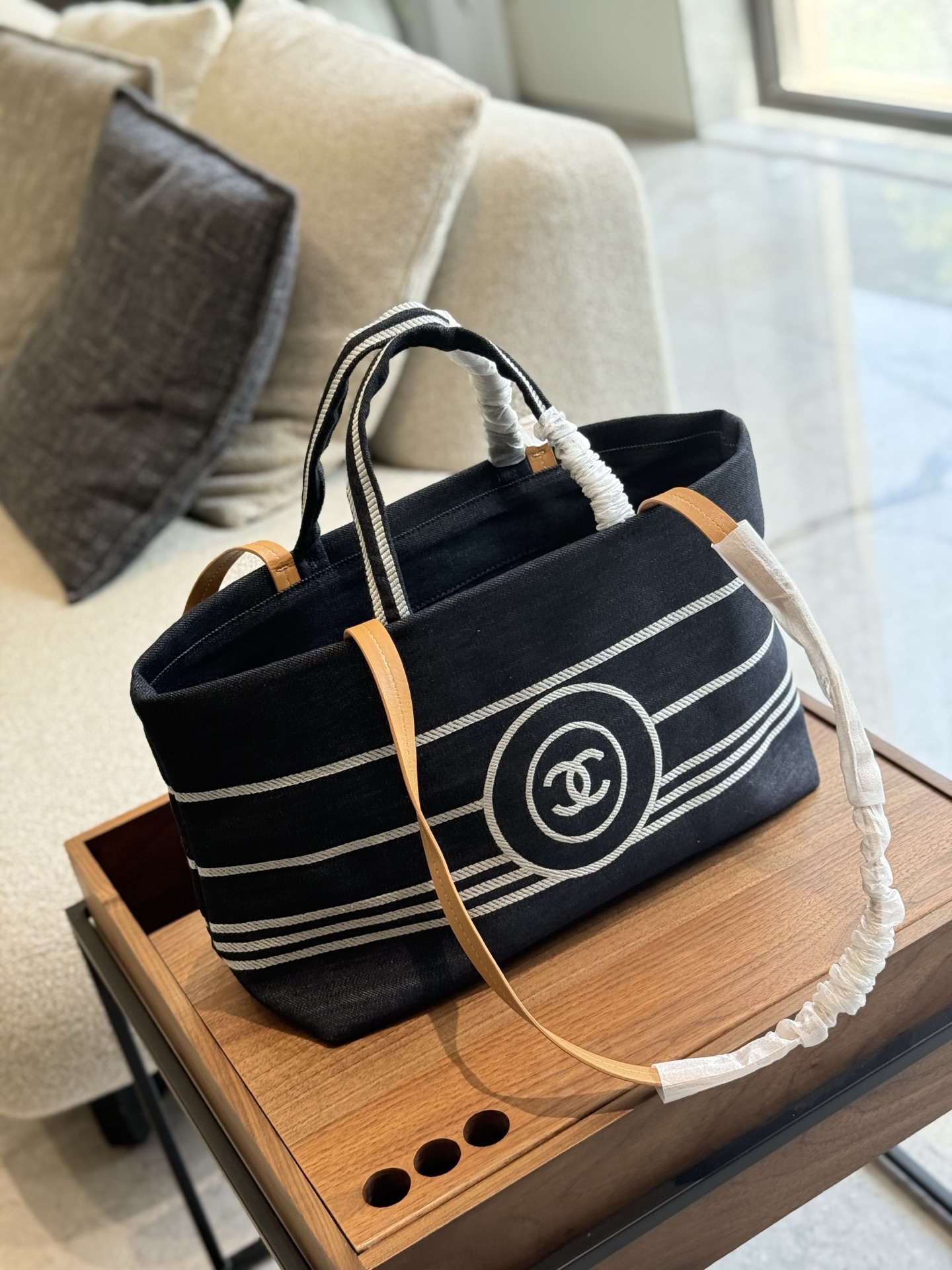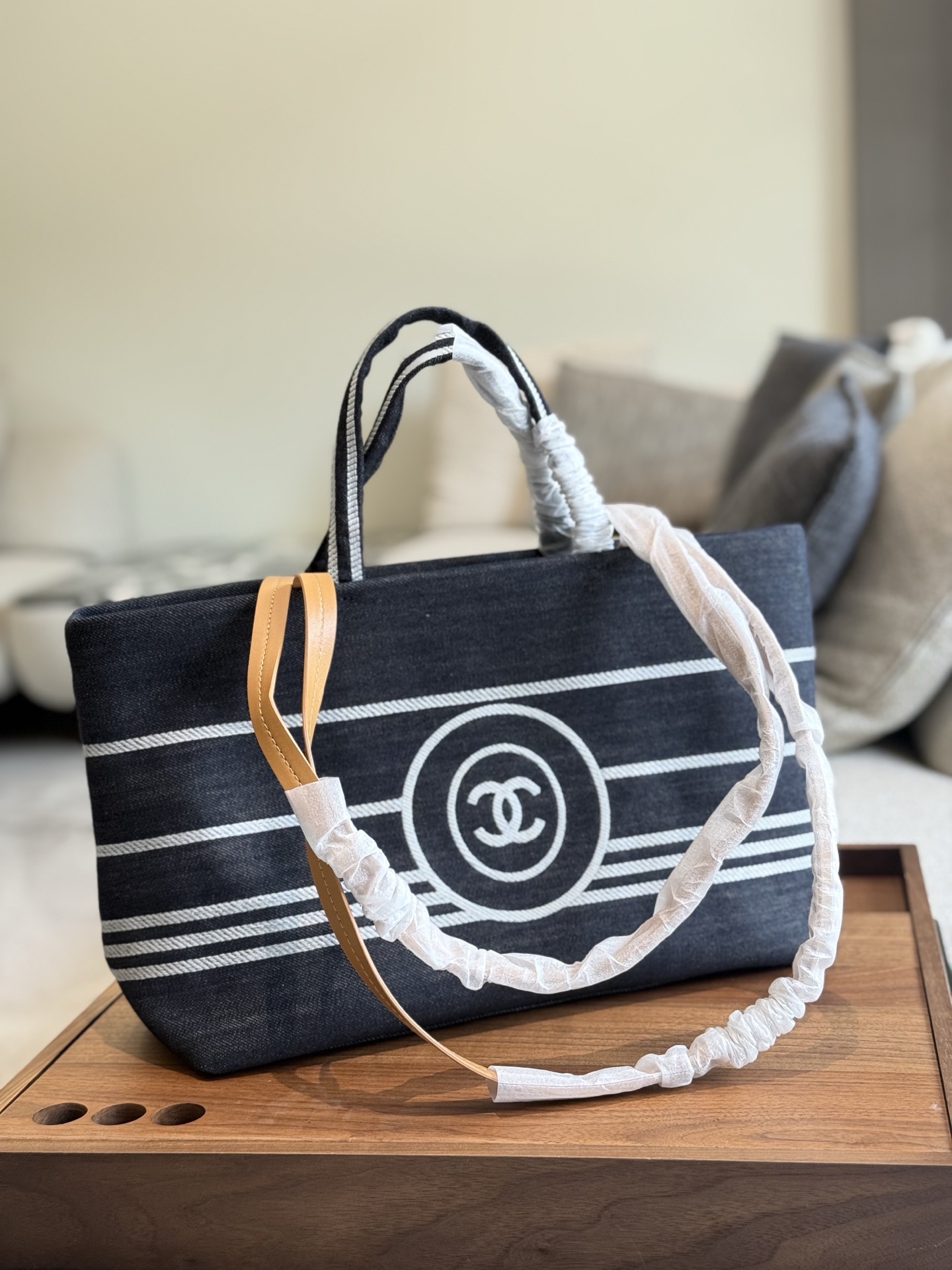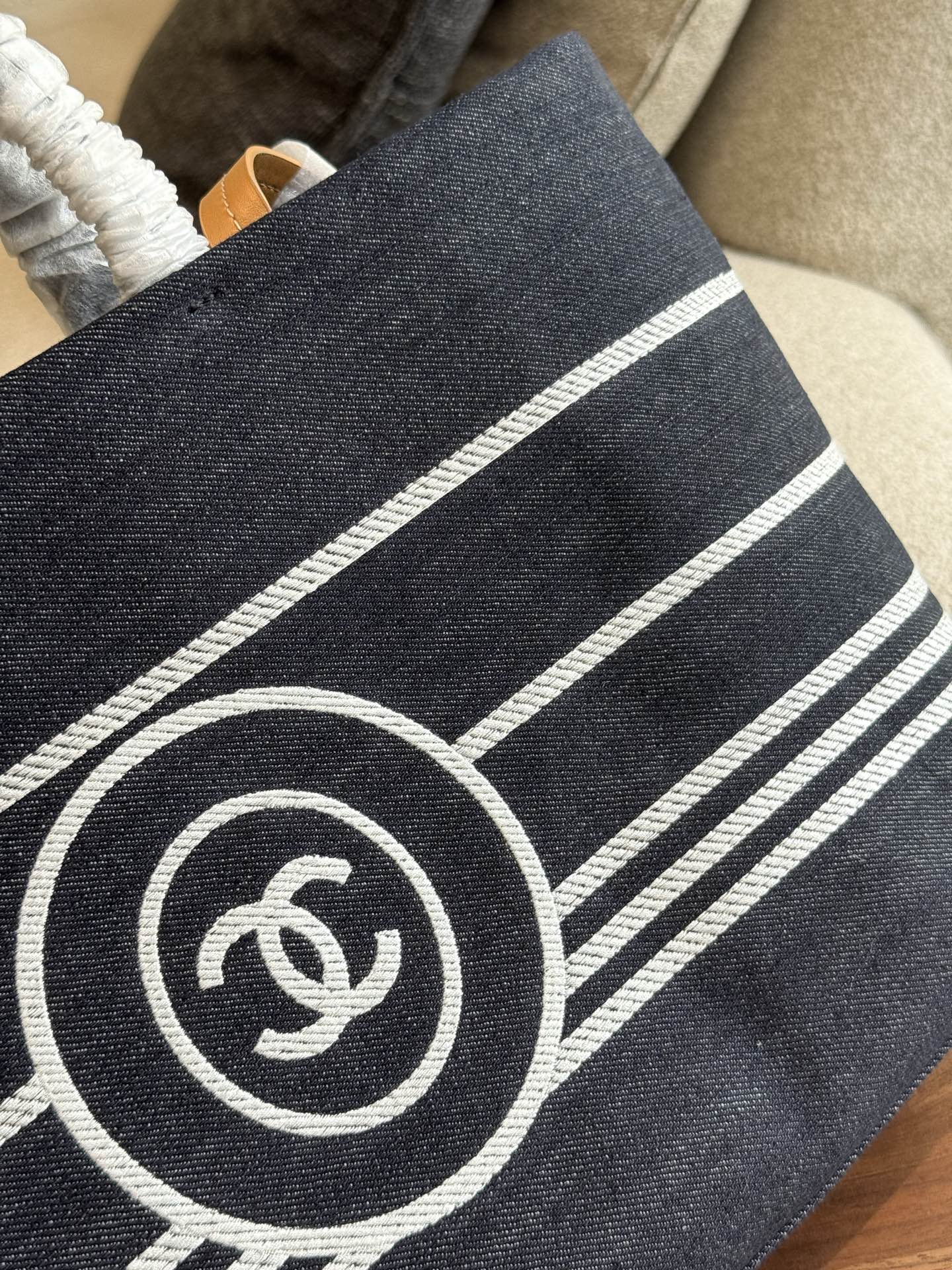 This Chanel denim striped beach bag is the perfect blend of style and practicality.