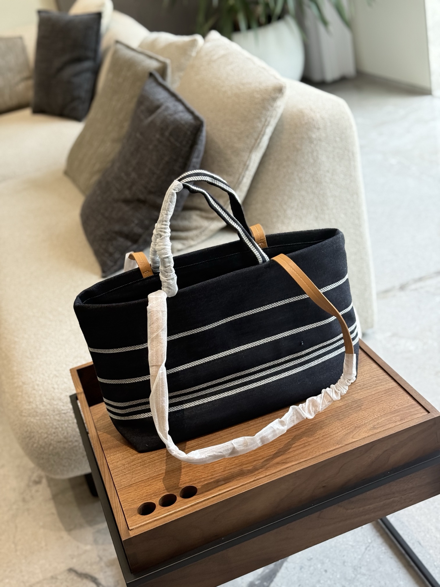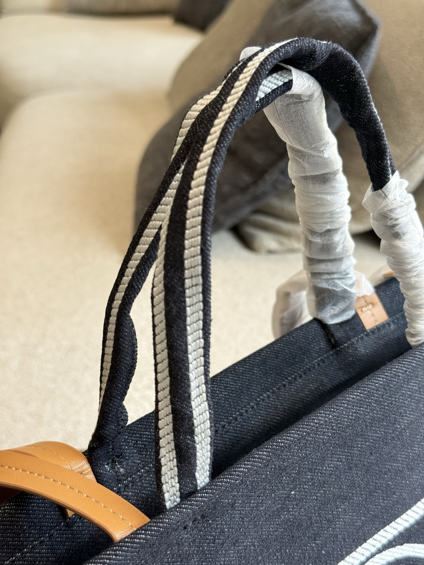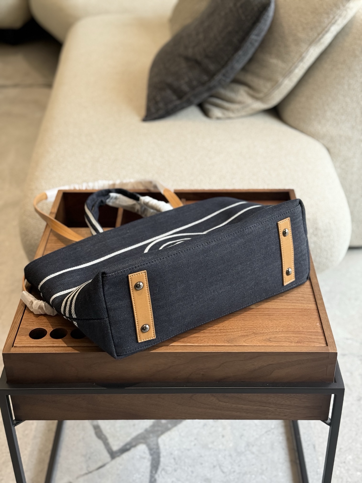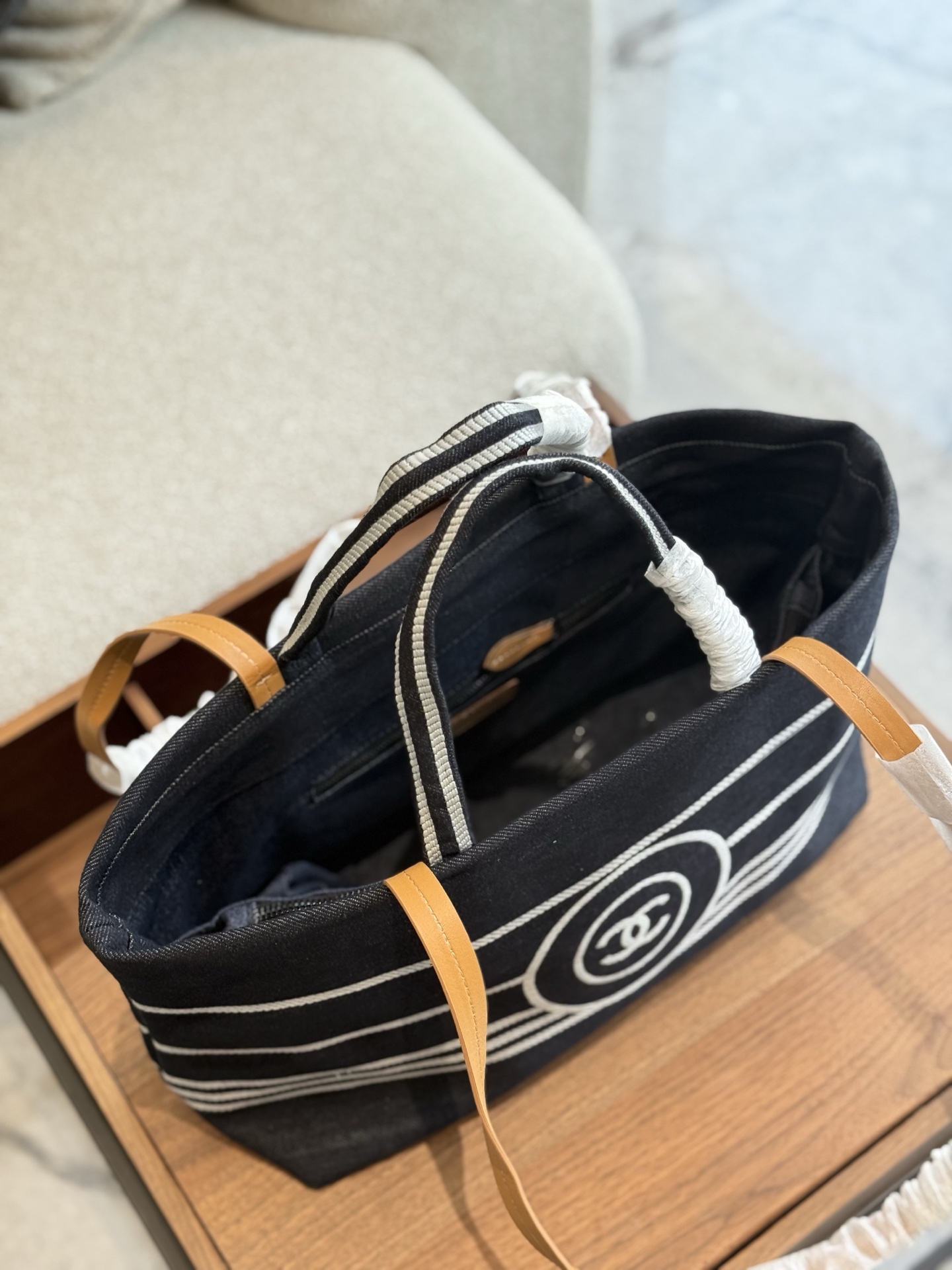 This Chanel denim striped beach bag is the perfect blend of style and practicality.