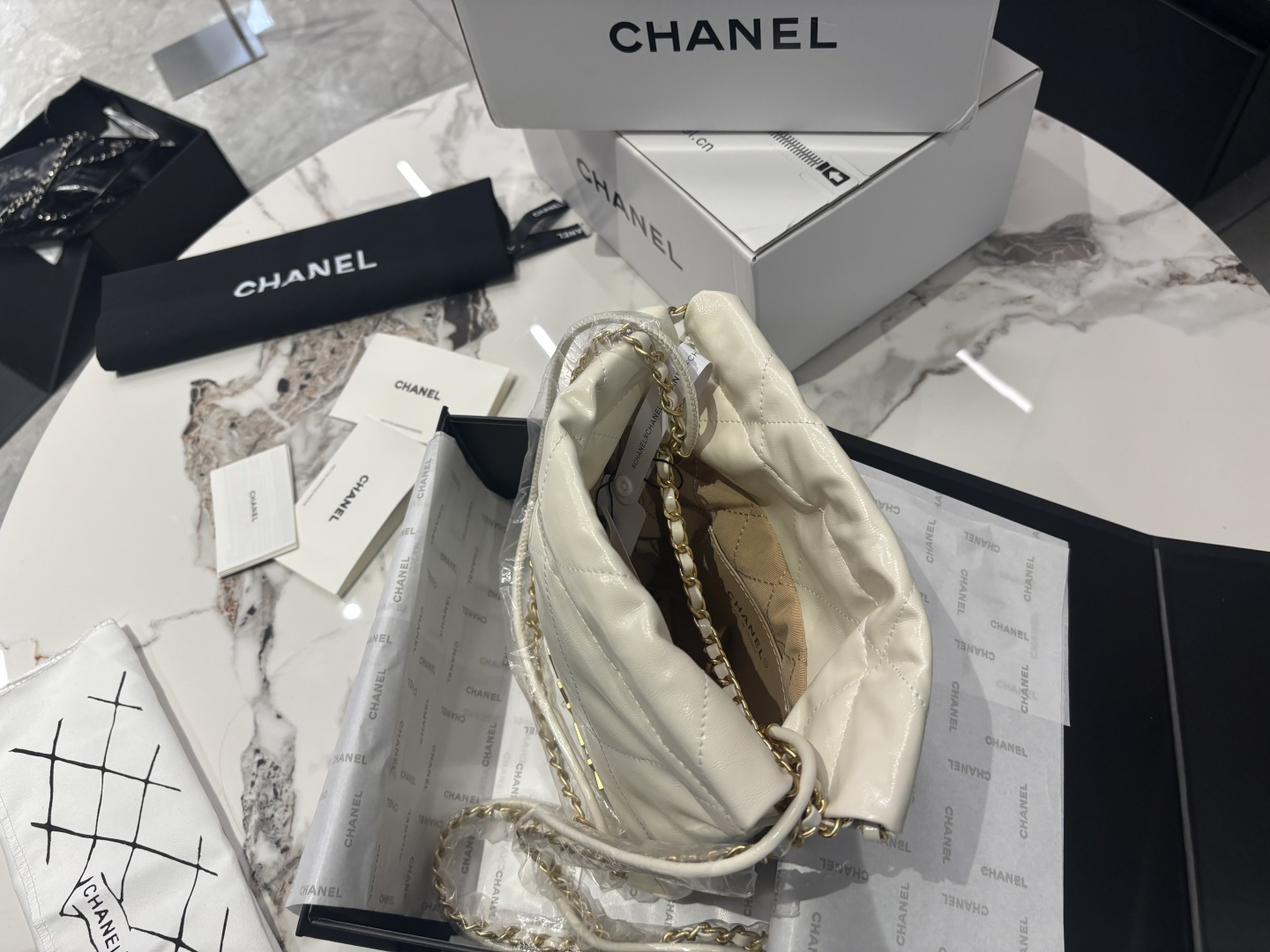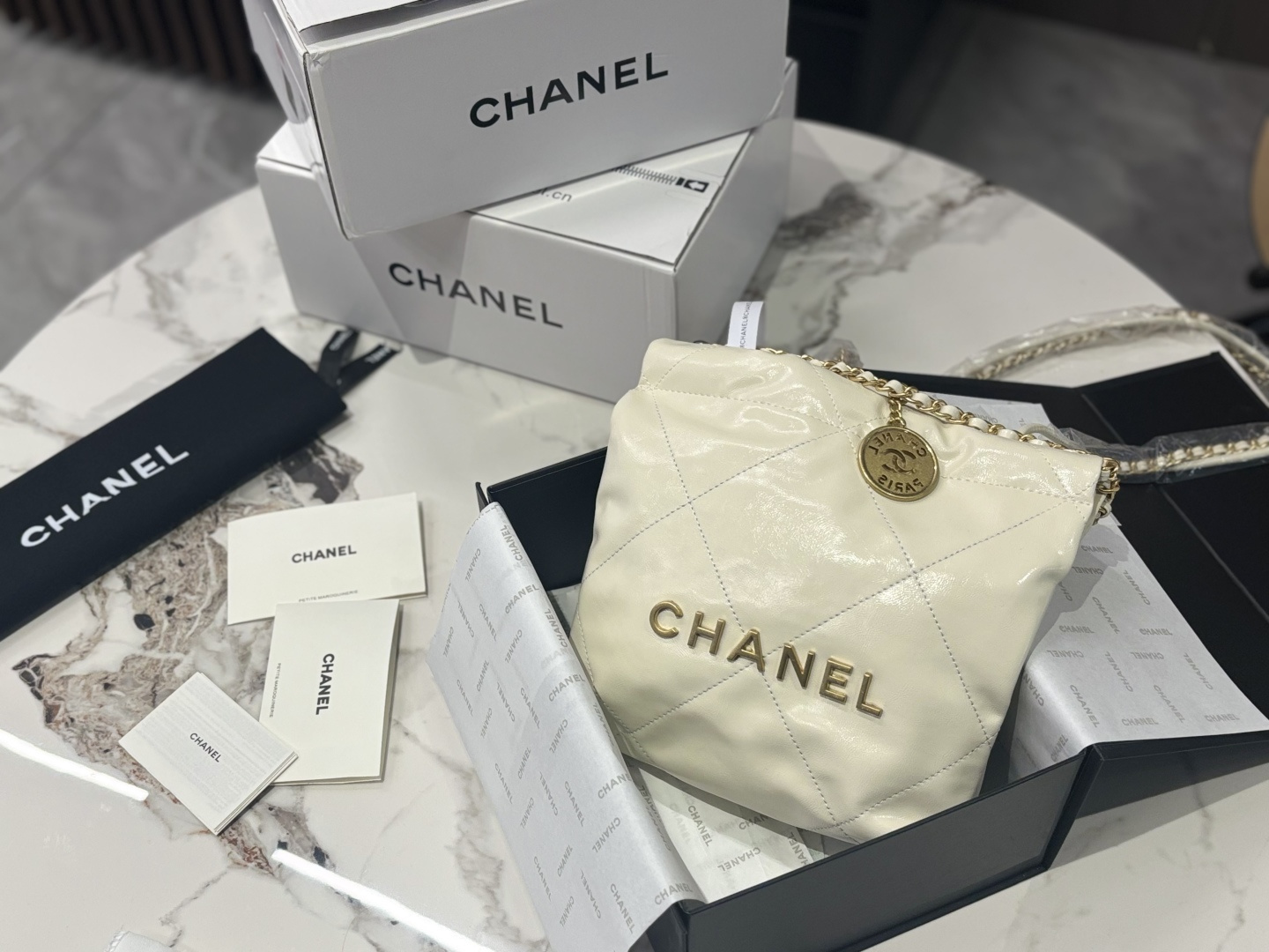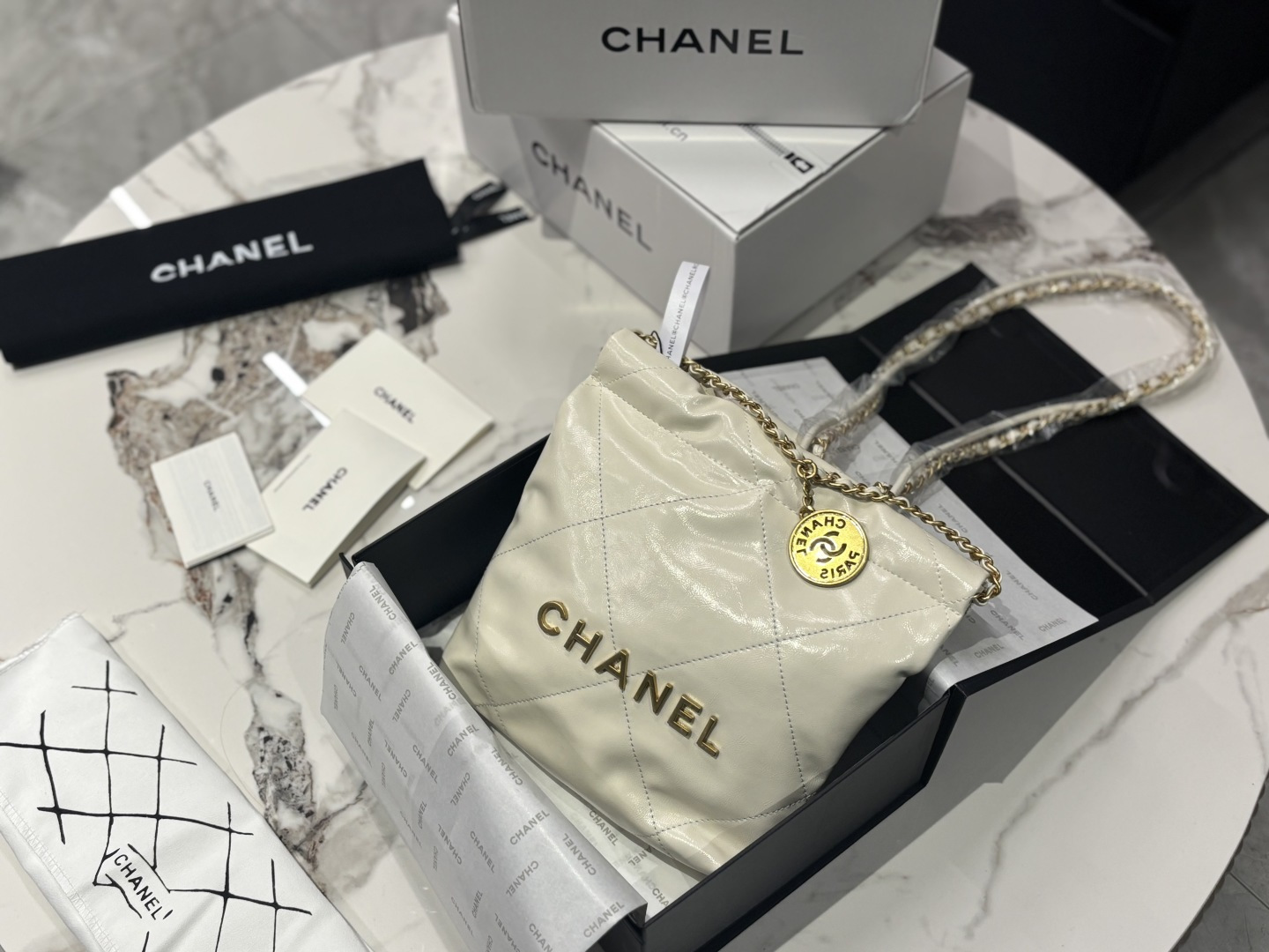 Chic Chanel Mini 22 bucket bag. Crafted from soft calfskin leather. Features a drawstring closure, quilted design, and gold-tone hardware. Size: 20*20cm.