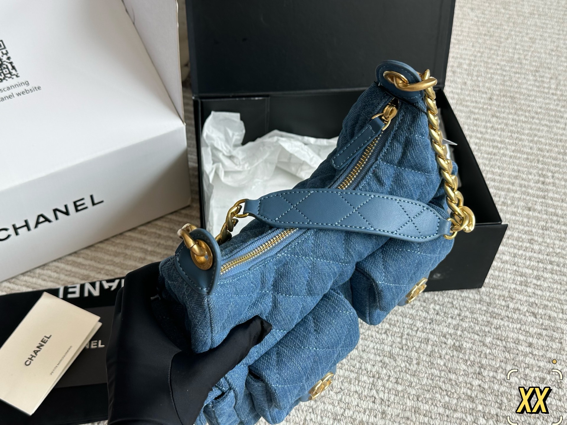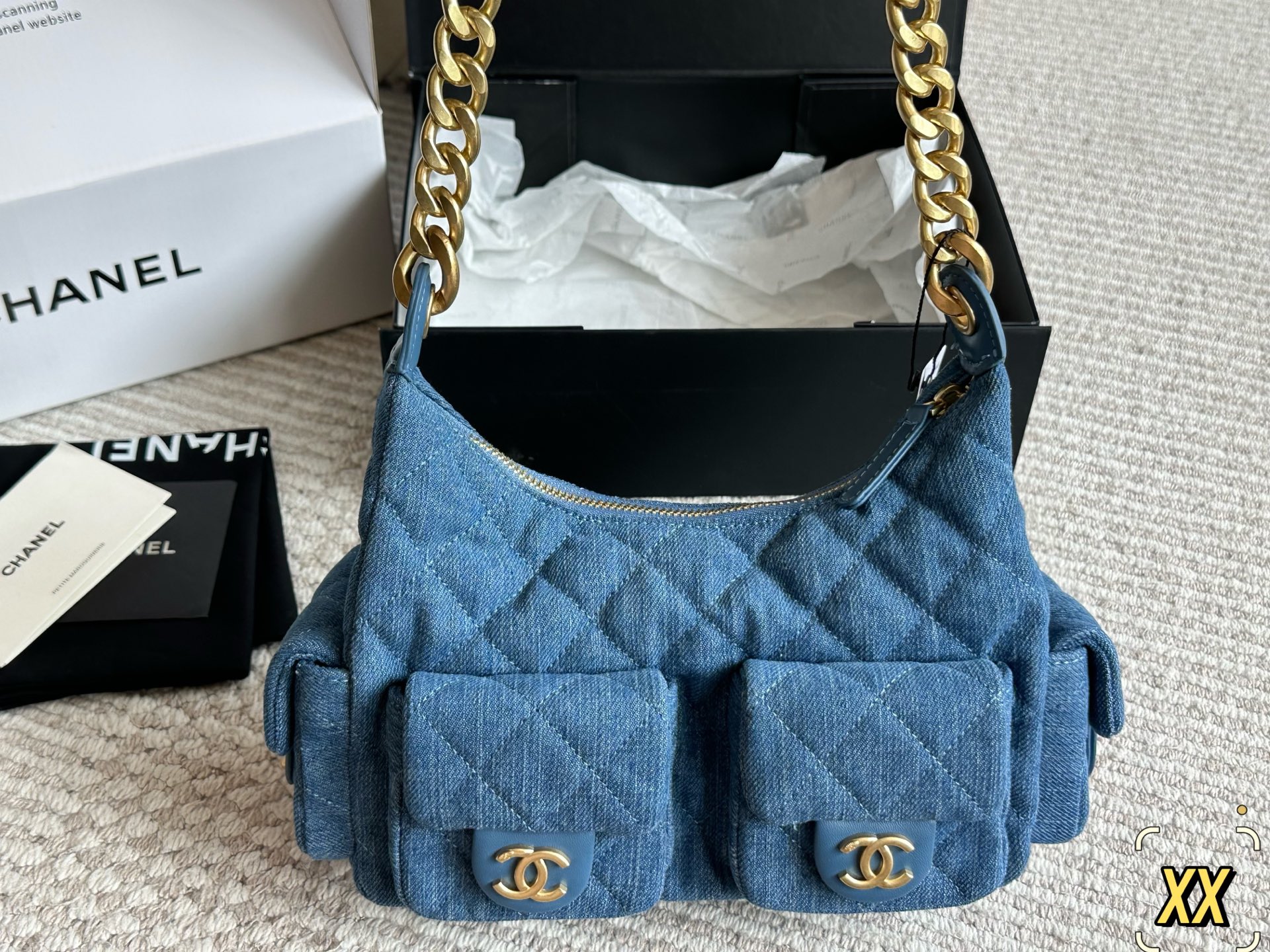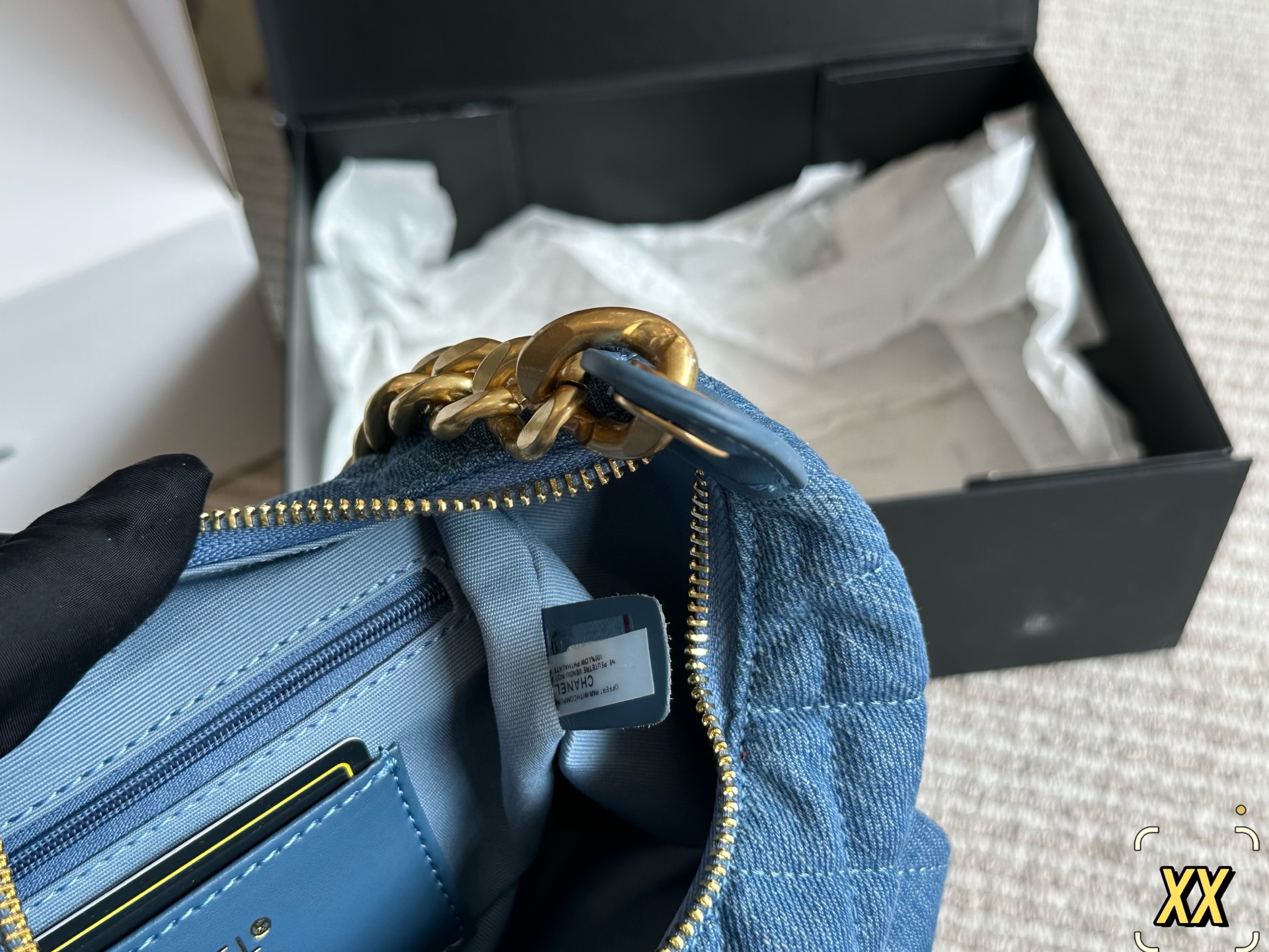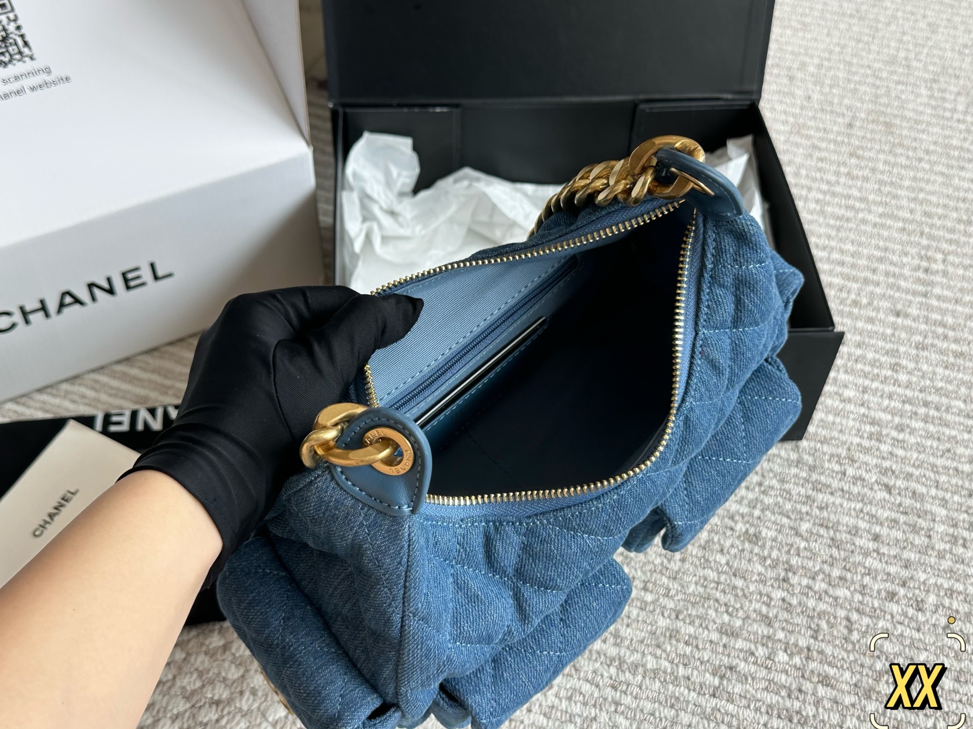 Elevate your style with this Chanel vintage bowling bag. Crafted in denim blue with gold chain, this timeless piece is a must-have for fashion enthusiasts.