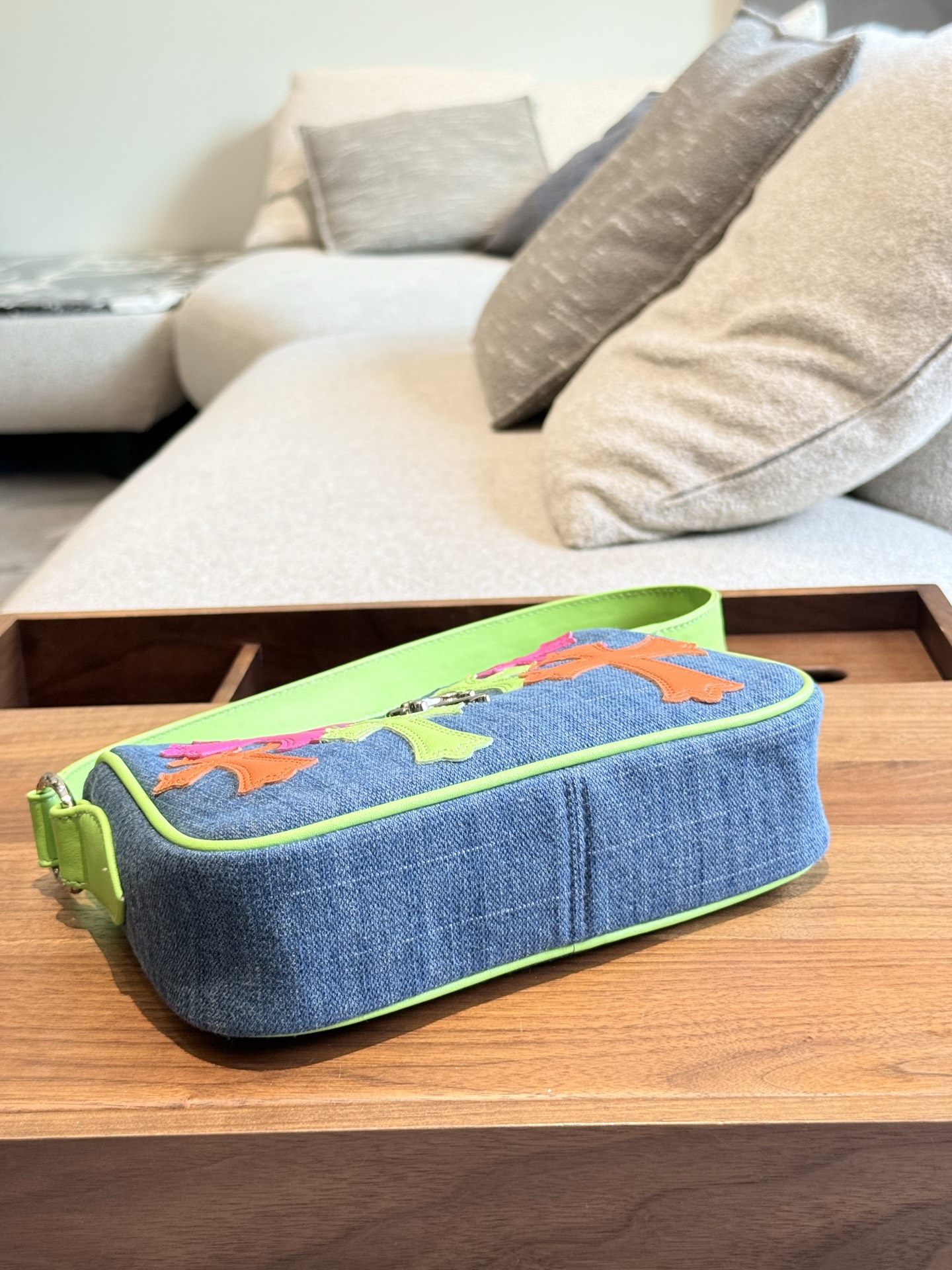 Make a statement with this Chrome Hearts Miami-exclusive denim bag. Featuring vibrant leather crosses and a unique design, it's a must-have for trendsetters.