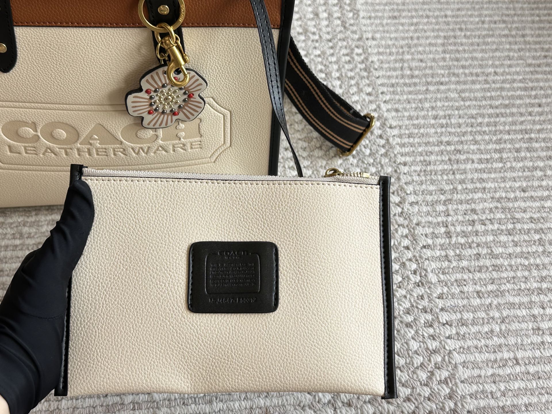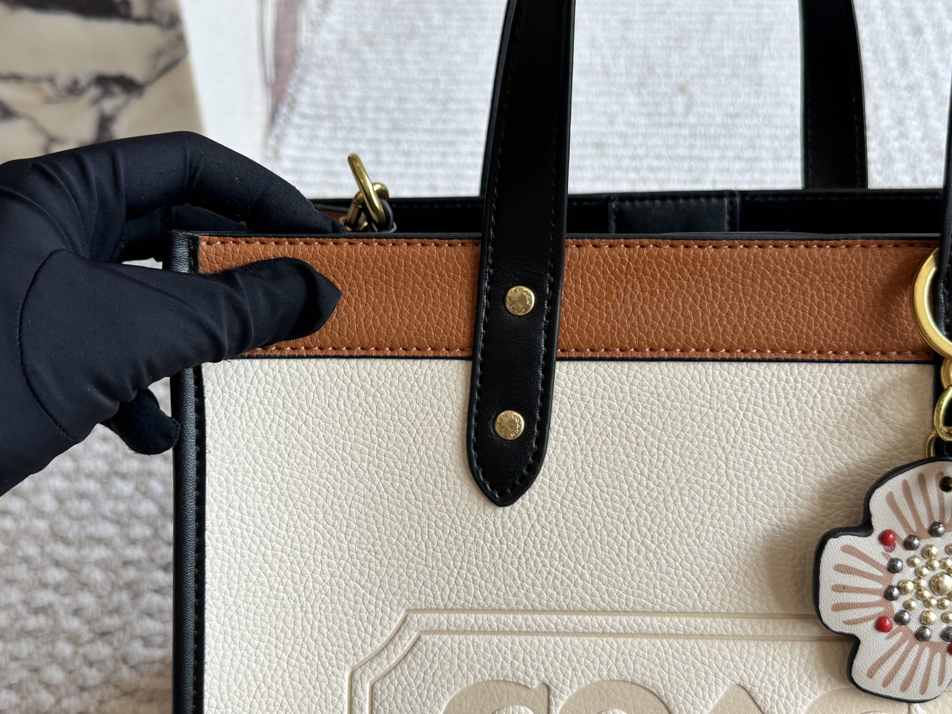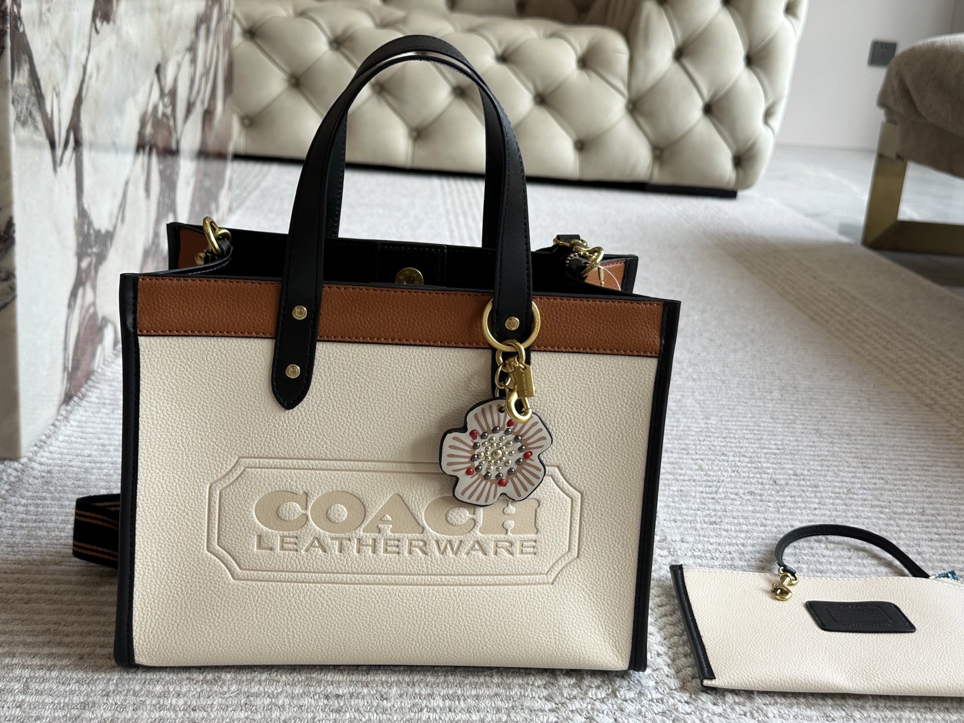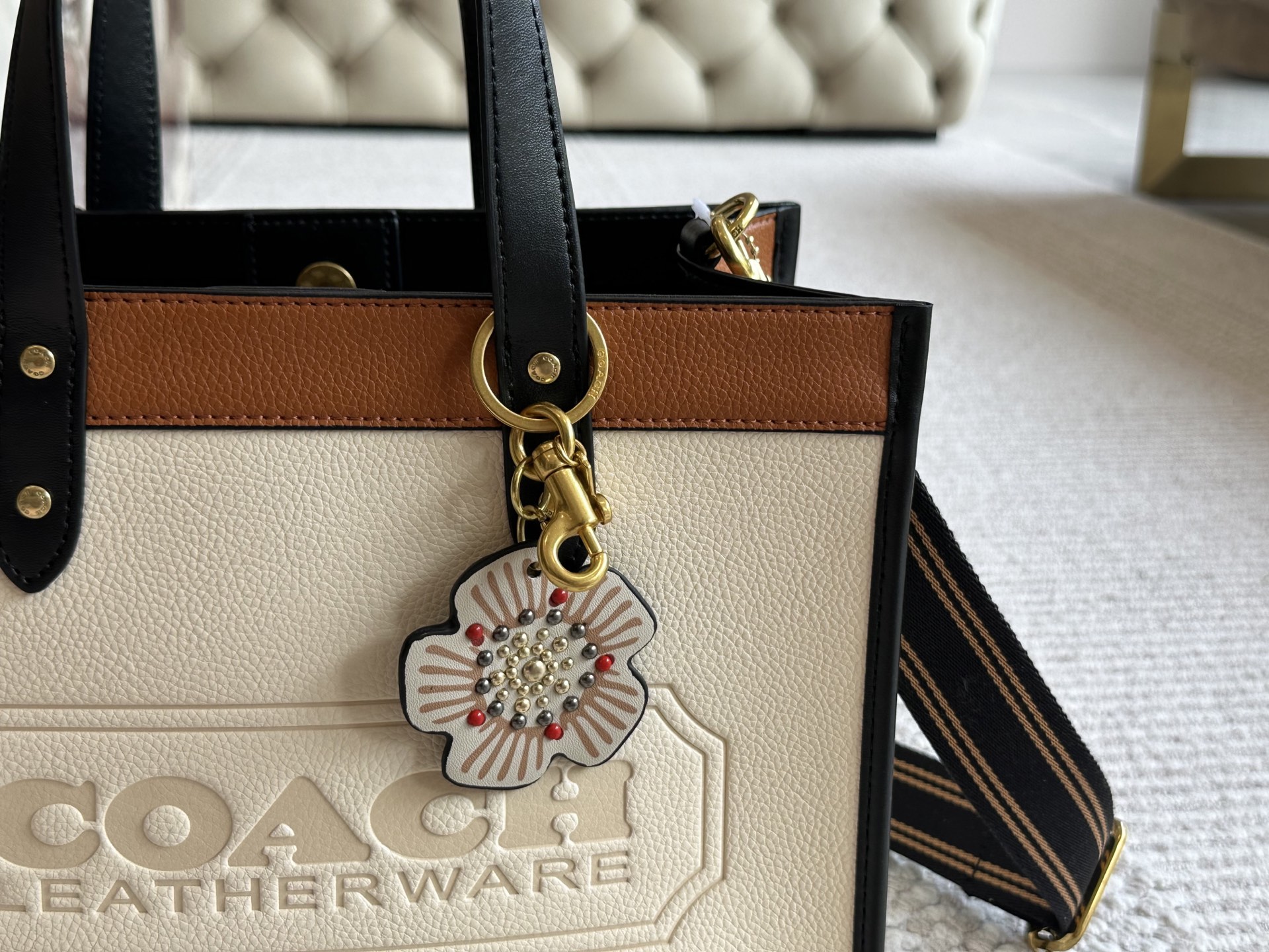 Elevate your style with this Coach Coacho tote bag. Featuring a cream leatherware design, floral accent, and versatile shoulder strap, it's the perfect blend of elegance.
