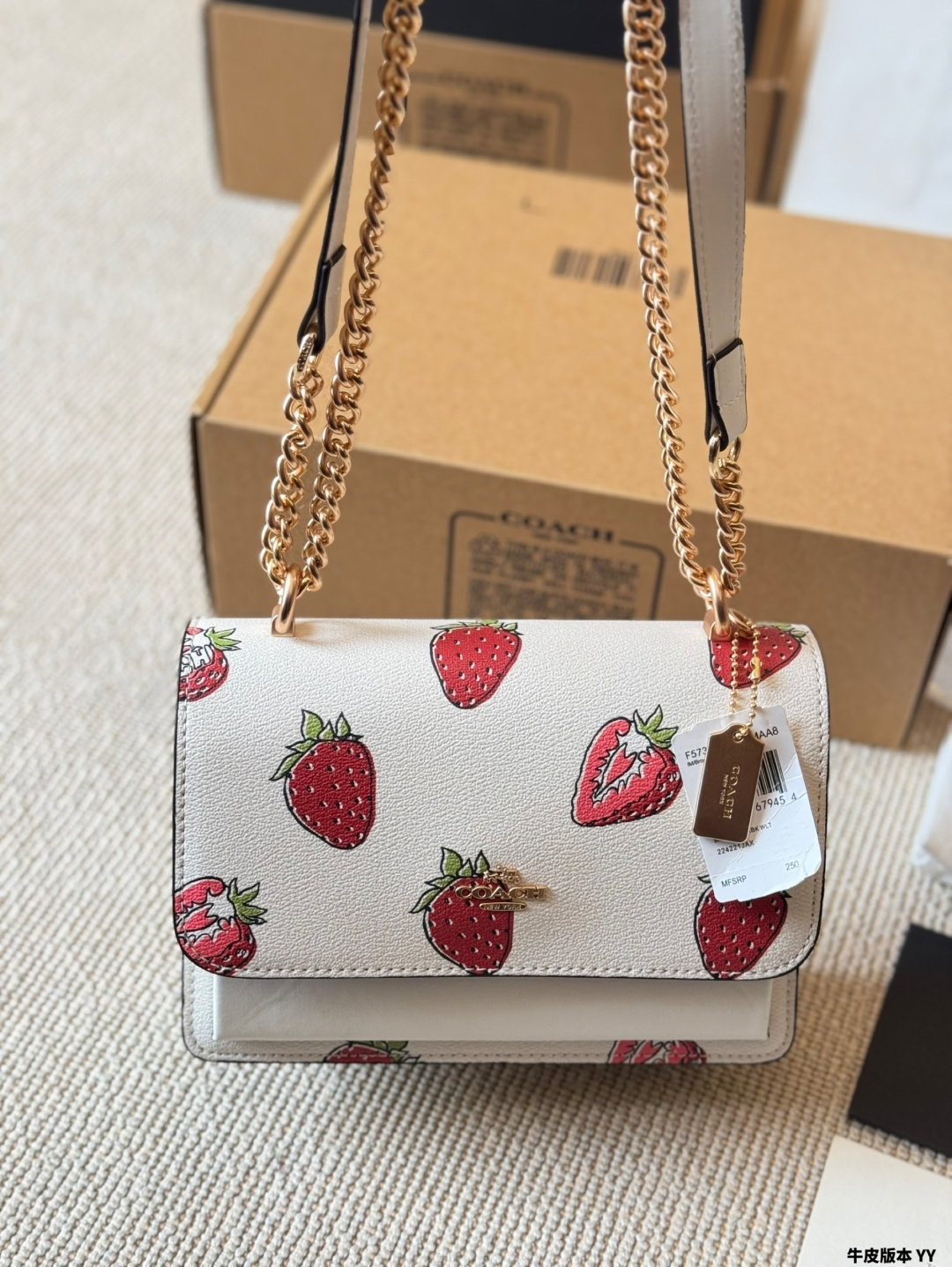 Elevate your style with the COACH Klare Flap bag.Featuring a charming strawberry print, snake-print trim, and lightweight chain. Perfect for any season!