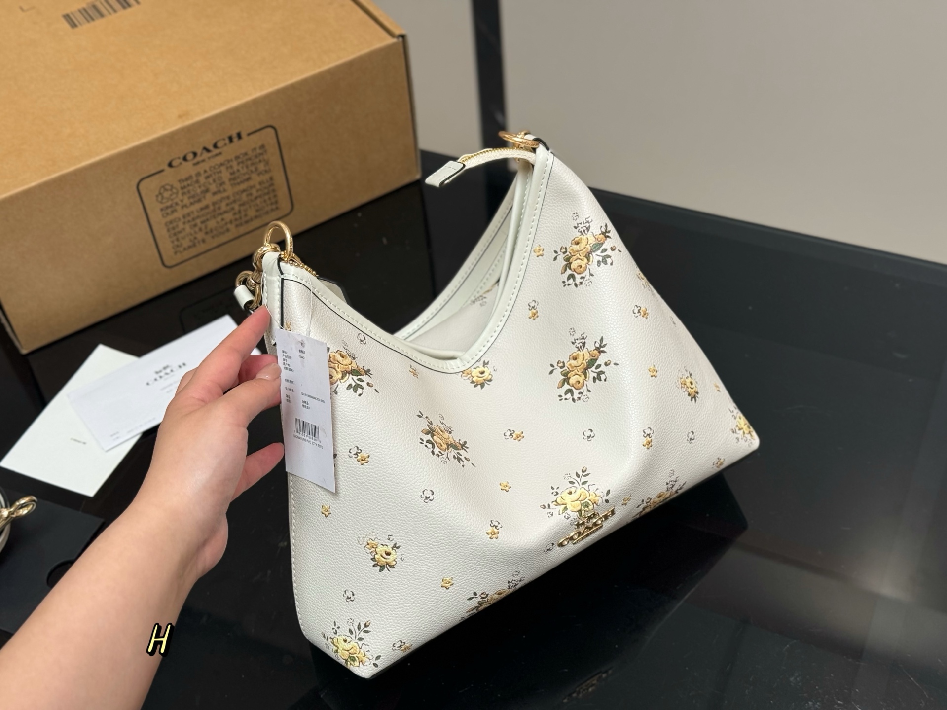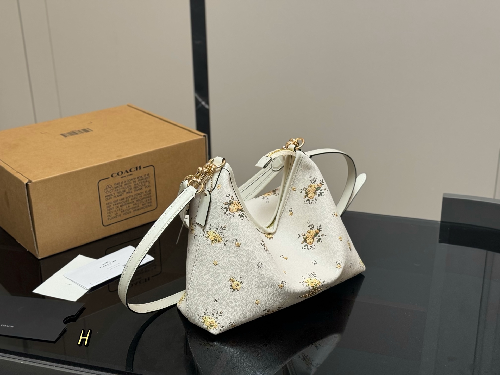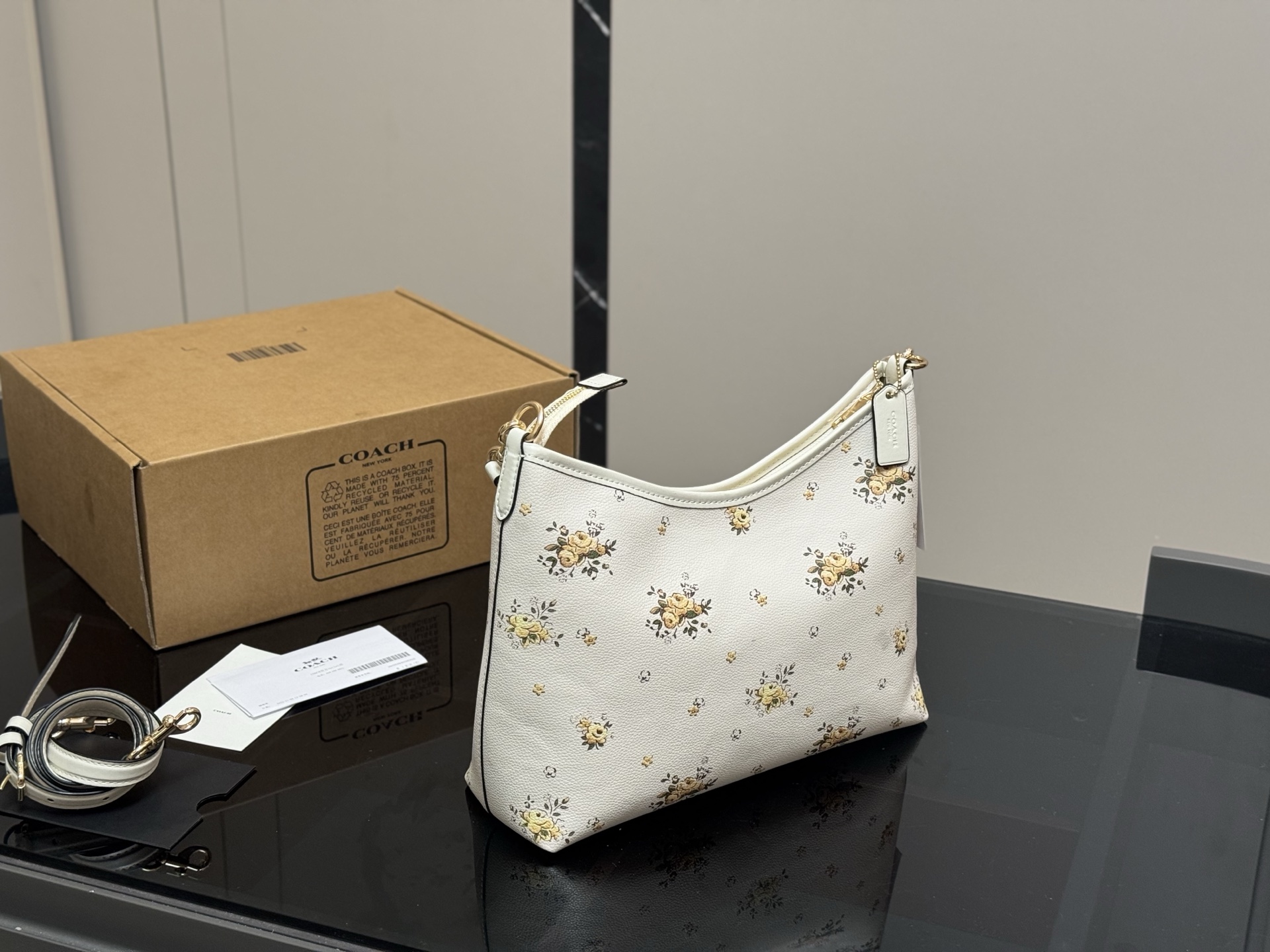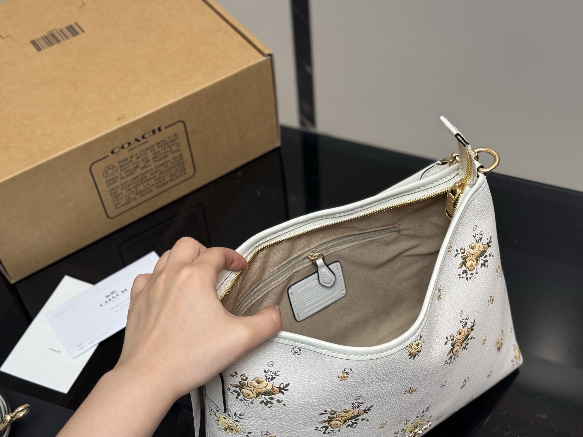 The Coach Laurel Hobo Bag features a chic floral print, versatile straps for shoulder or crossbody wear, and secure zip pockets.
