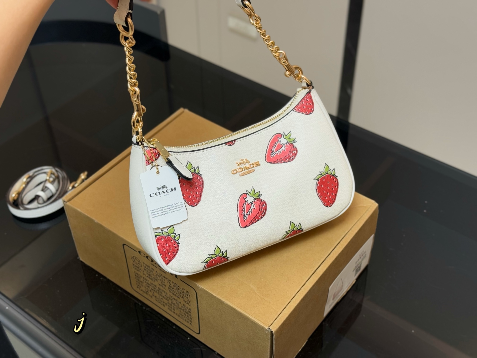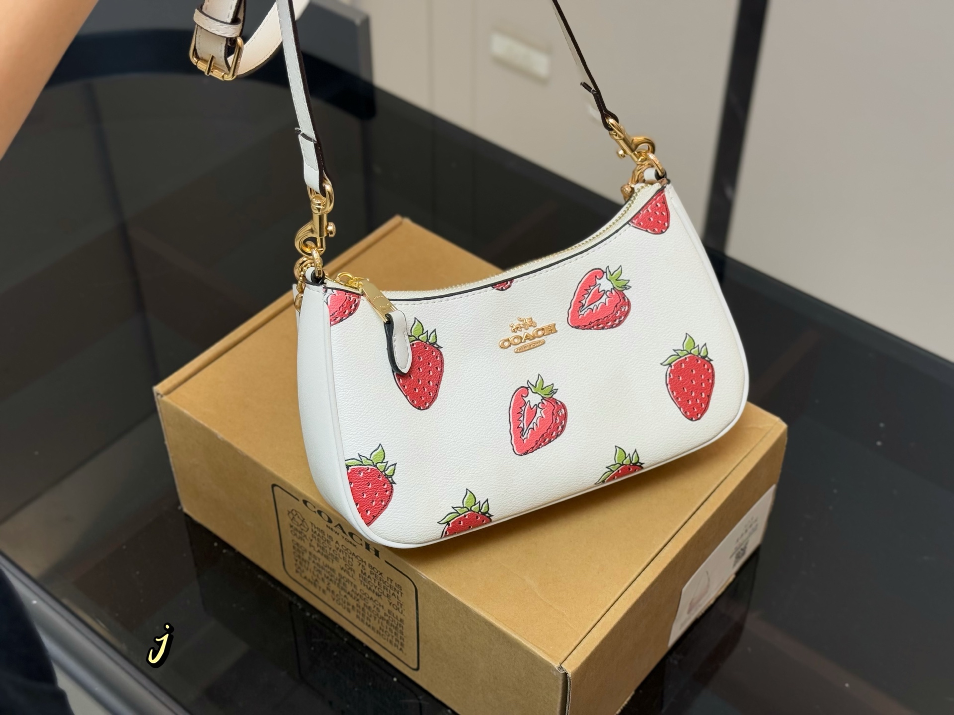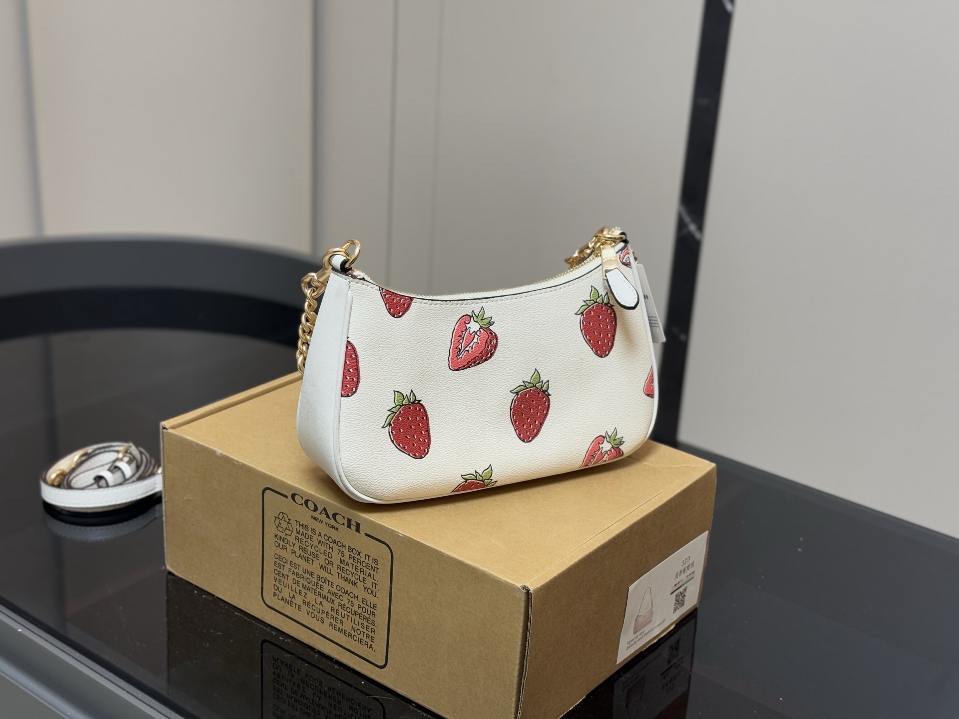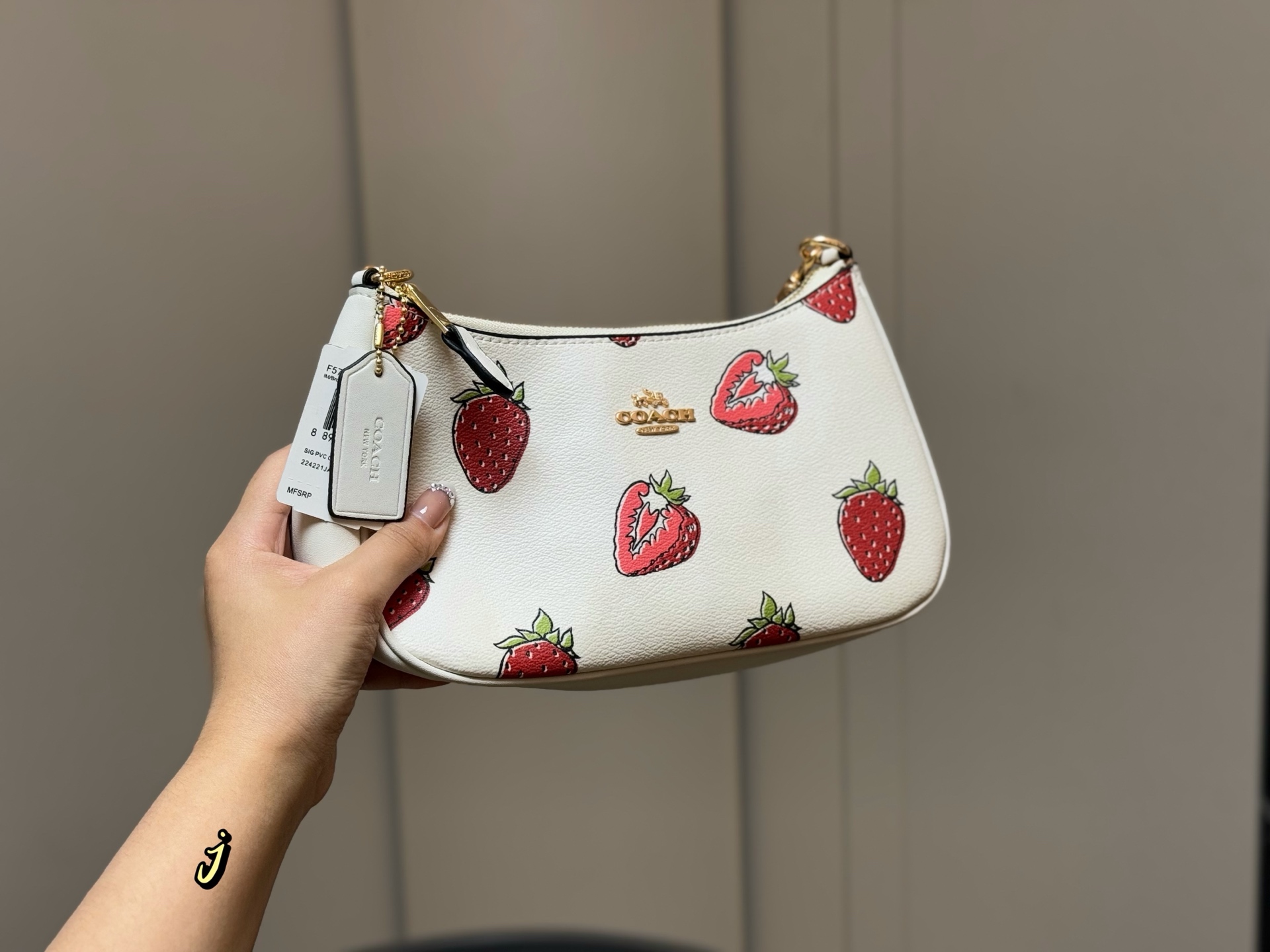Elevate your style with the Coach Teri Shoulder Bag, featuring a delightful strawberry print. Compact, chic, and perfect for any outfit.