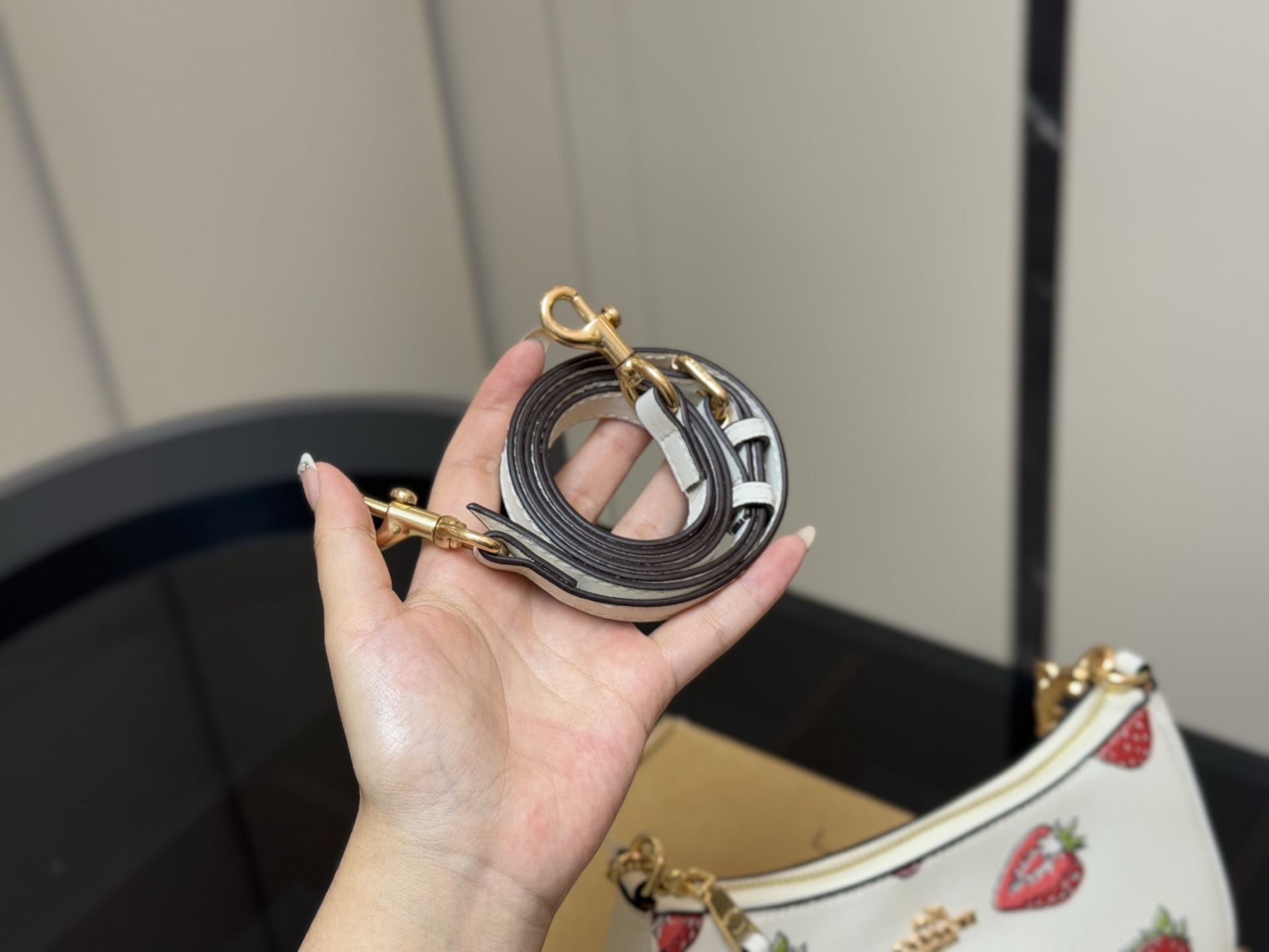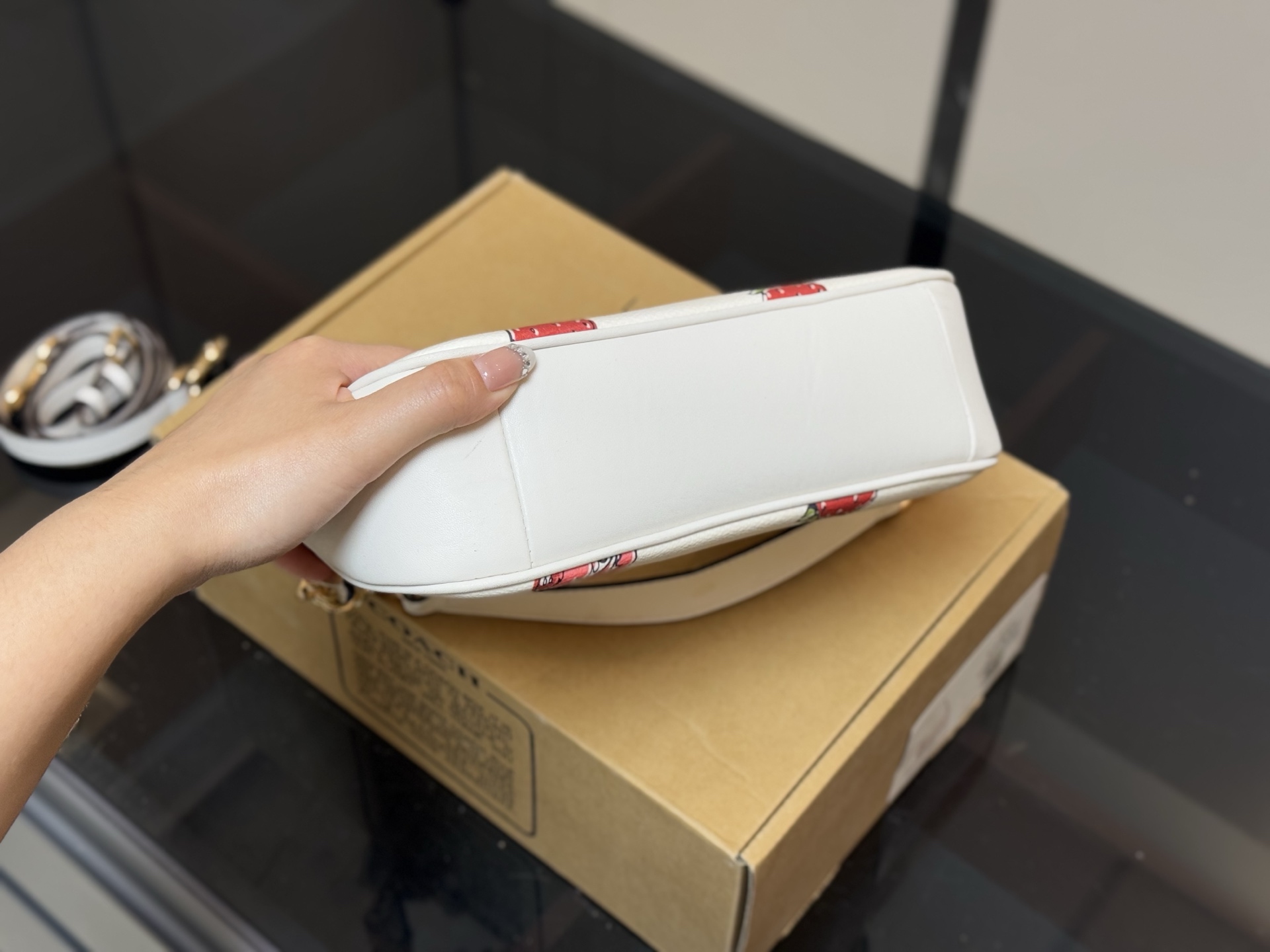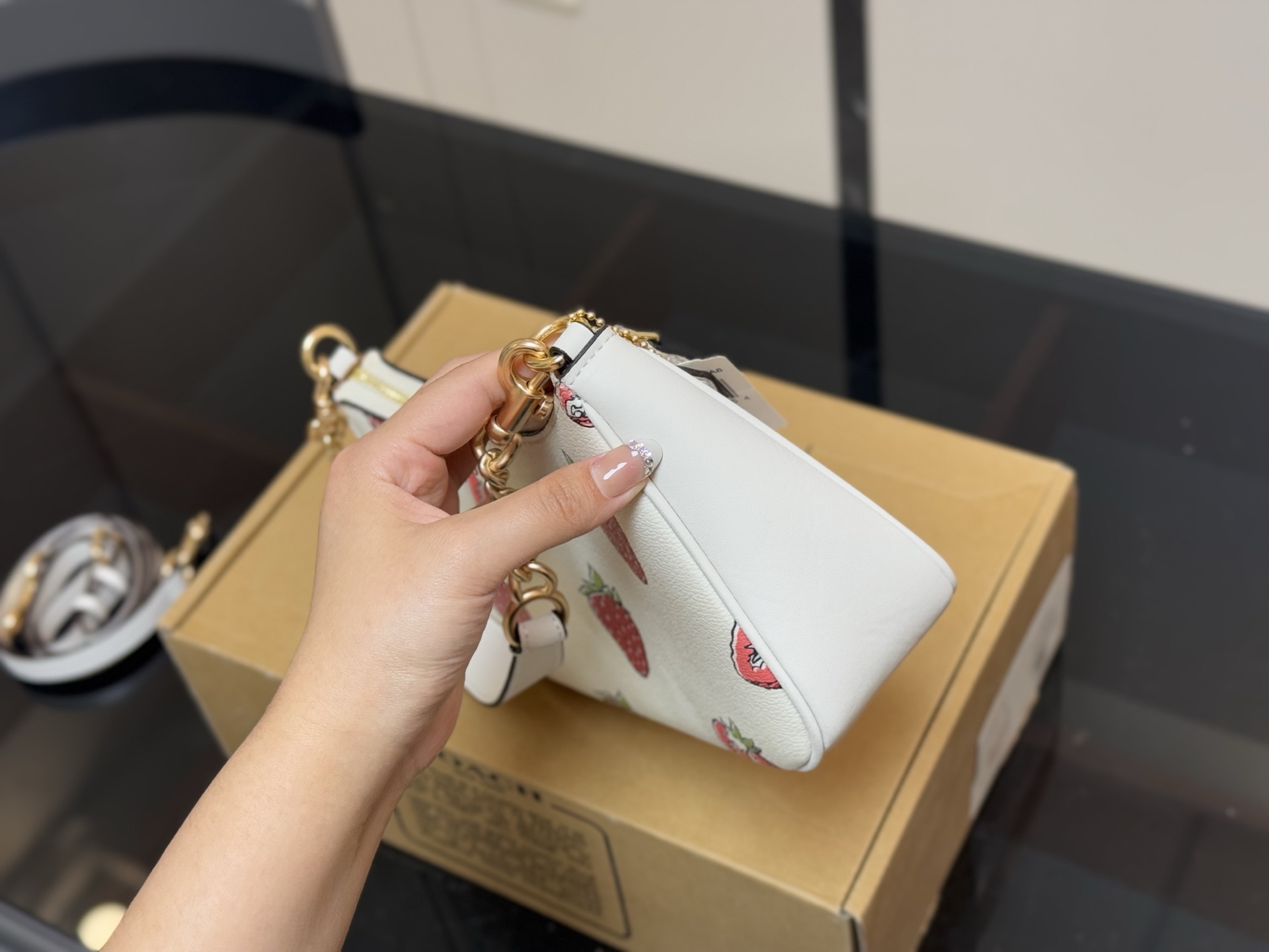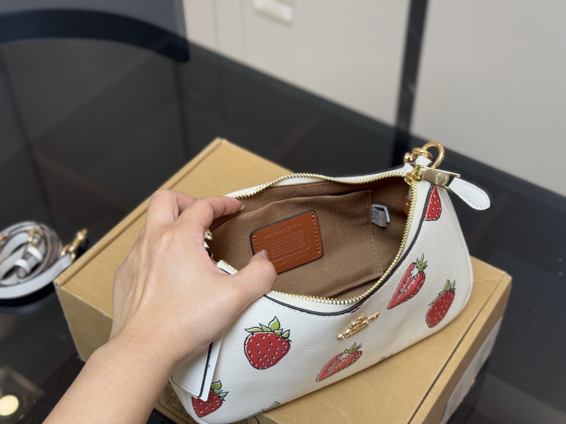 Elevate your style with the Coach Teri Shoulder Bag, featuring a delightful strawberry print. Compact, chic, and perfect for any outfit.
