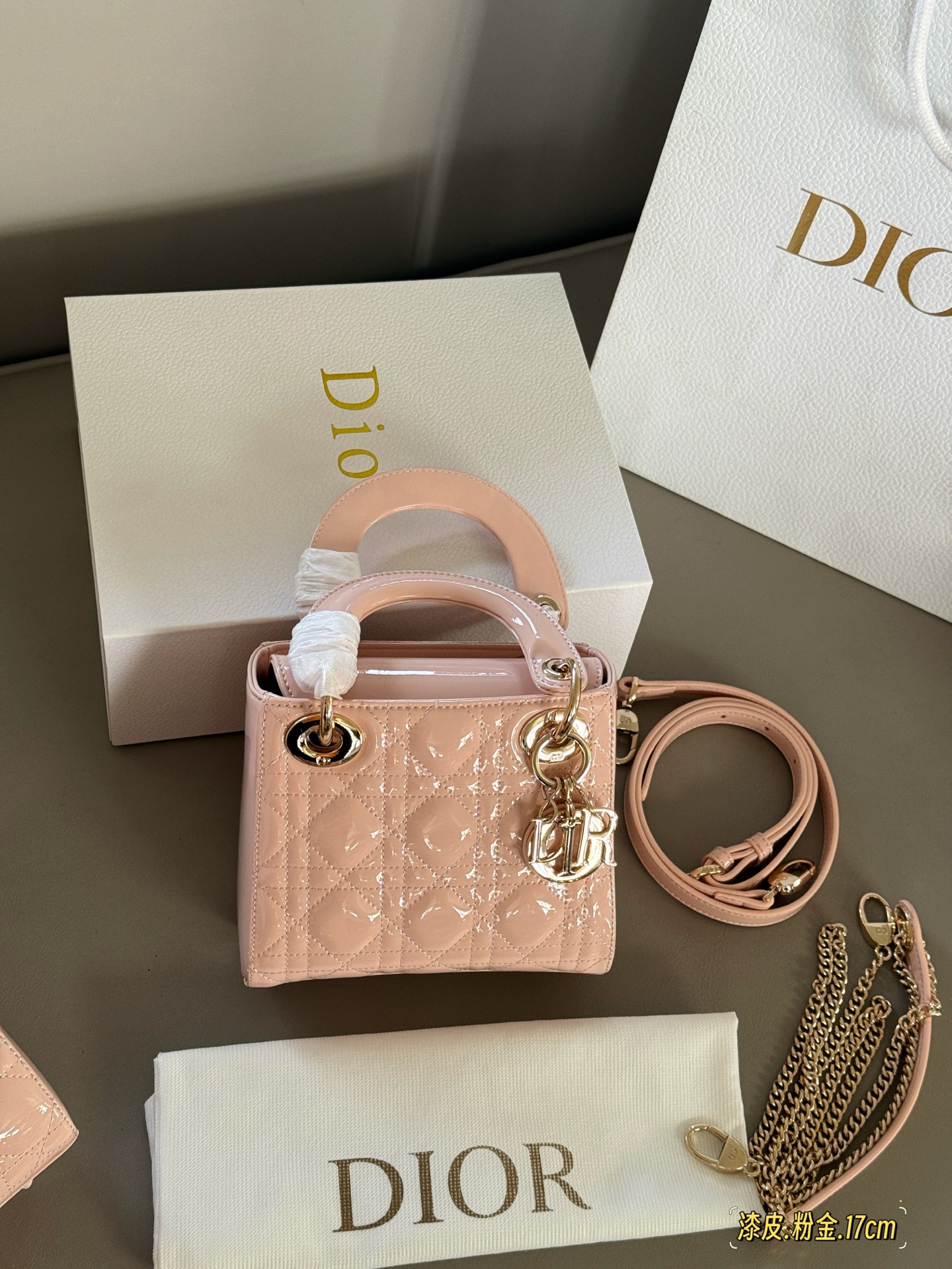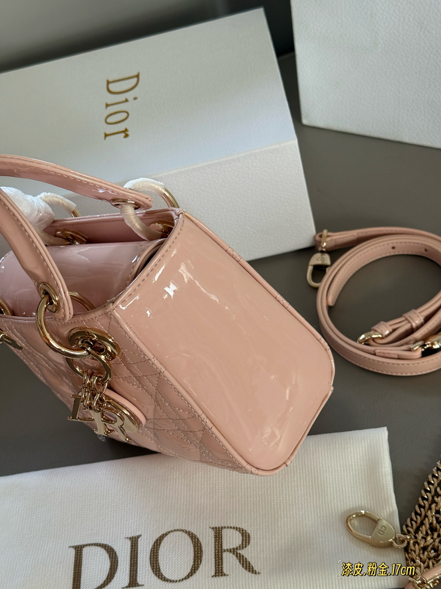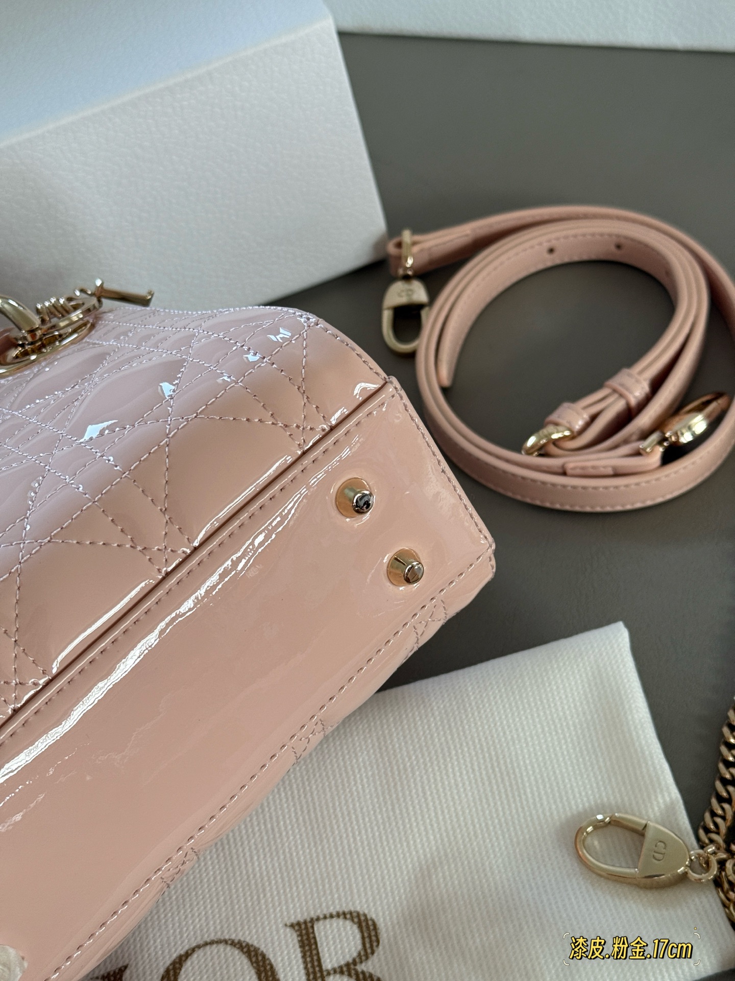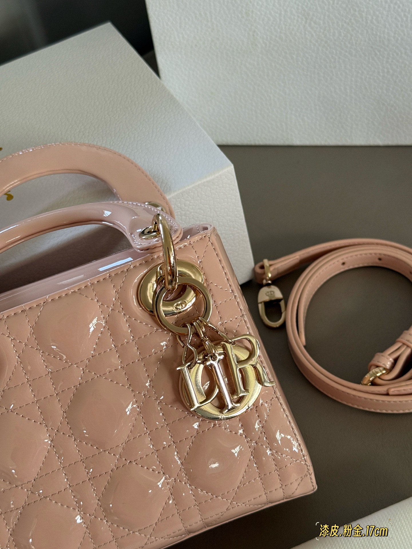 The Dior Lady Dior bag in pale gold patent leather. Iconic design with detachable chain. Perfect for summer. Available in two sizes: 17*15cm & 21*17cm.