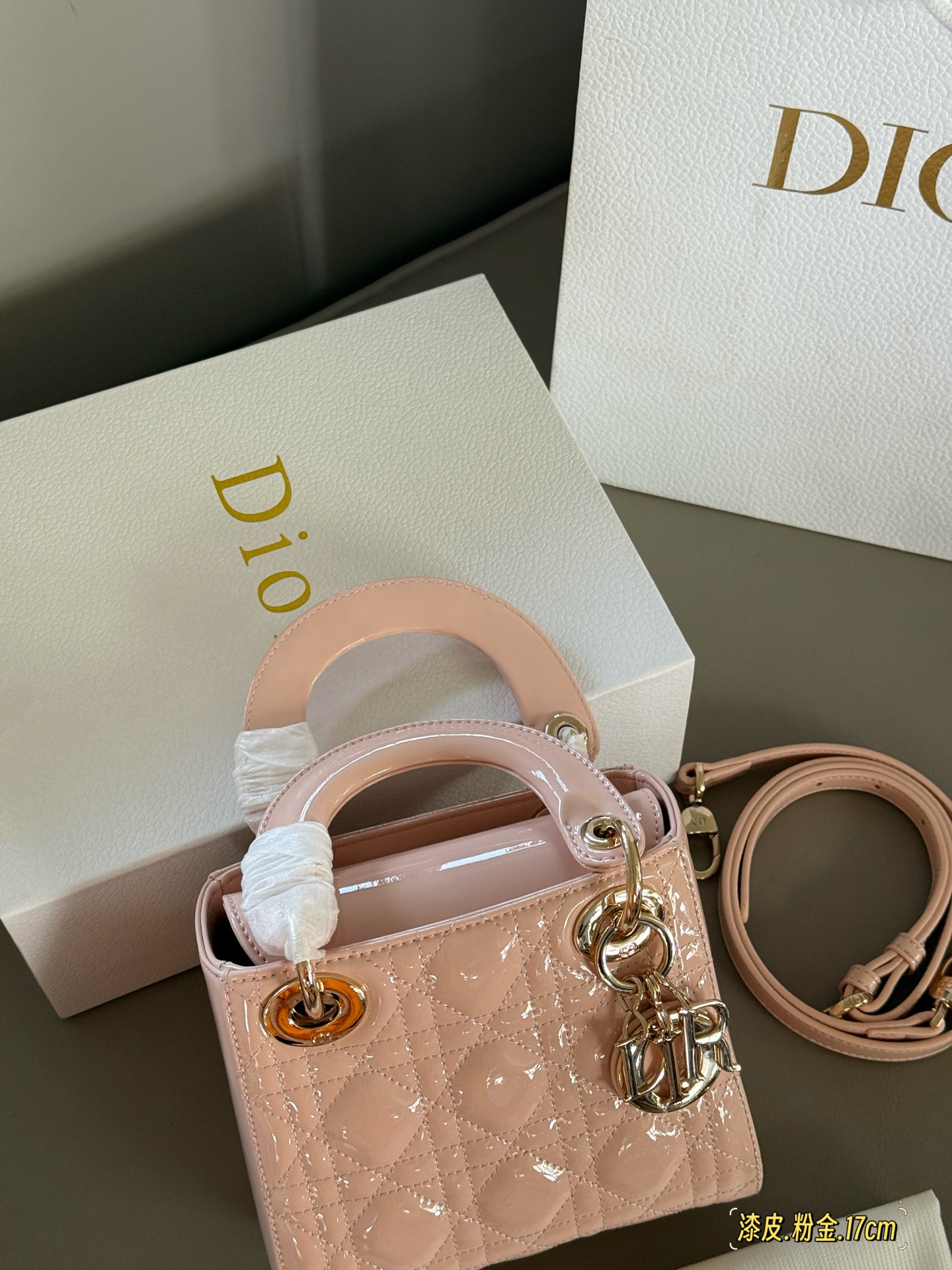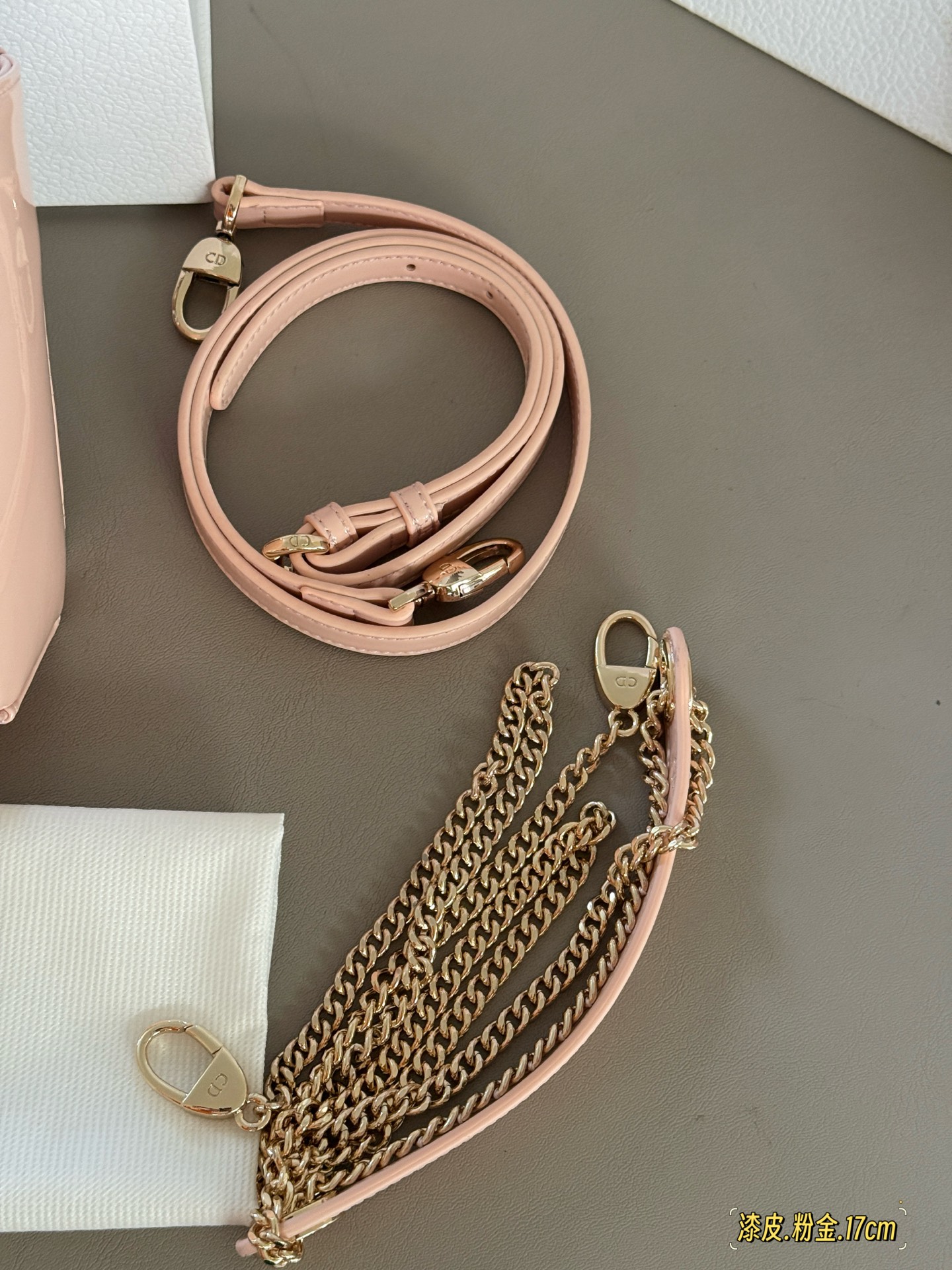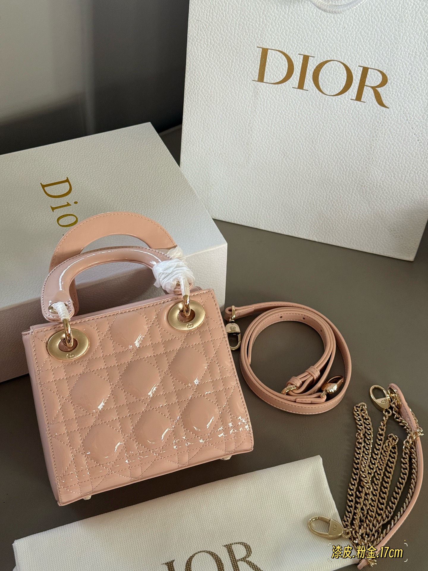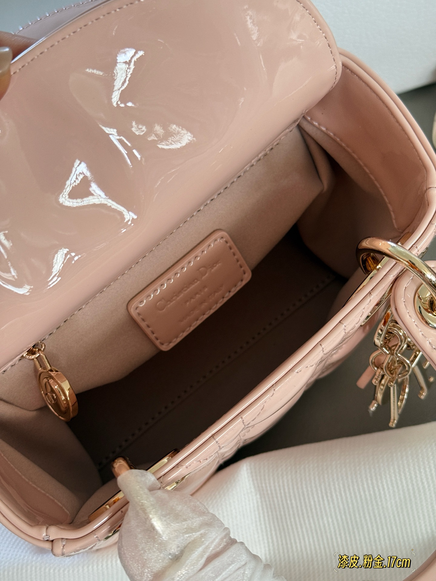 The Dior Lady Dior bag in pale gold patent leather. Iconic design with detachable chain. Perfect for summer. Available in two sizes: 17*15cm & 21*17cm.