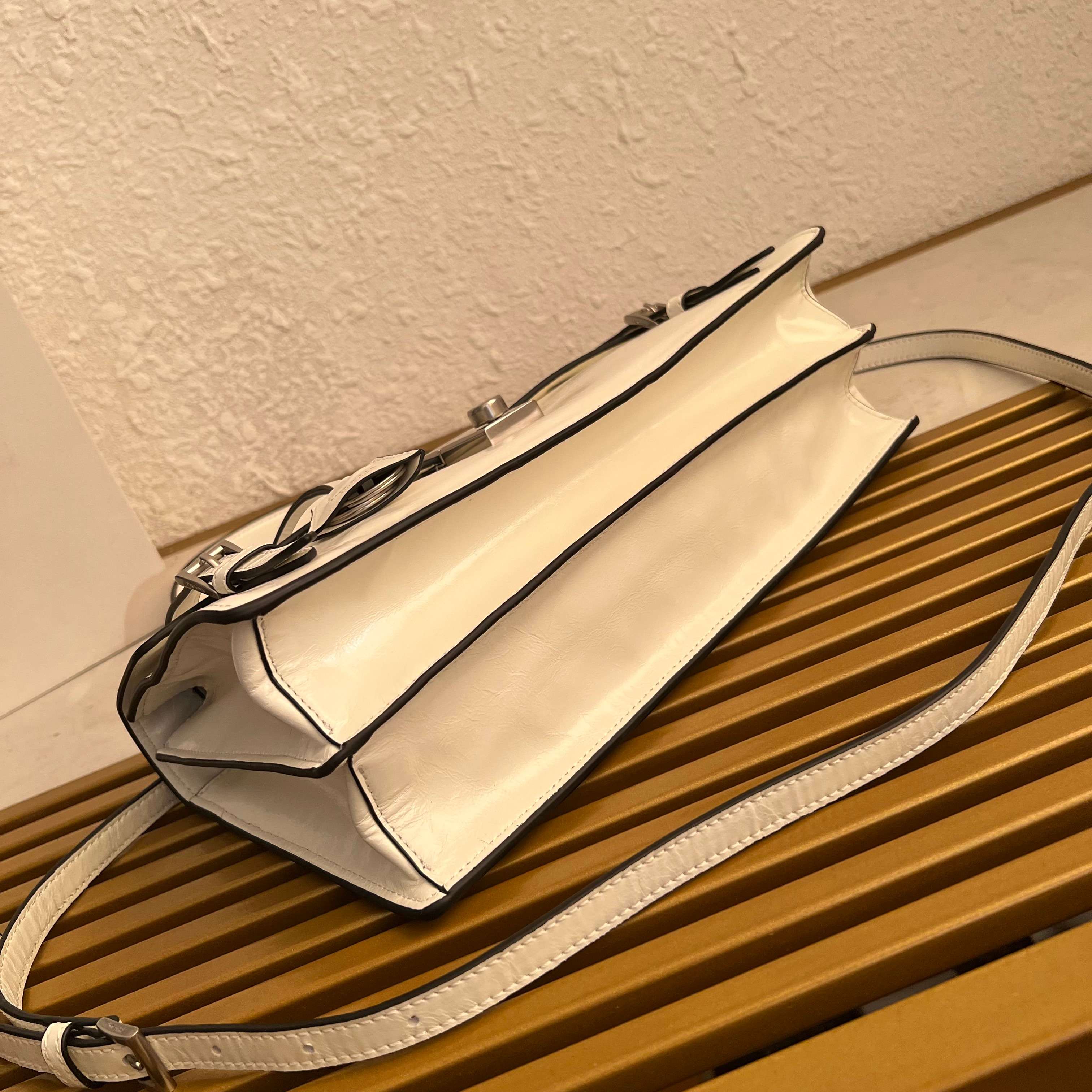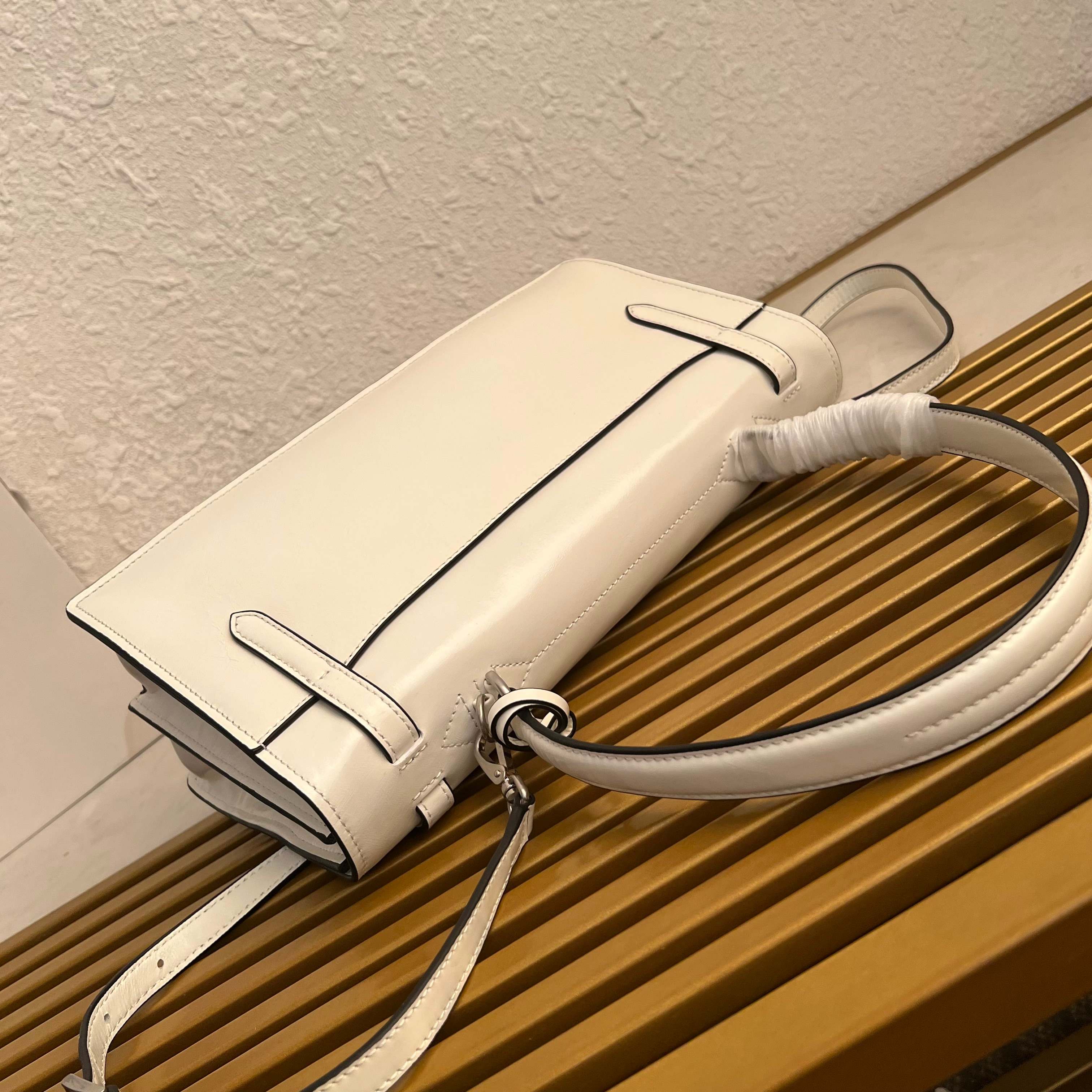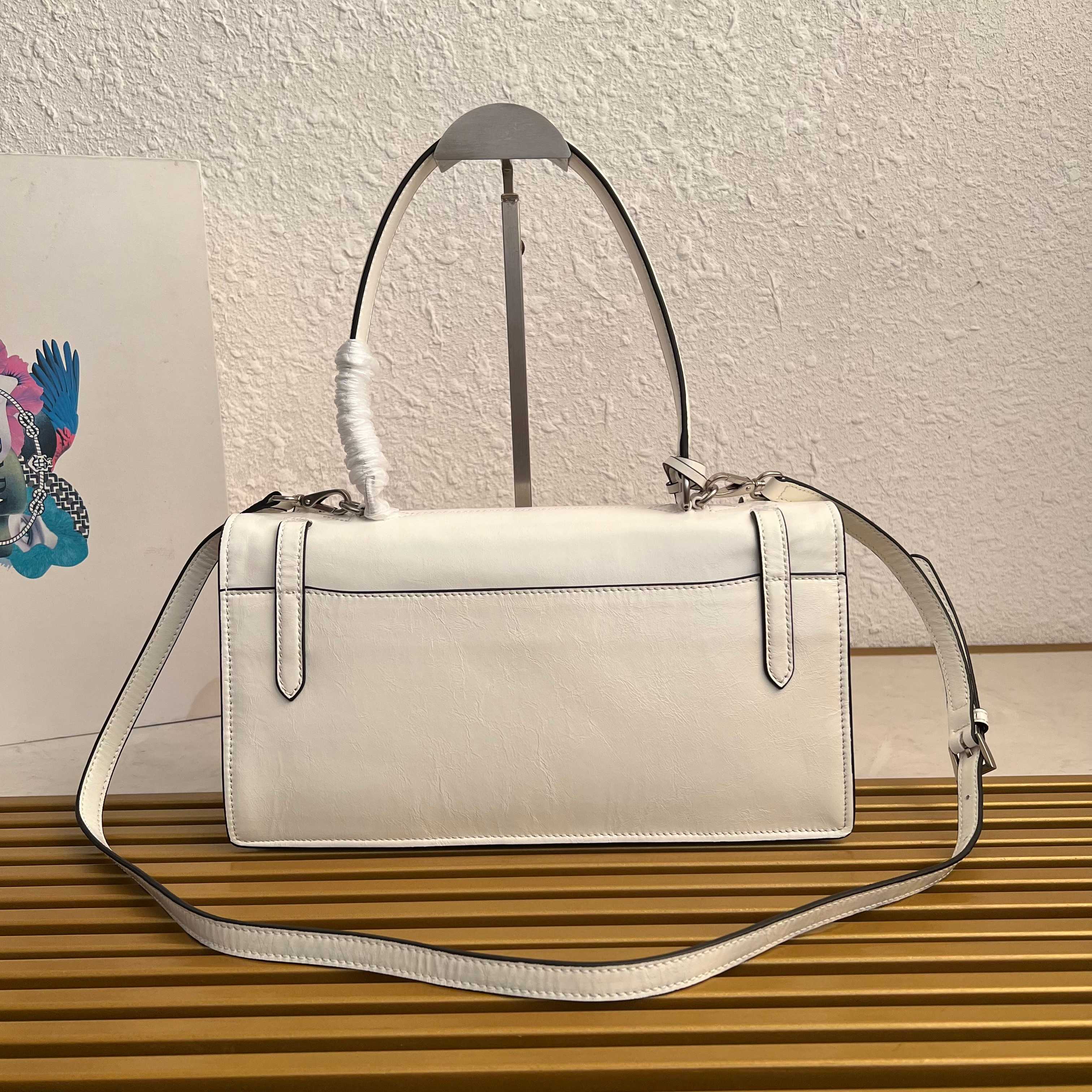 This exquisite leather top handle bag redefines classic elegance with a modern twist. Inspired by the structured silhouette of a traditional briefcase, this bag offers a sophisticated yet versatile accessory. Its refined details and supple leather make it a timeless addition to any wardrobe.