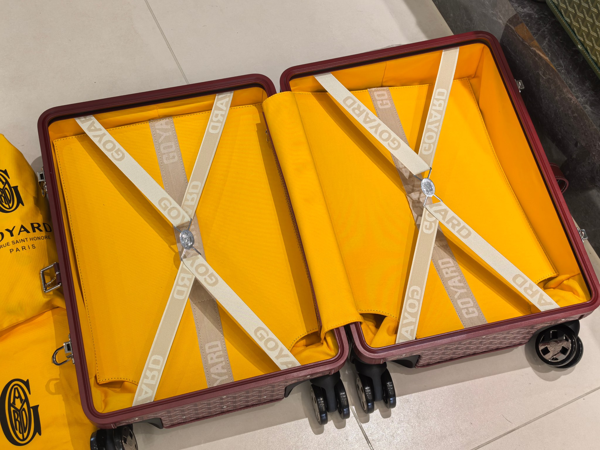 Elevate your travel experience with the Goyard 20-inch cabin trolley suitcase, a true masterpiece of craftsmanship and design. Travel with confidence and style, knowing that you have a piece of luggage as unique as you are.