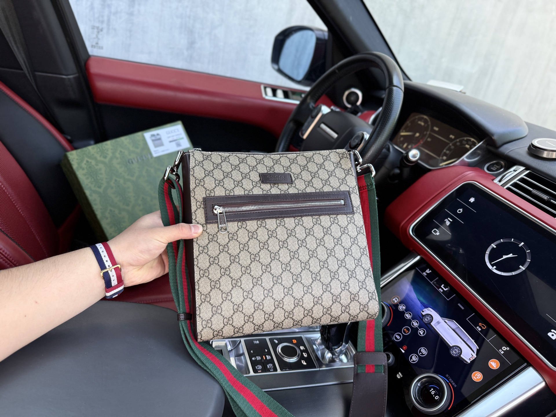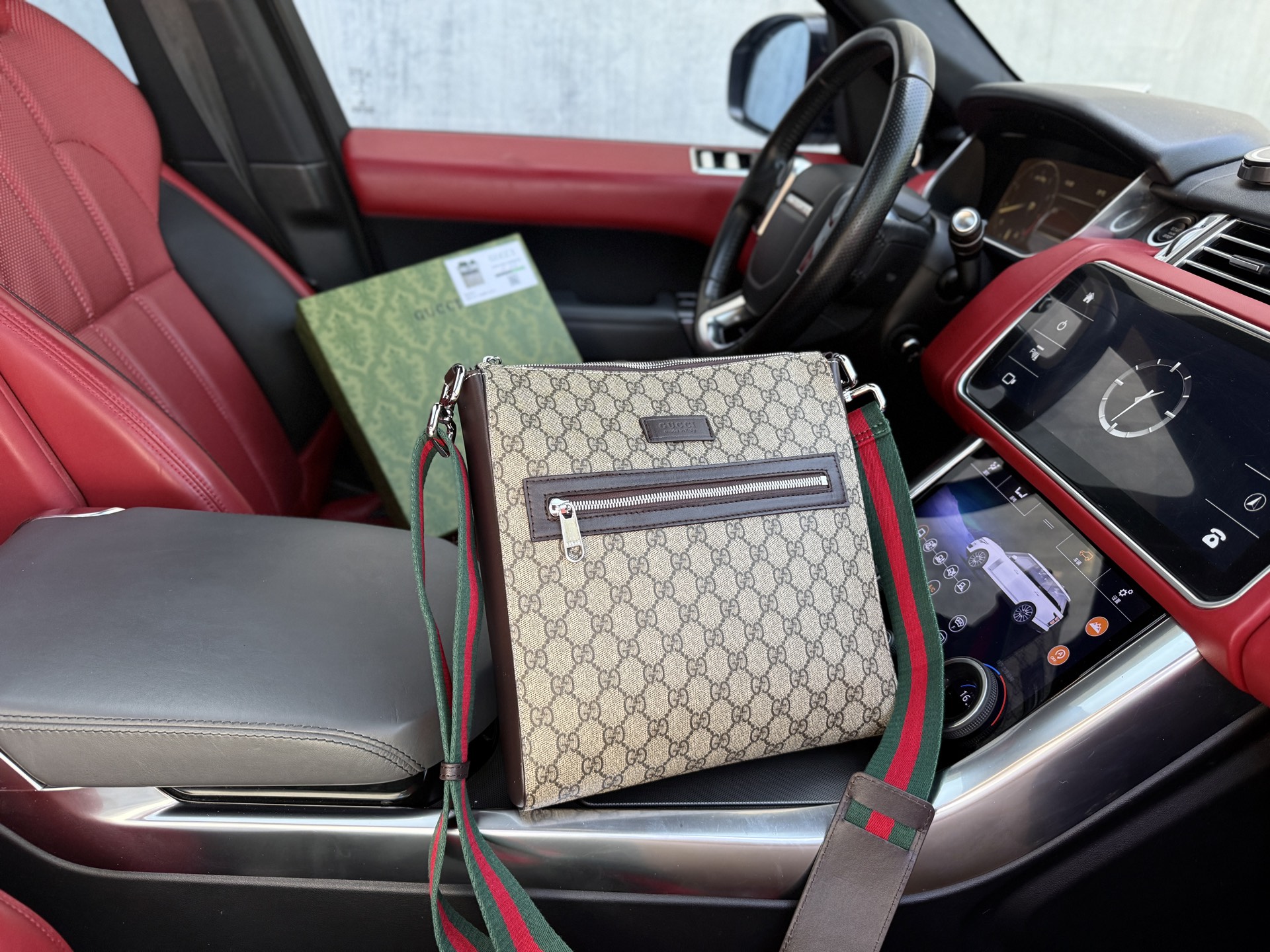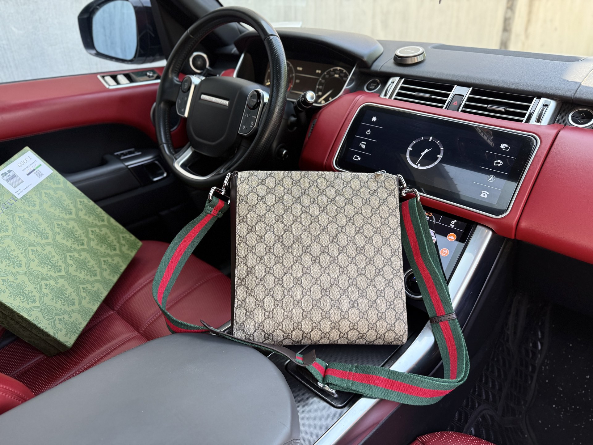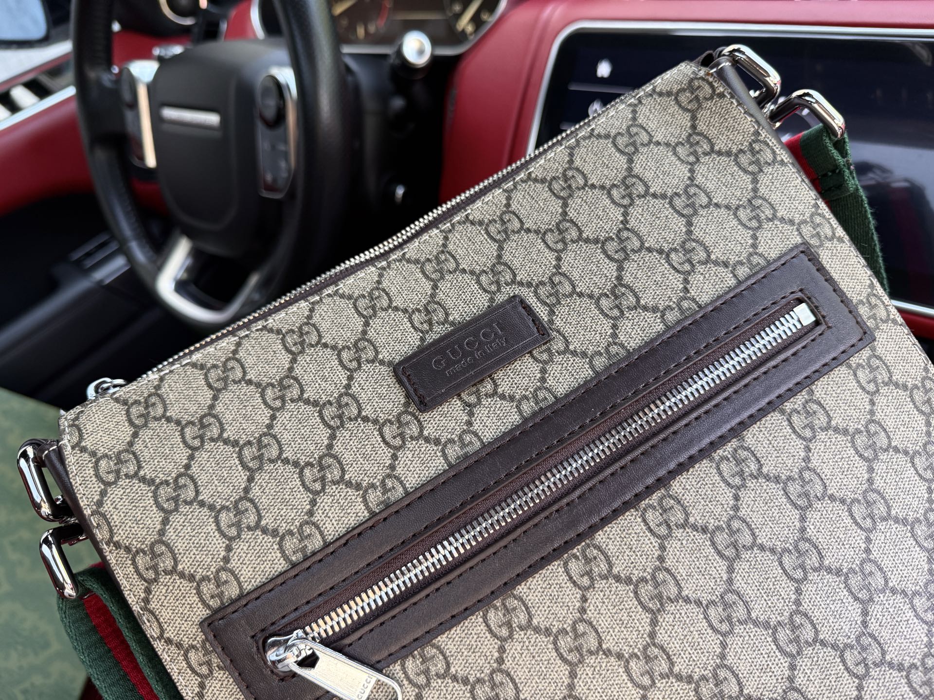 This Gucci messenger bag is a sophisticated accessory for the modern man. It combines iconic design with everyday functionality.