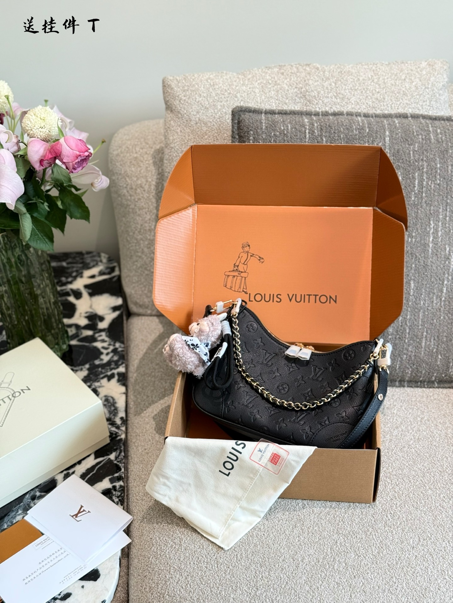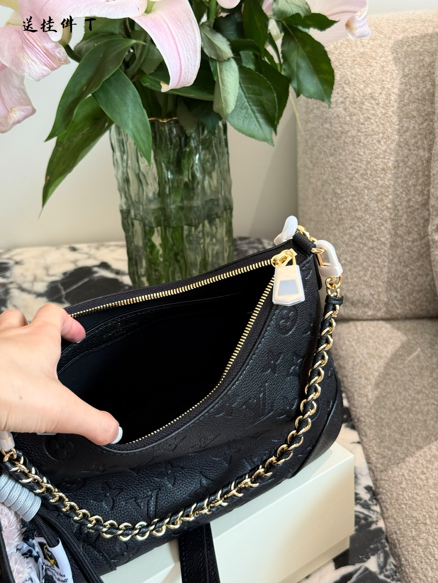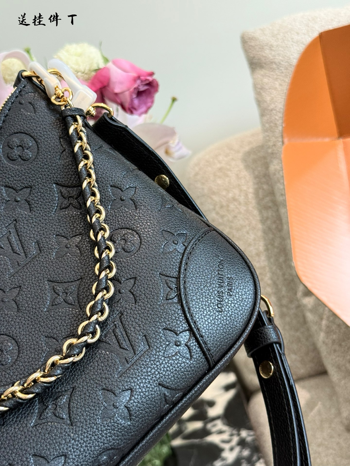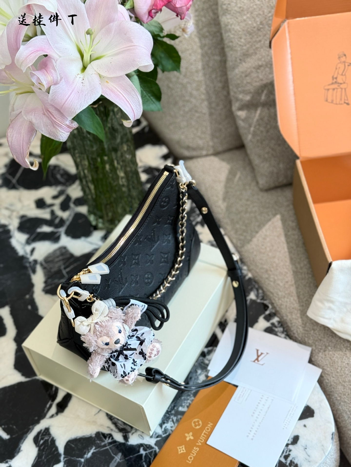 Elevate your style with the 2025 Louis Vuitton Croissant Bag. Crafted from black leather, it features an elegant chain and includes a charming accessory.