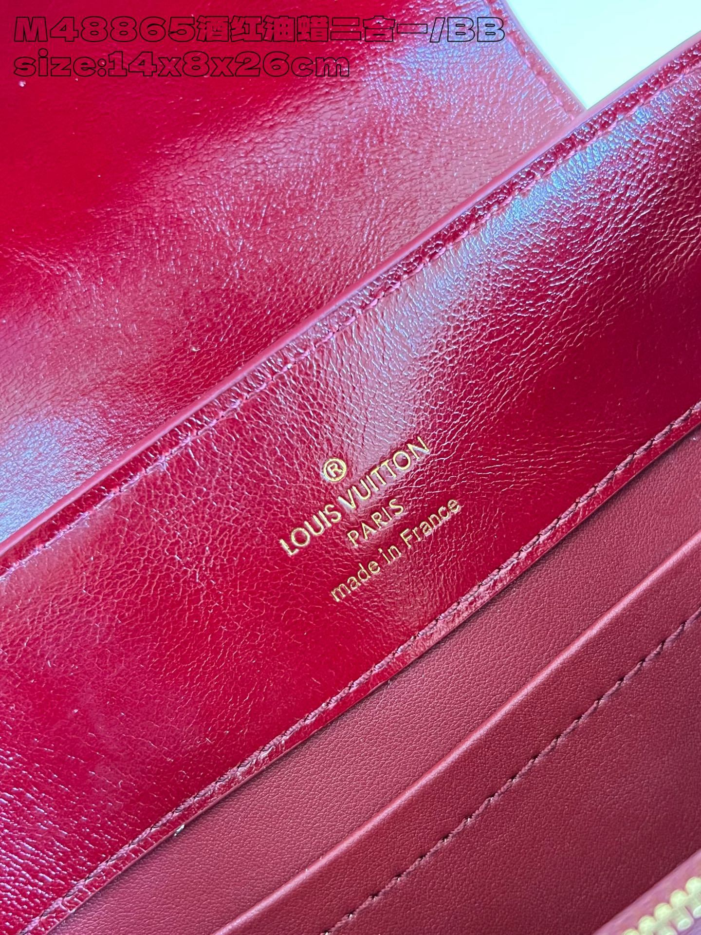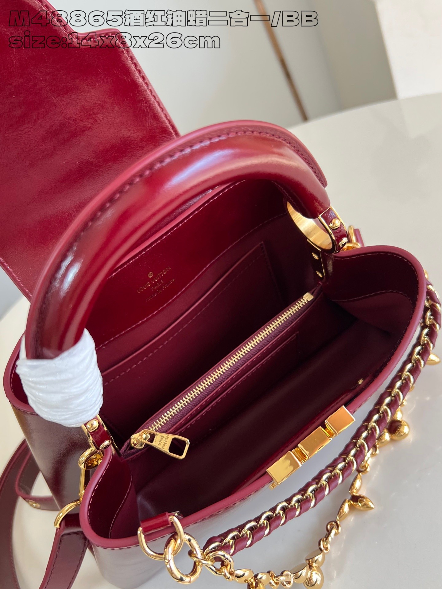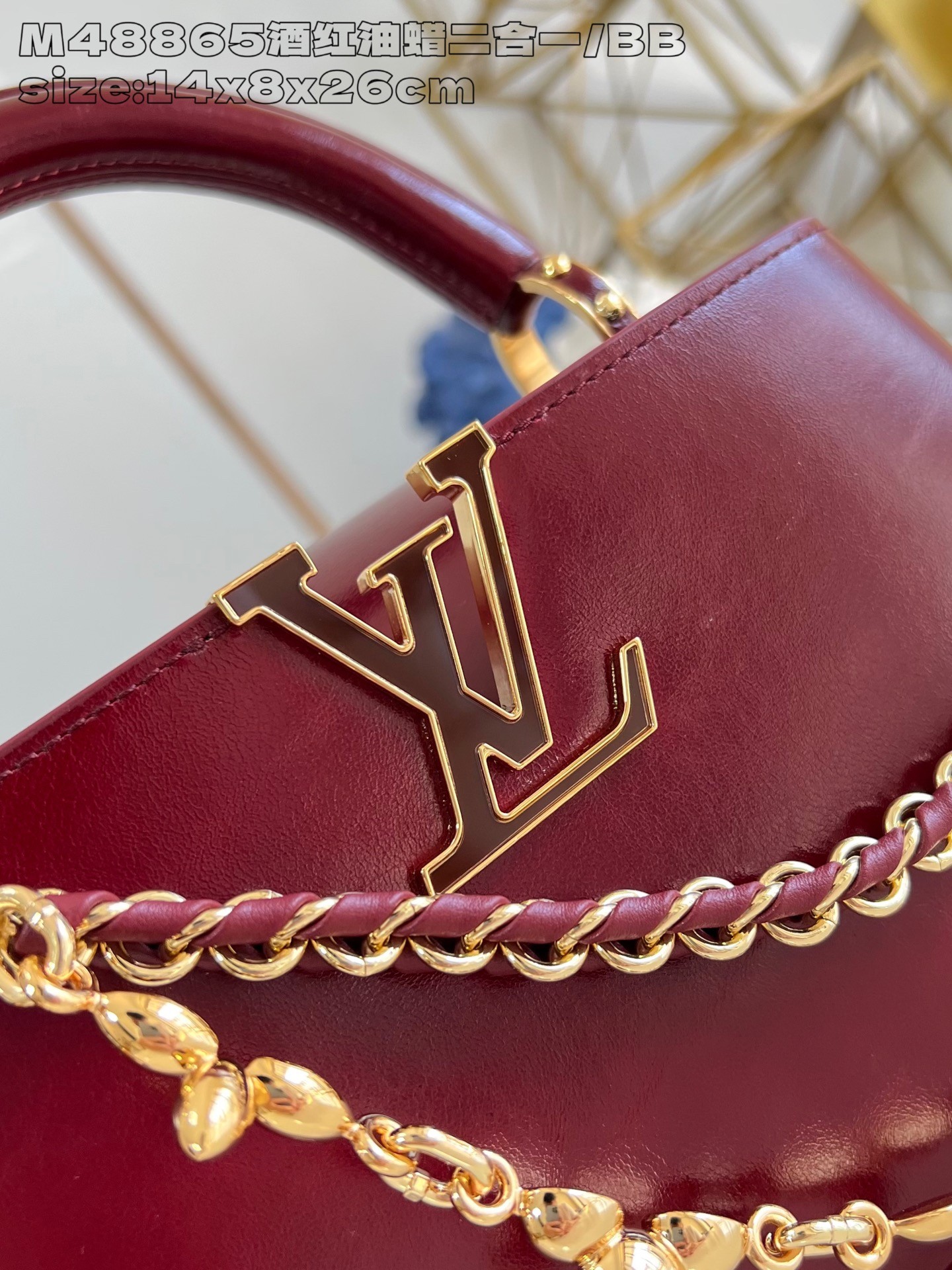 The Capucines East-West BB bag showcases a trendy trapezoid shape and is crafted from burgundy leather. It features gold-tone hardware, including the iconic LV logo and a decorative chain. This bag is a versatile accessory suitable for various occasions.