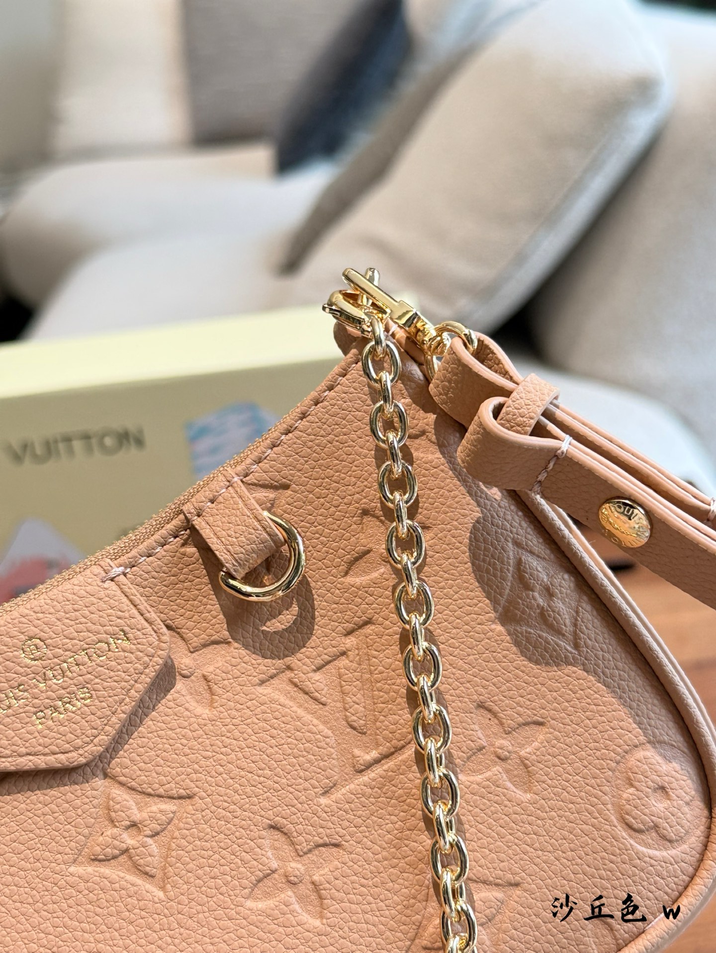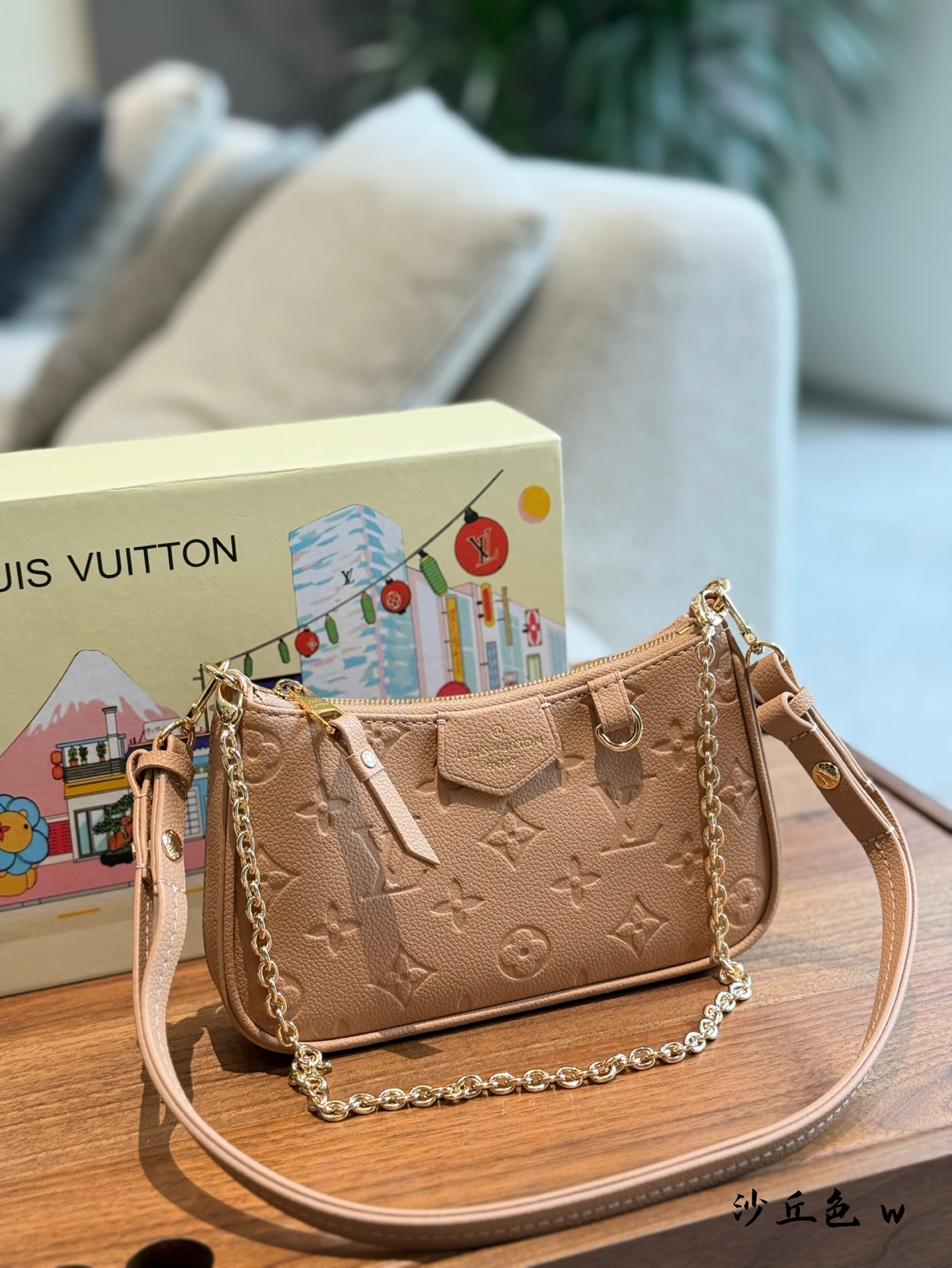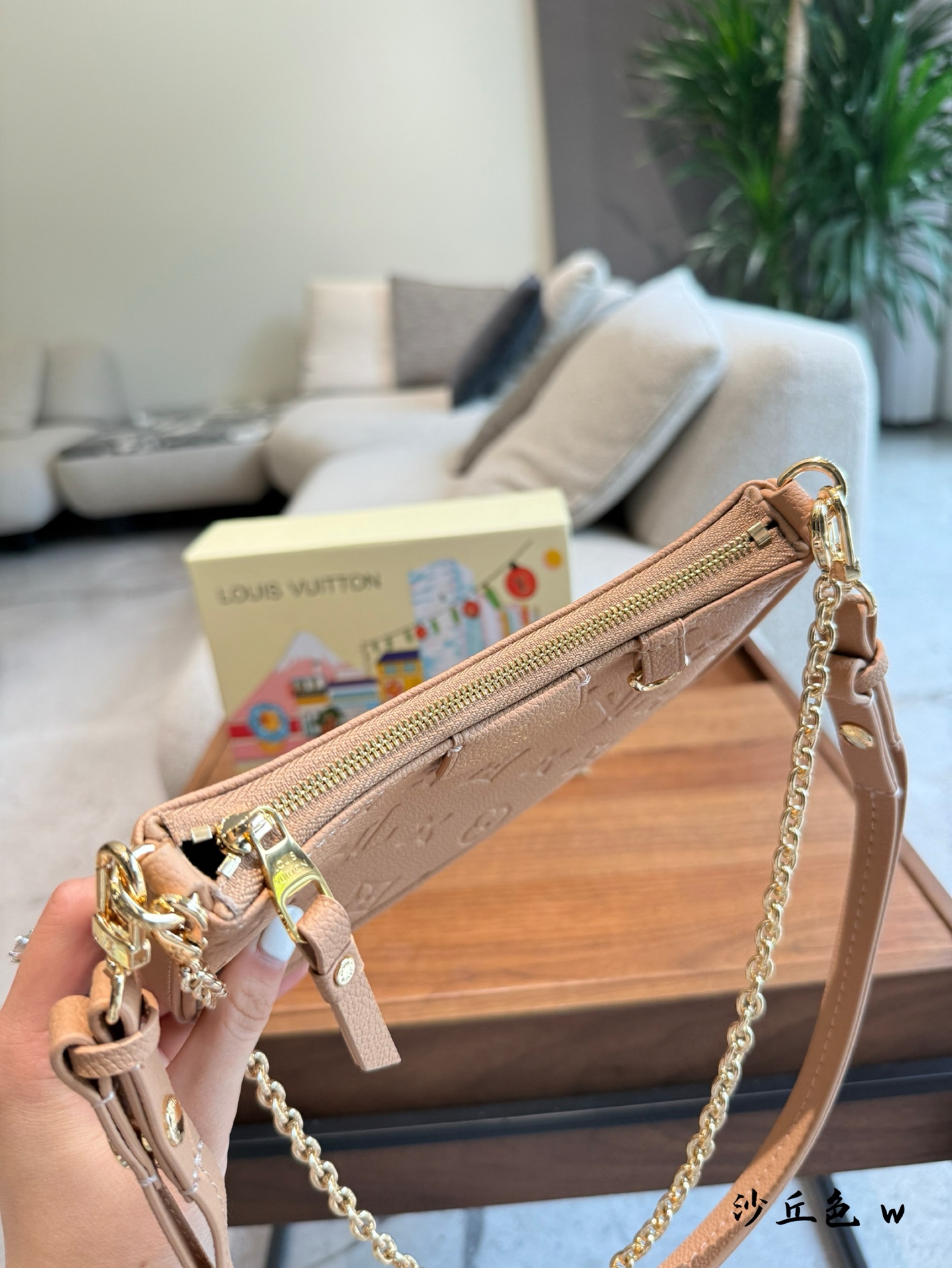 The Louis Vuitton Easy Pouch offers elegance and versatility. Wear it as a shoulder bag, crossbody, or carry by hand with the gold chain.