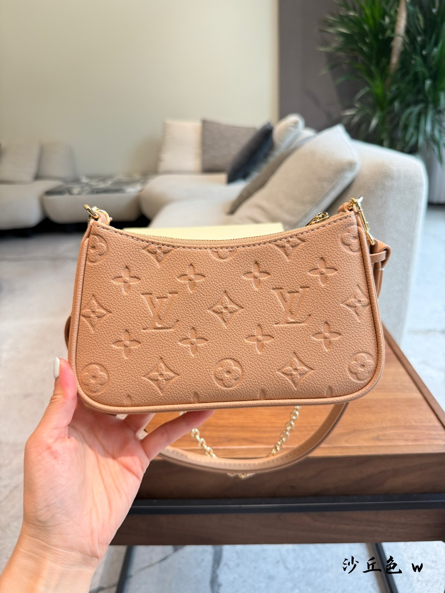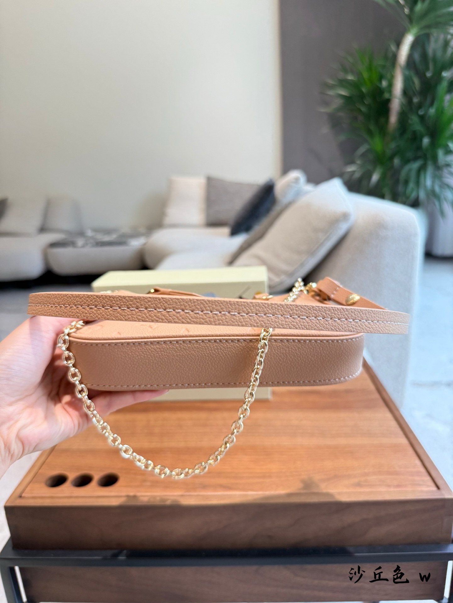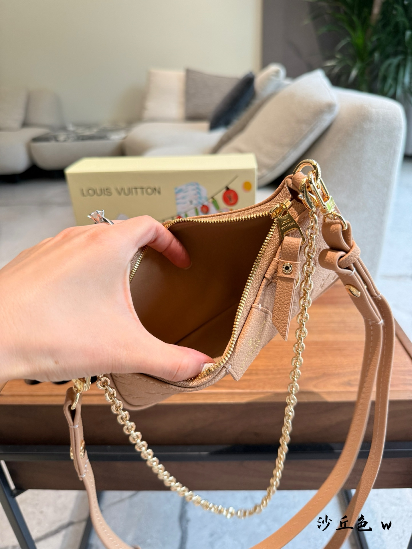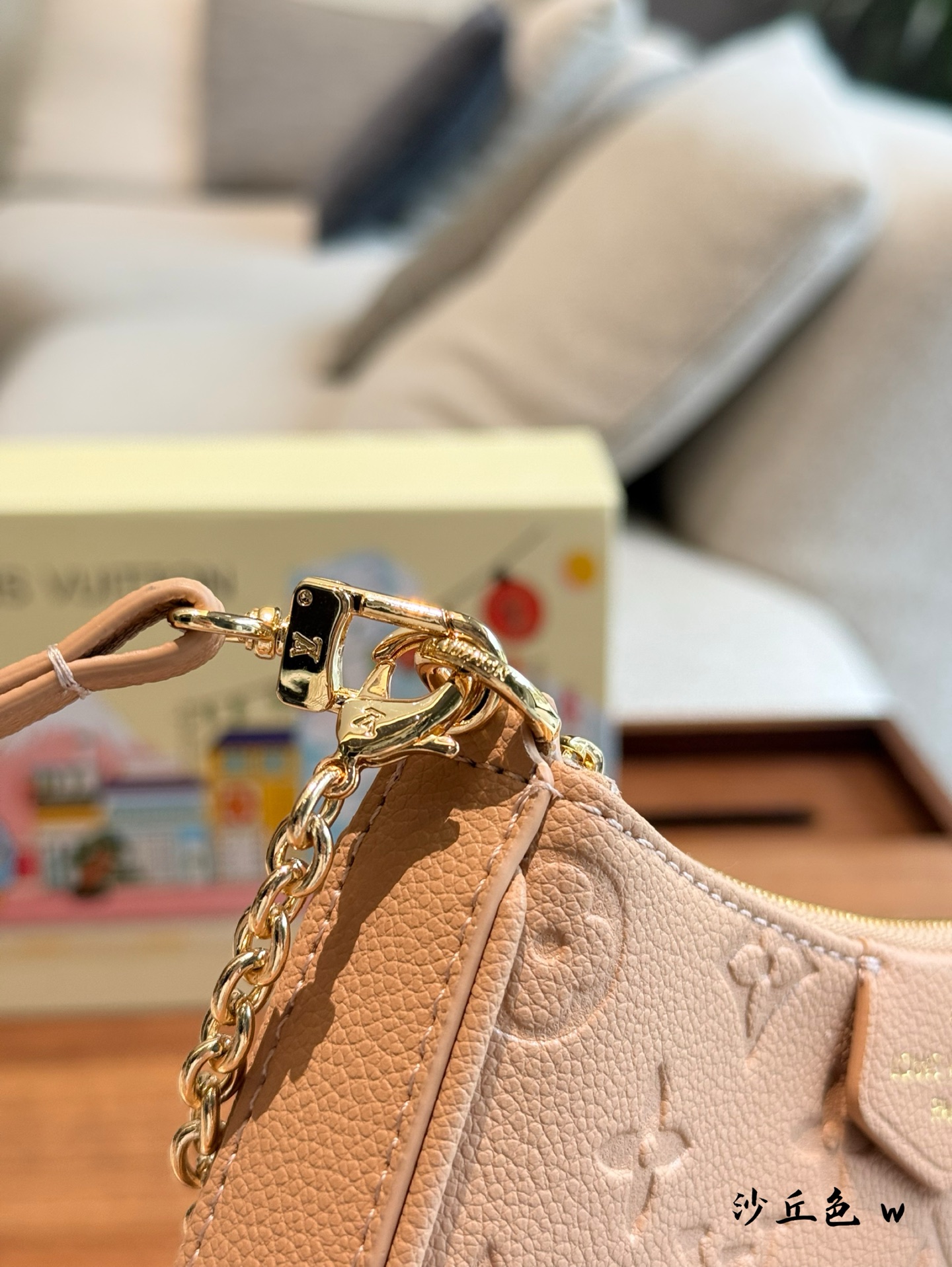 The Louis Vuitton Easy Pouch offers elegance and versatility. Wear it as a shoulder bag, crossbody, or carry by hand with the gold chain.