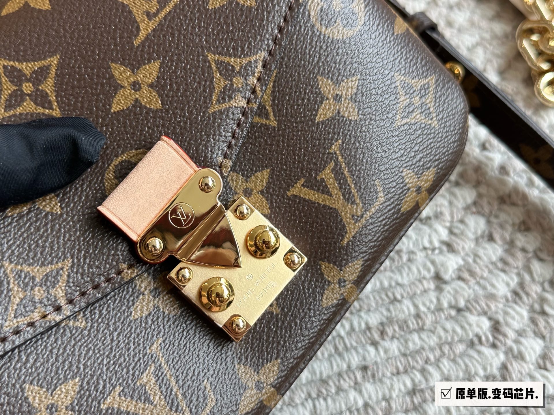Chic Louis Vuitton Metis crossbody bag in classic monogram canvas. Features a stylish gold-tone chain and secure lock closure. Ideal for everyday elegance.
