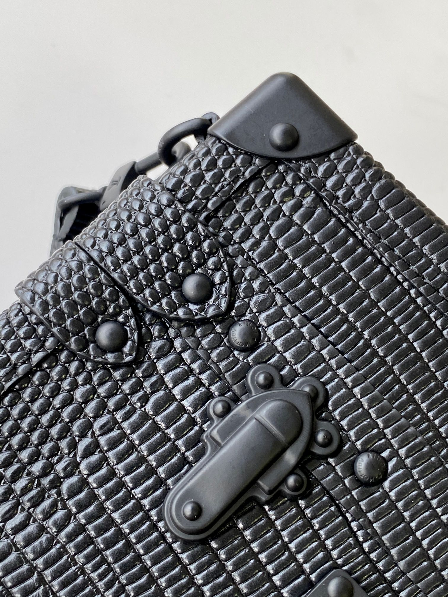 Elevate your style with this Louis Vuitton Petite Malle bag. Crafted from black lizard leather, it's perfect for evening outings. Size: 20x12.5x6cm.