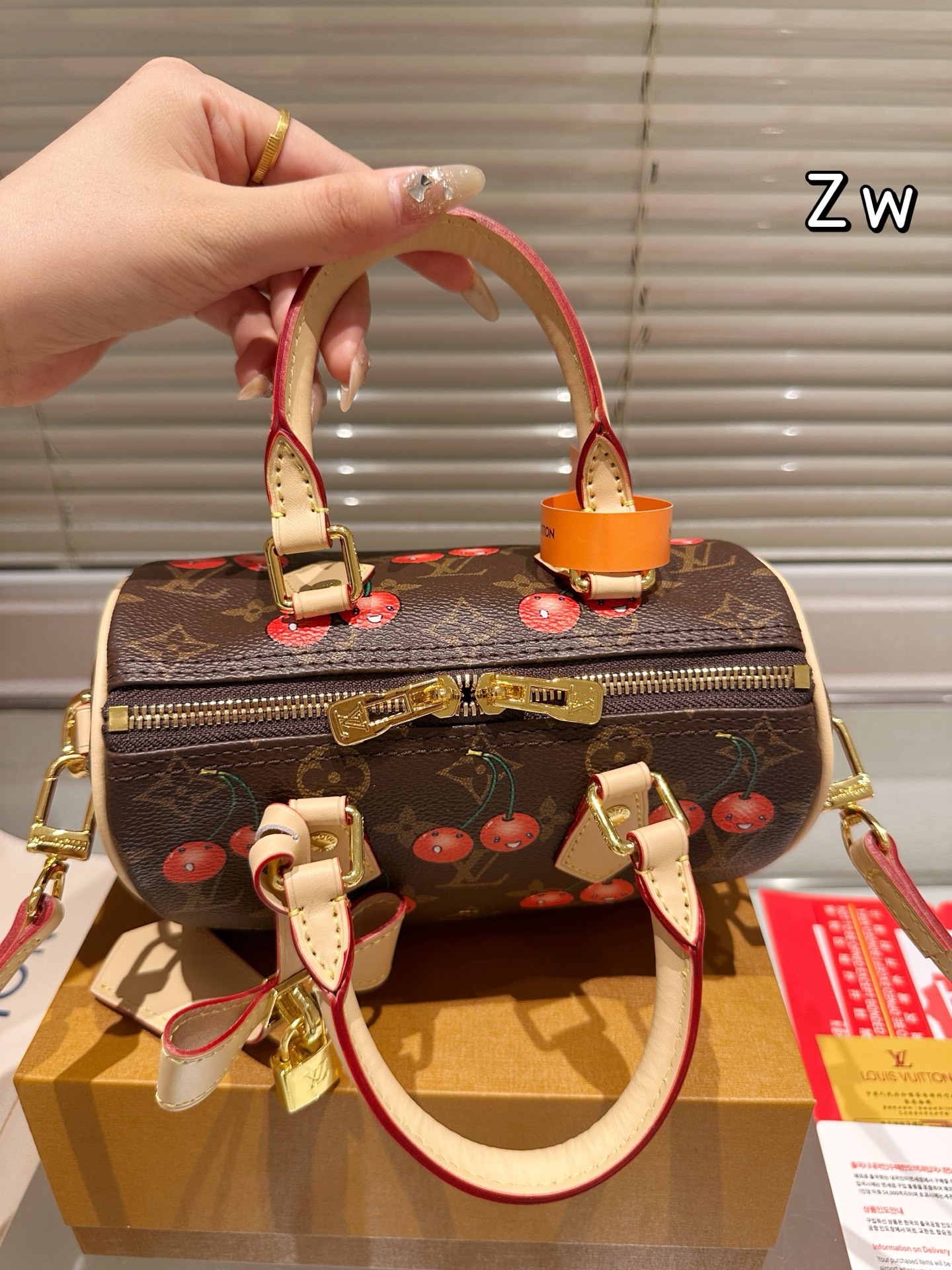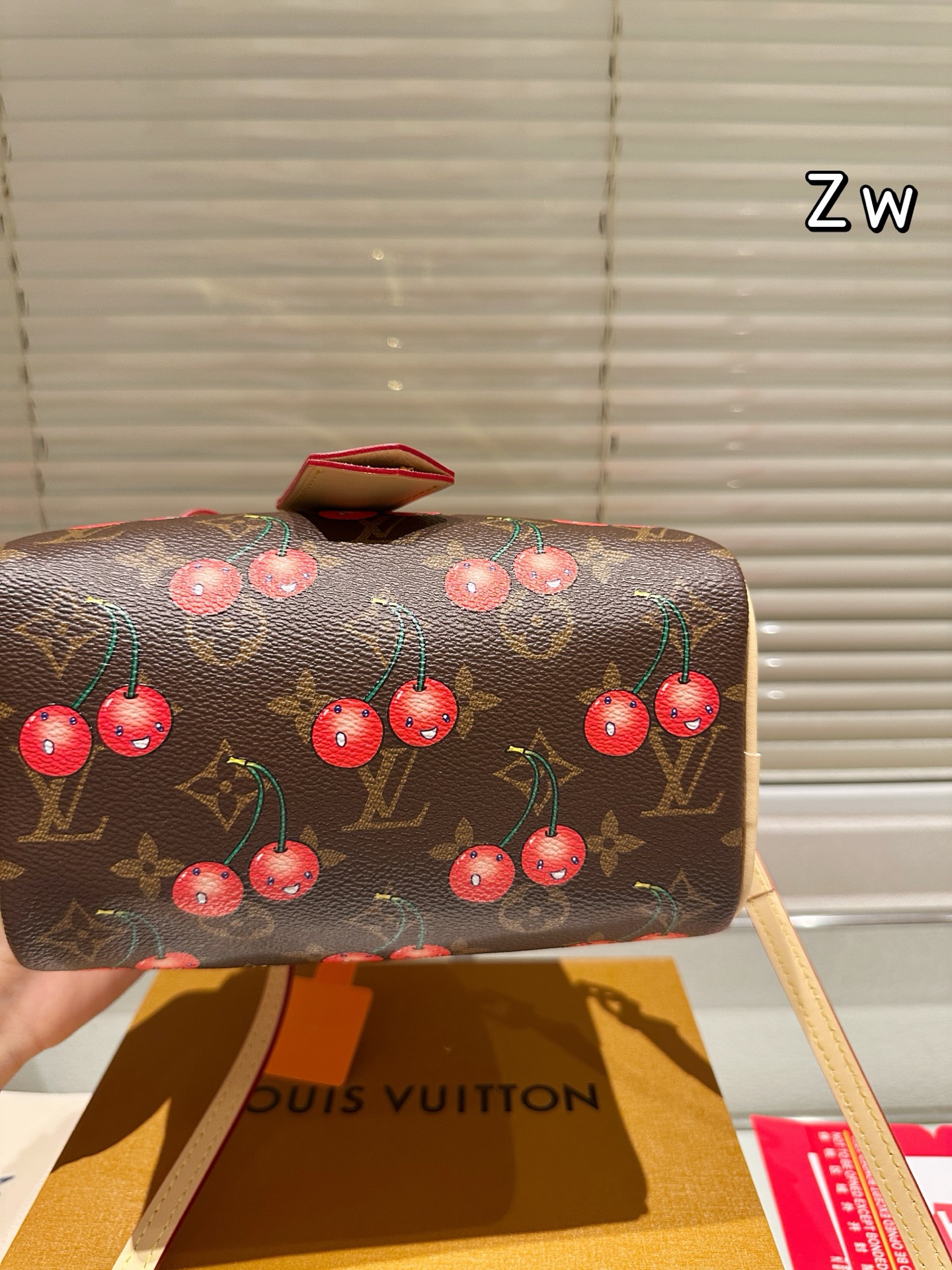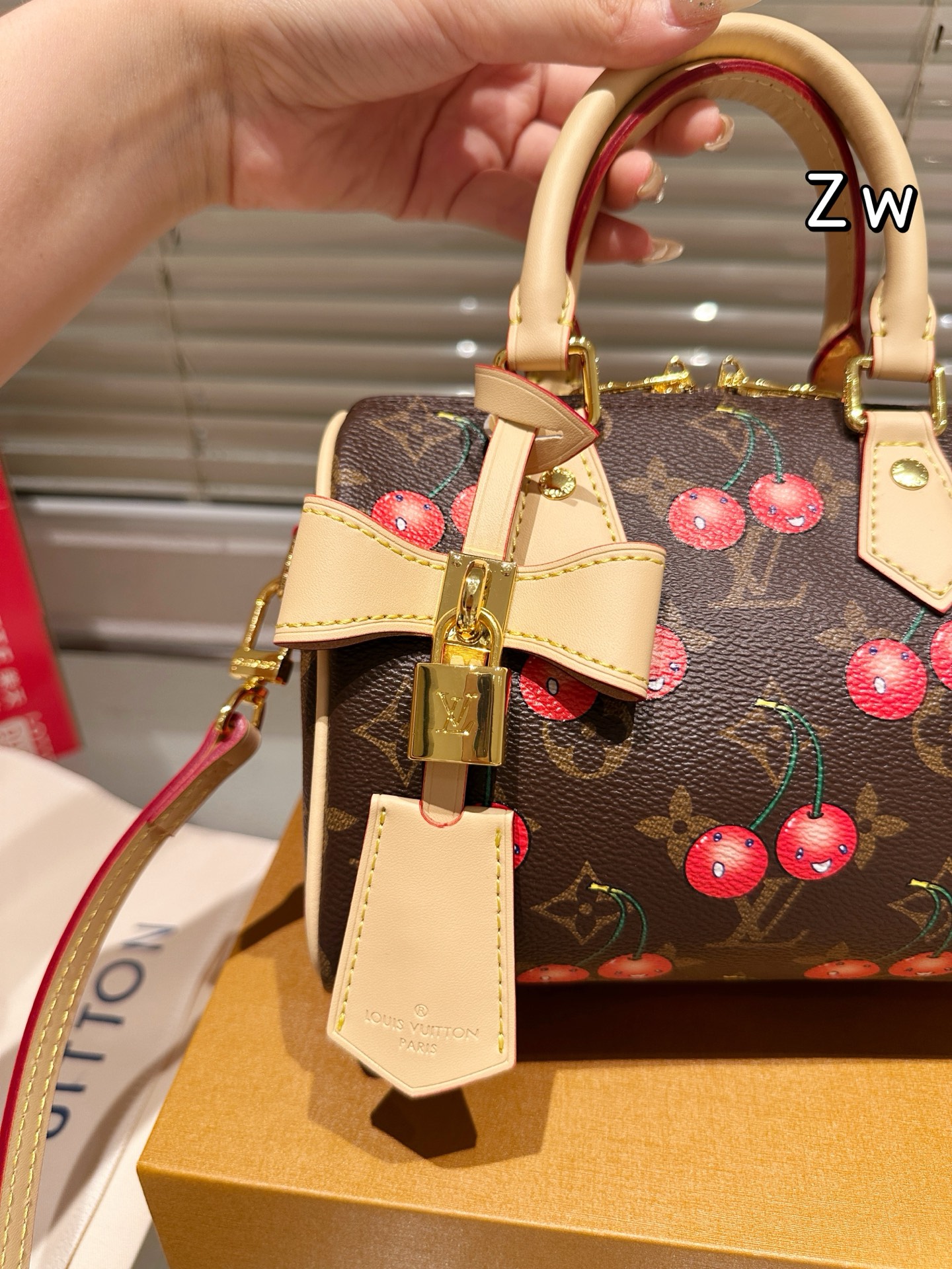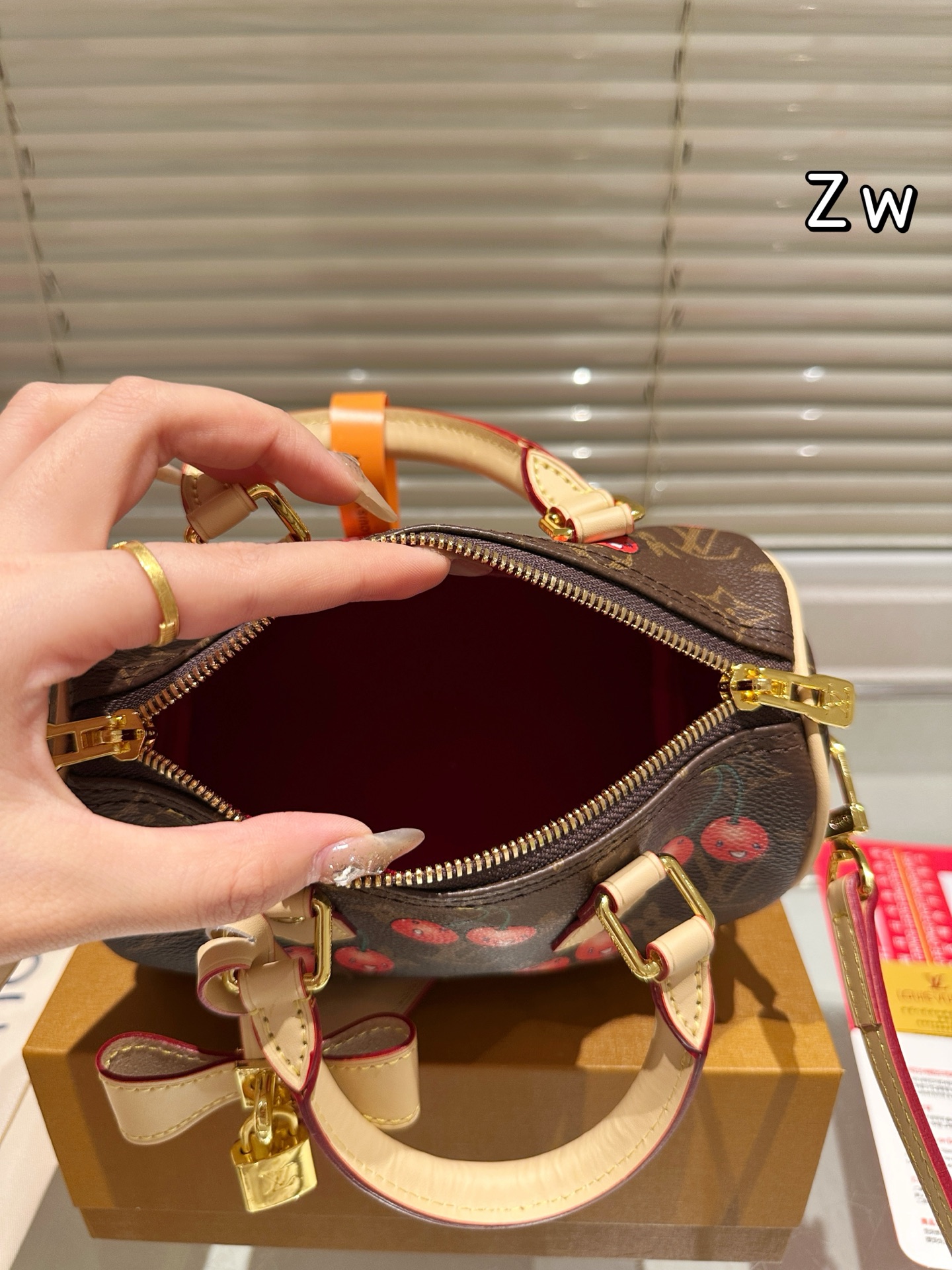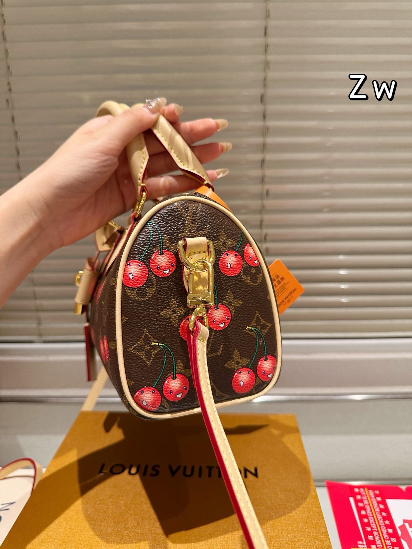 Louis Vuitton Speedy Nano pillow bag with cherry print. Classic Speedy style with iconic monogram canvas and detachable strap. Size: 20x16cm.
