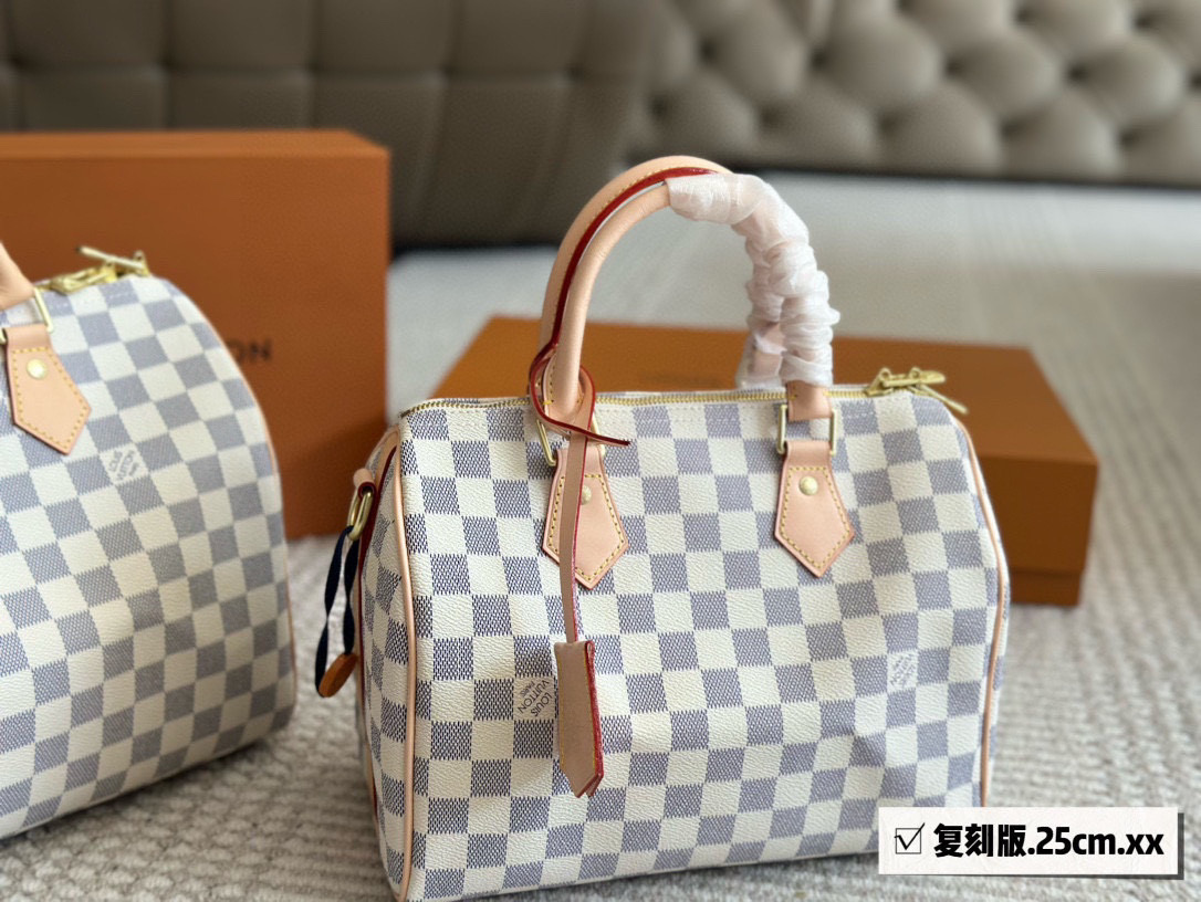 The Louis Vuitton Speedy Bandouliere in Damier Azur canvas is a stylish and versatile bag. Available in 25cm,it features a removable interior.