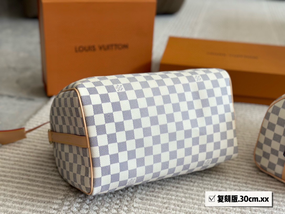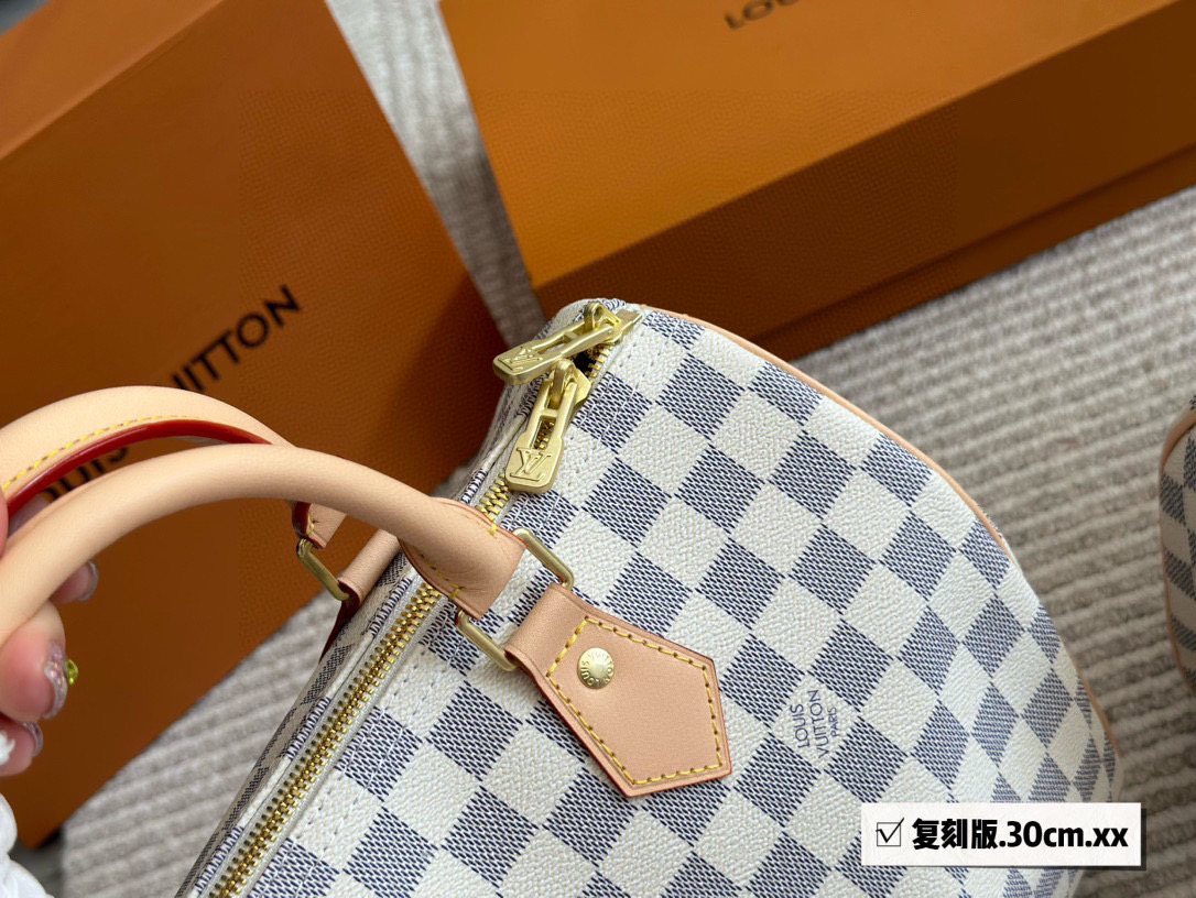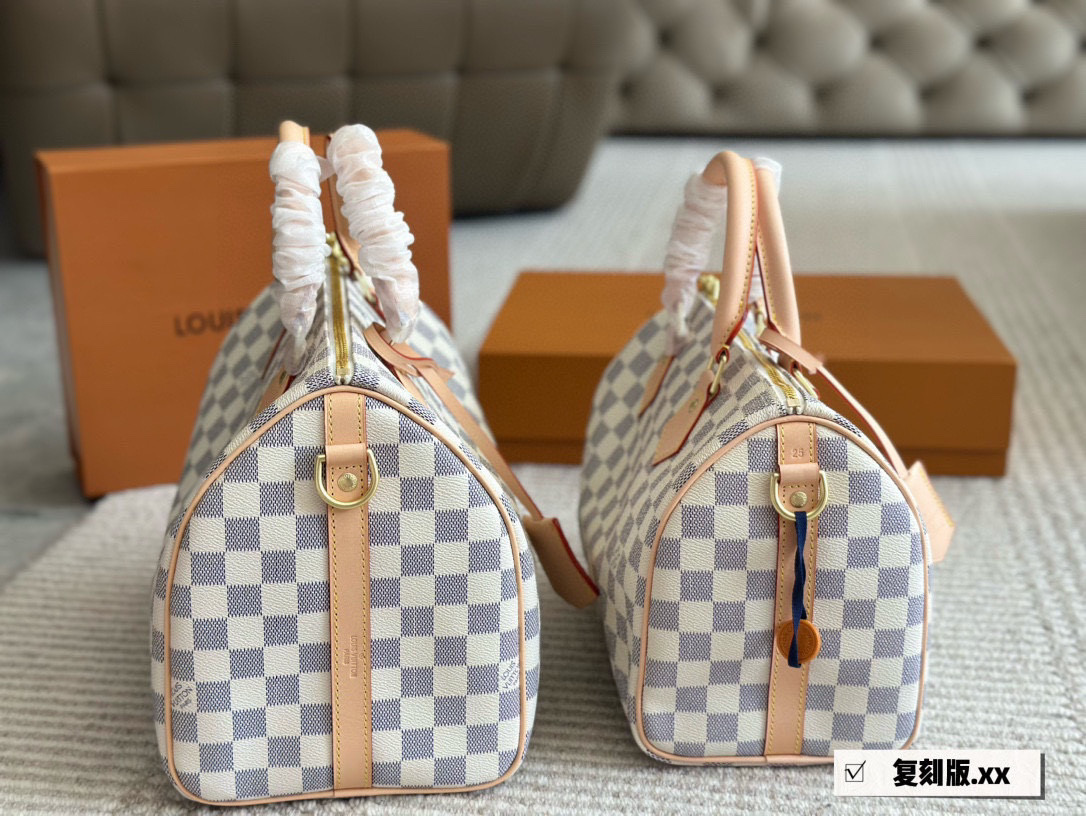 The Louis Vuitton Speedy Bandouliere in Damier Azur canvas is a timeless and iconic handbag, renowned for its elegant design and versatile functionality.