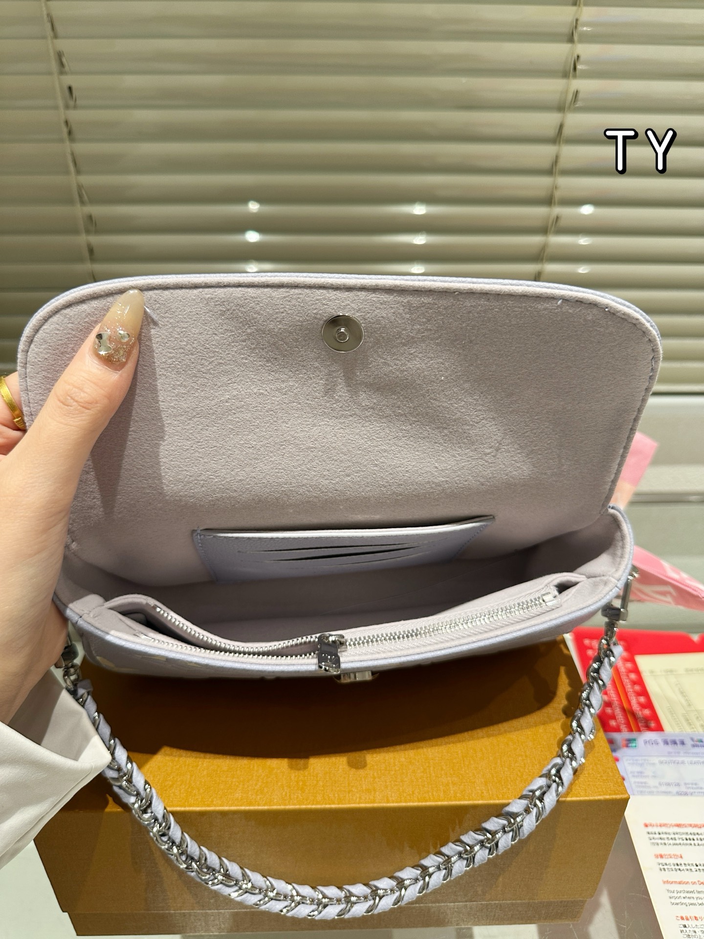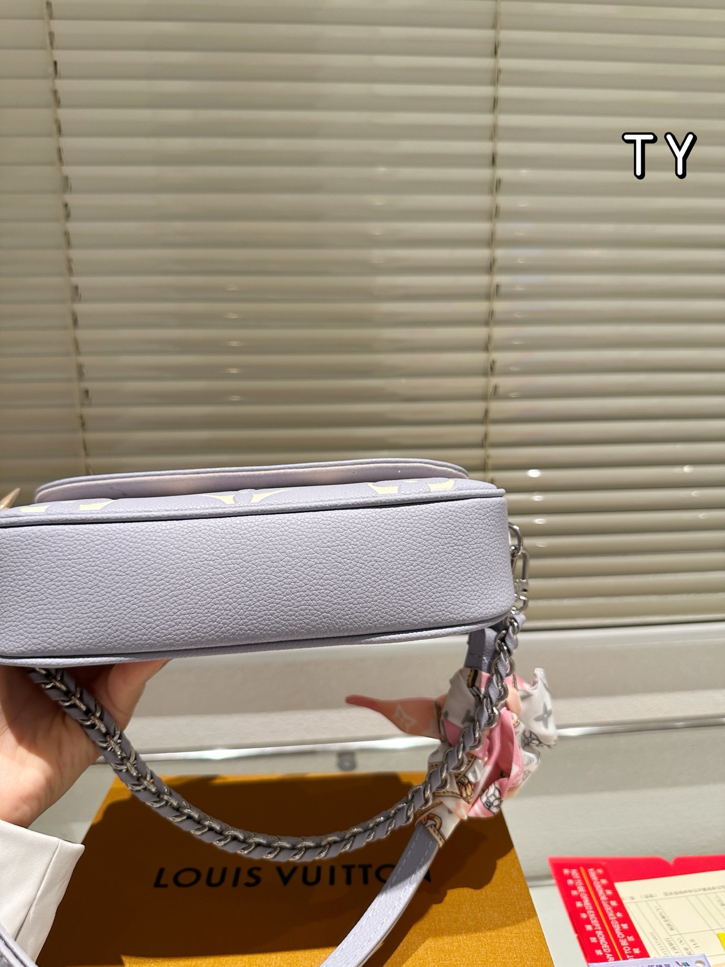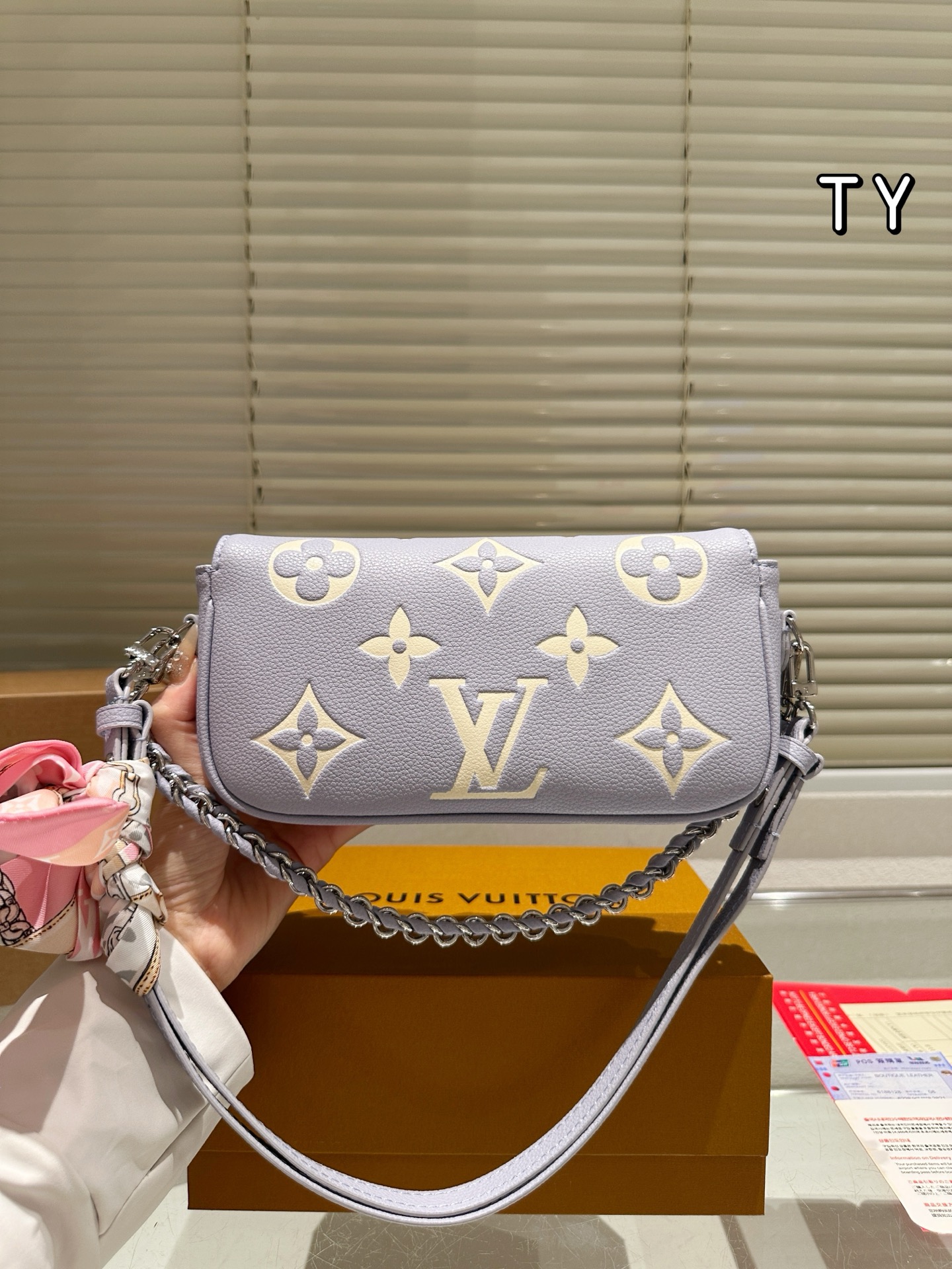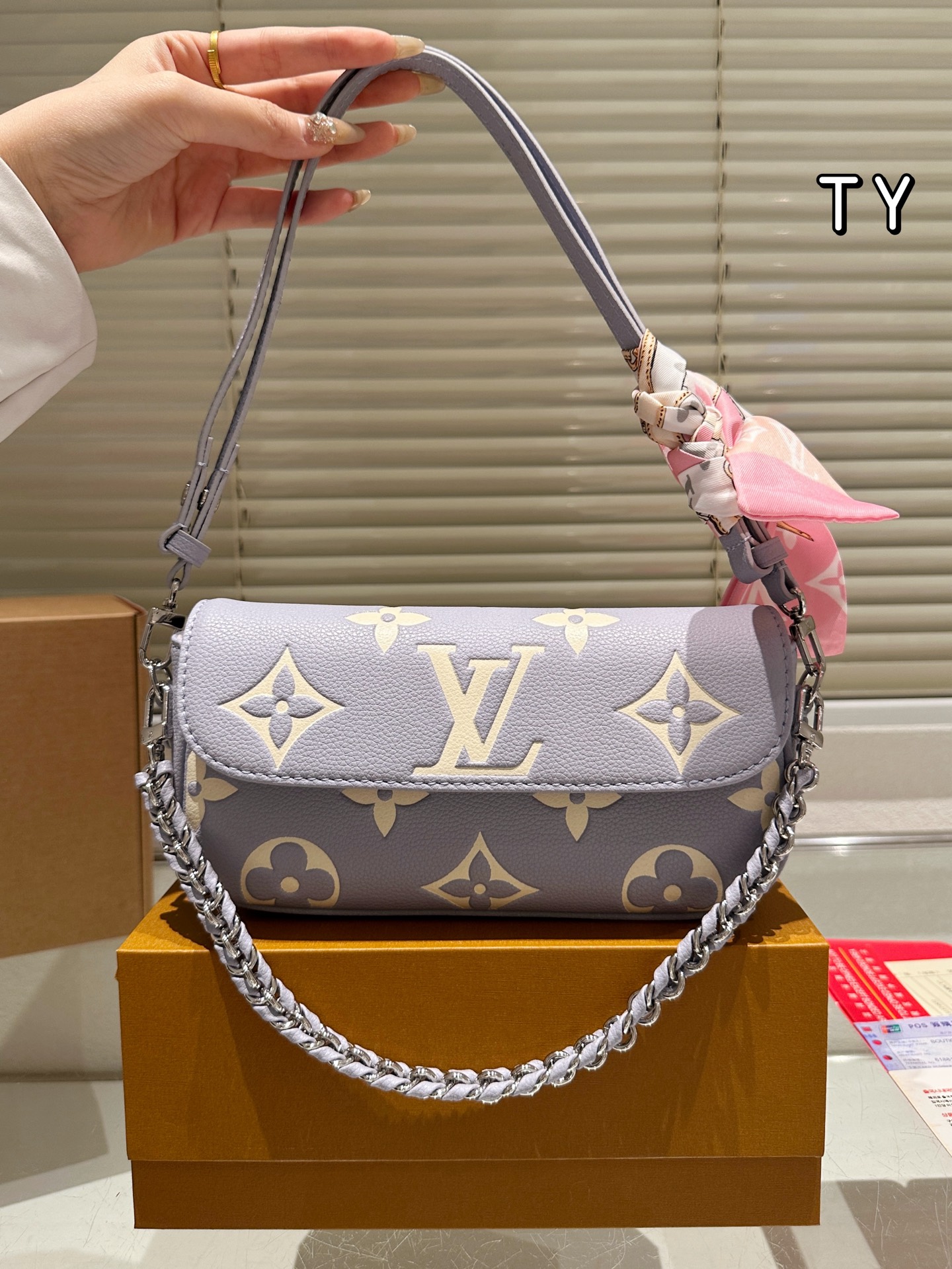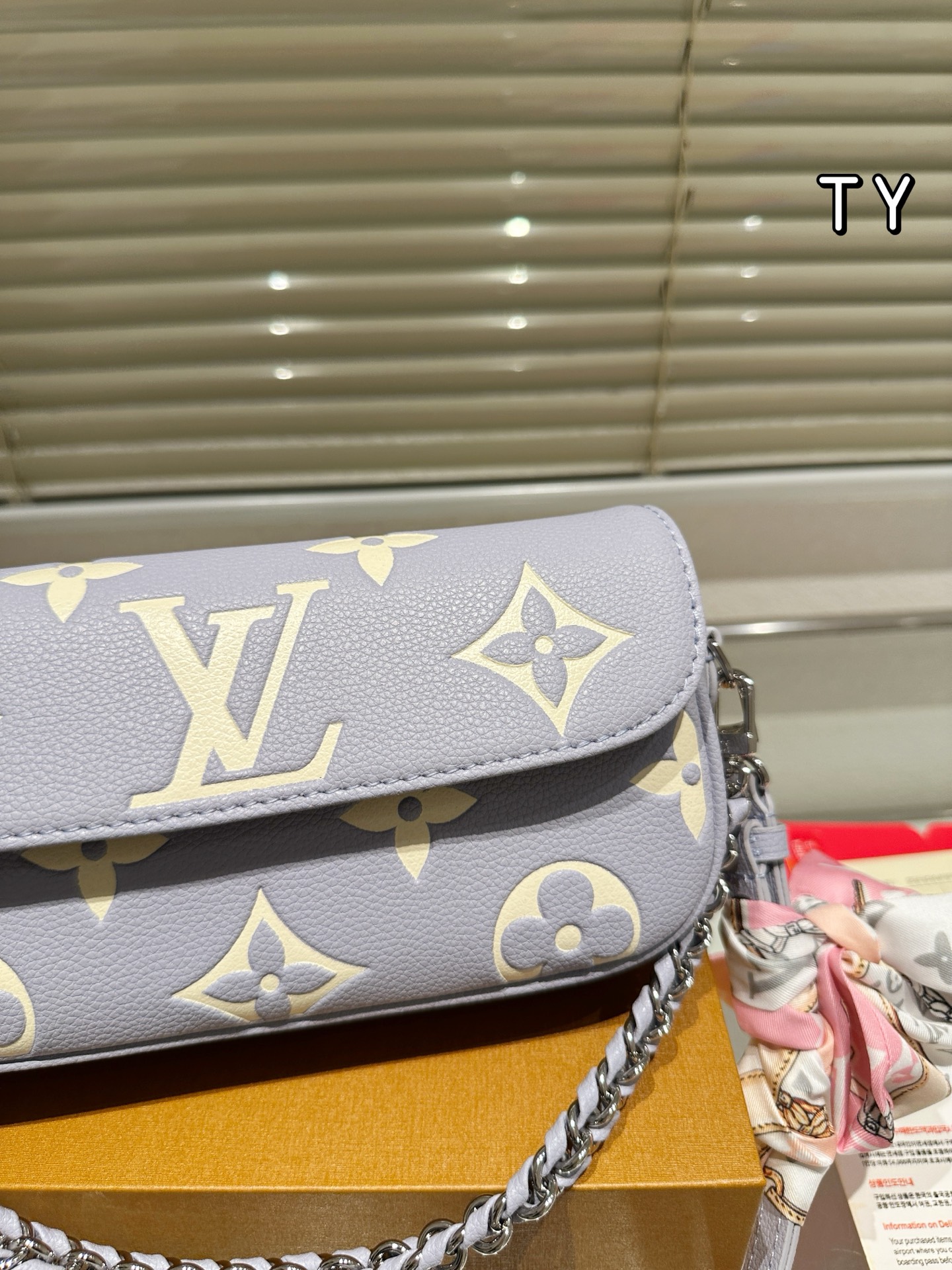 Elevate your style with the Louis Vuitton WALLET ON CHAIN IVY bag. This stylish crossbody features a chic design and includes a decorative scarf.