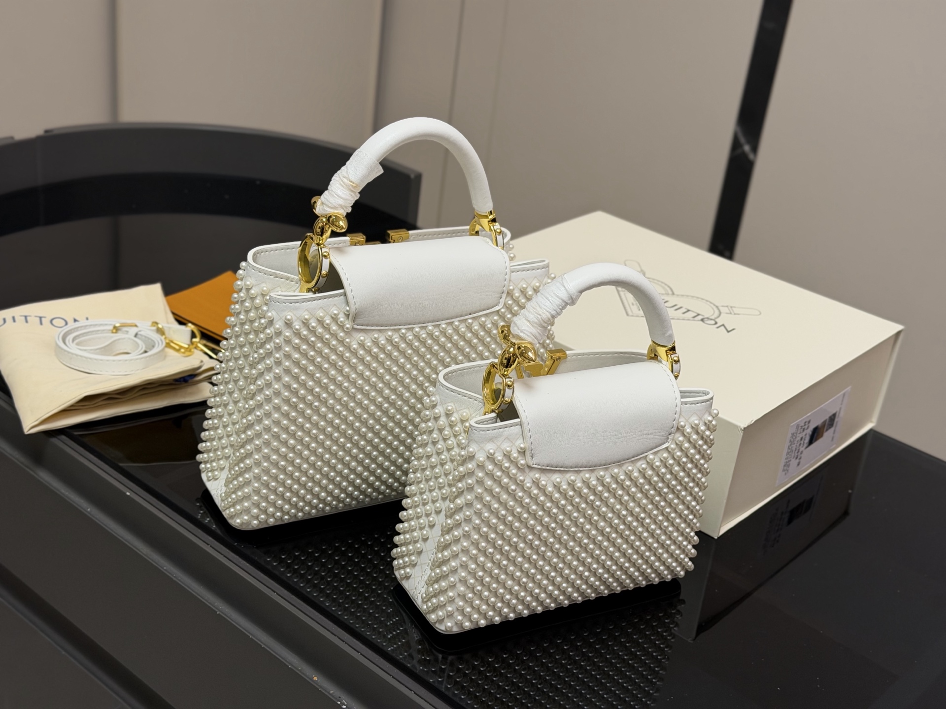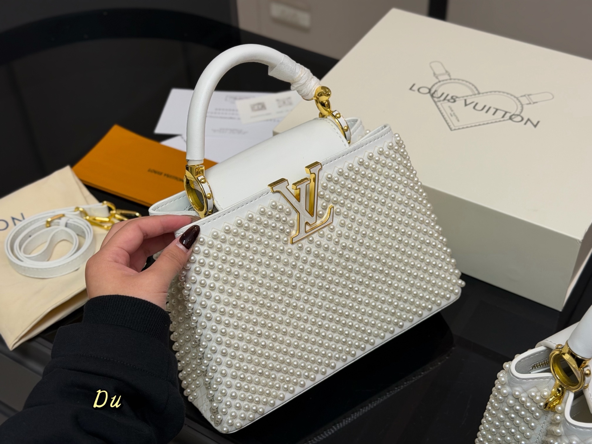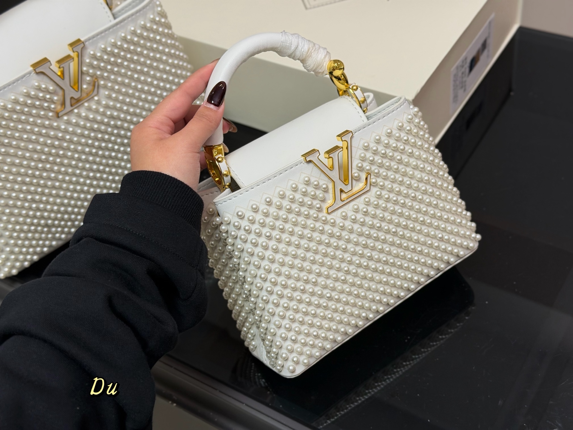 Indulge in luxury with the LV Capucines handbag. Crafted from Taurillon leather and adorned with delicate pearls, this bag exudes timeless elegance.