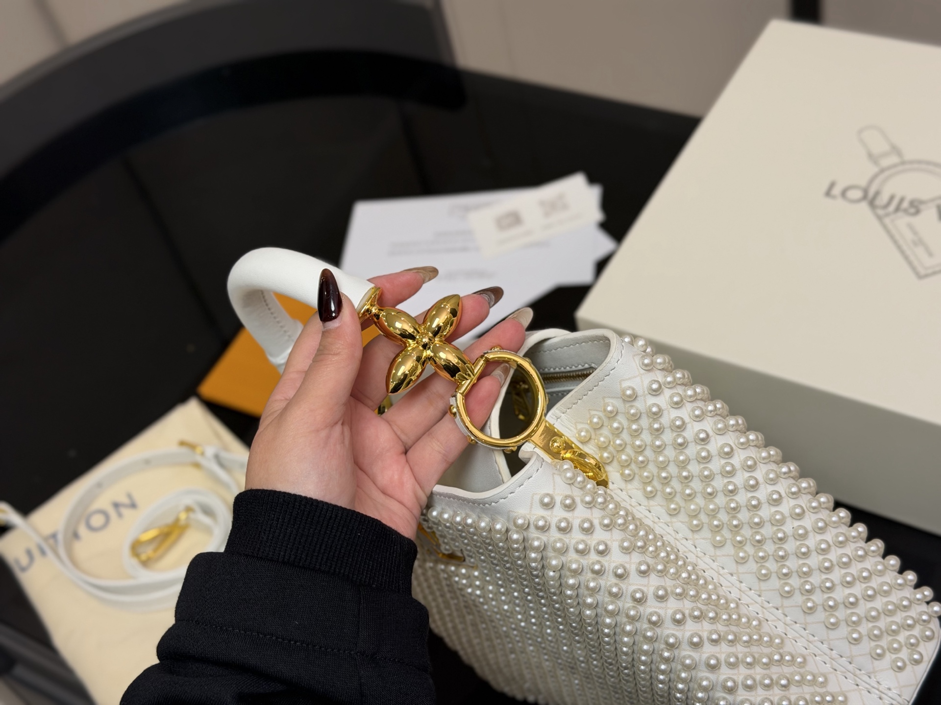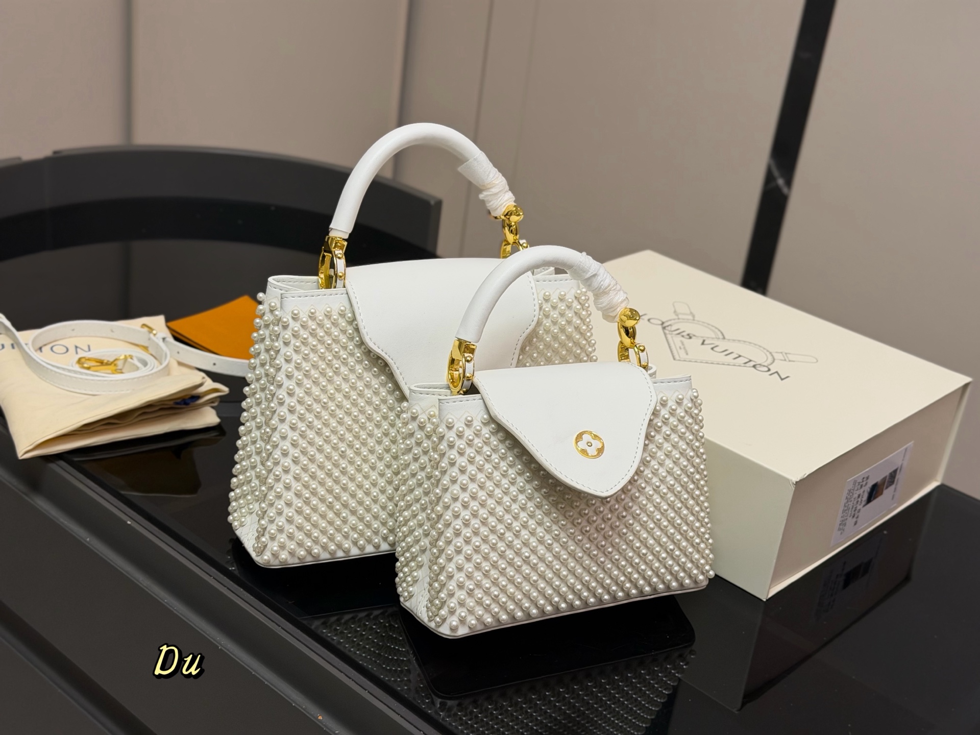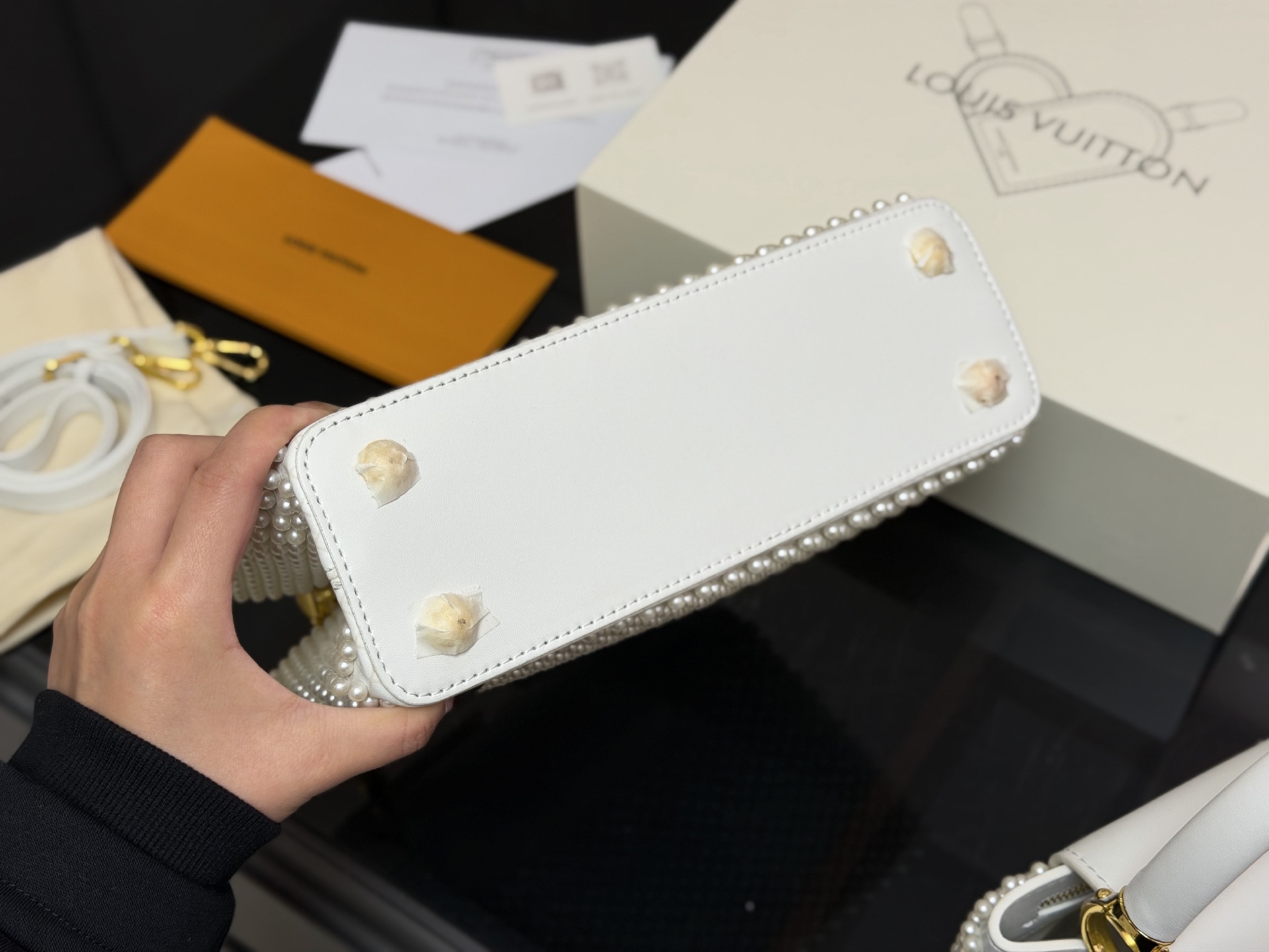 Indulge in luxury with the LV Capucines handbag. Crafted from Taurillon leather and adorned with delicate pearls, this bag exudes timeless elegance.