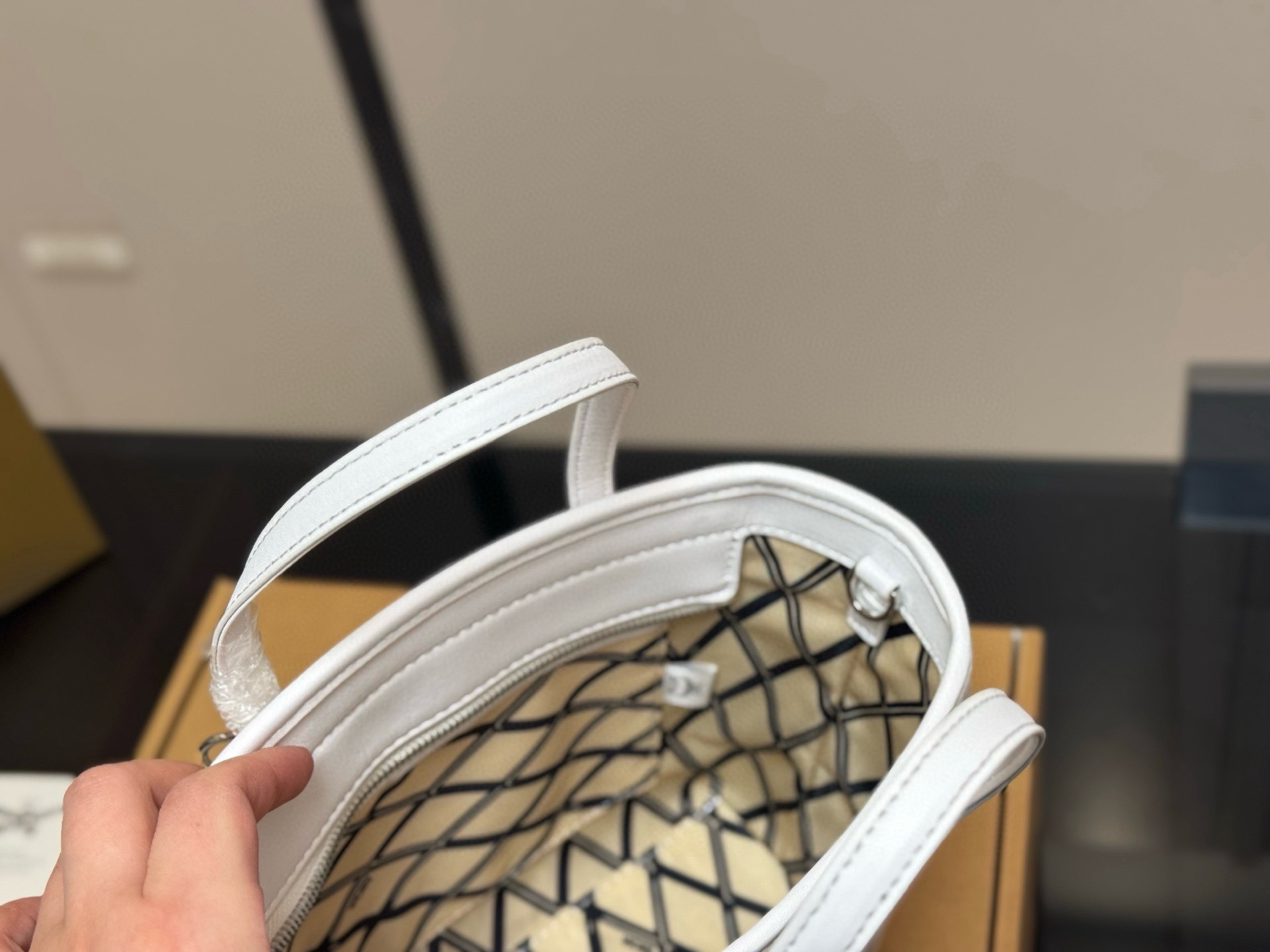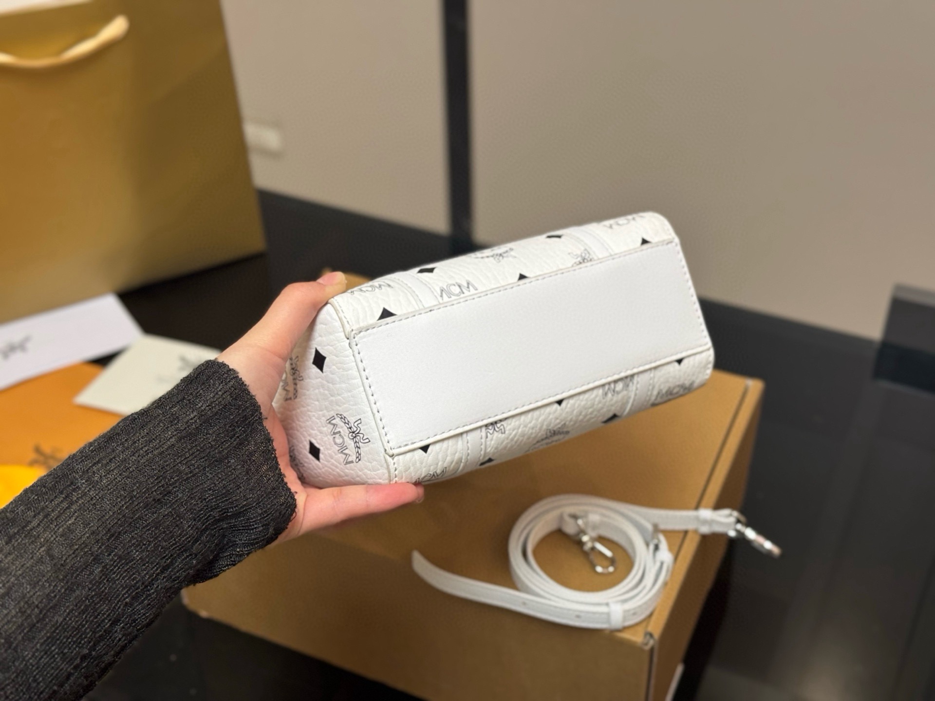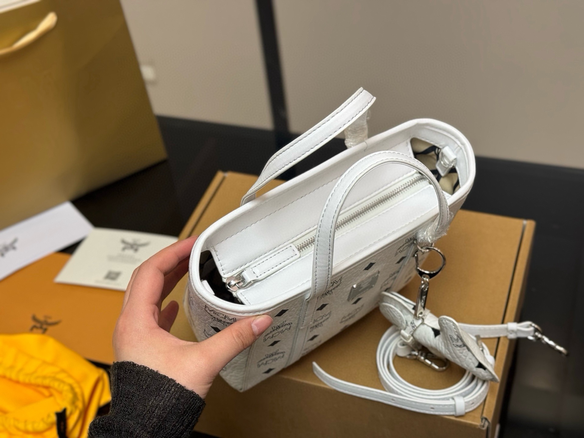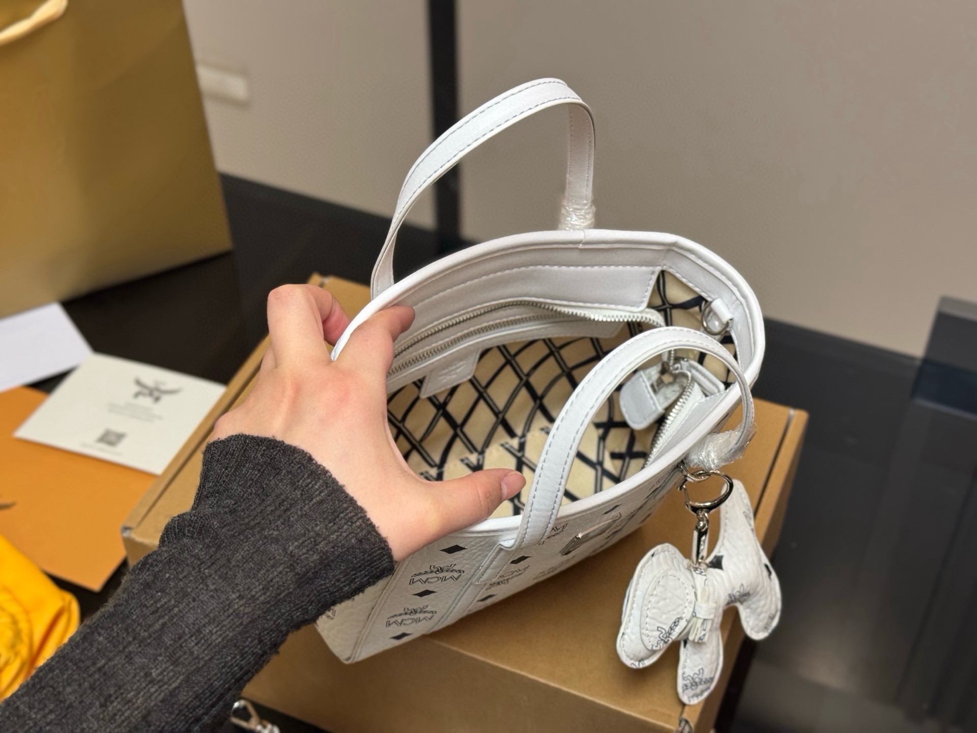 Elevate your style with this MCM mini basket tote. Crafted in white printed leather, it includes a dog charm and complete packaging. Perfect for everyday elegance!