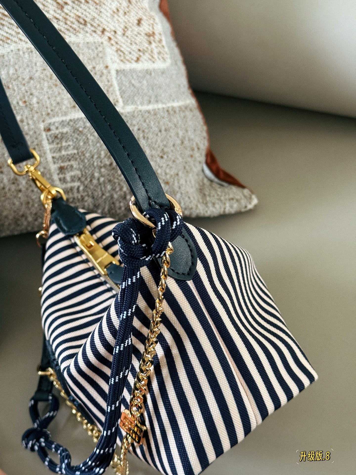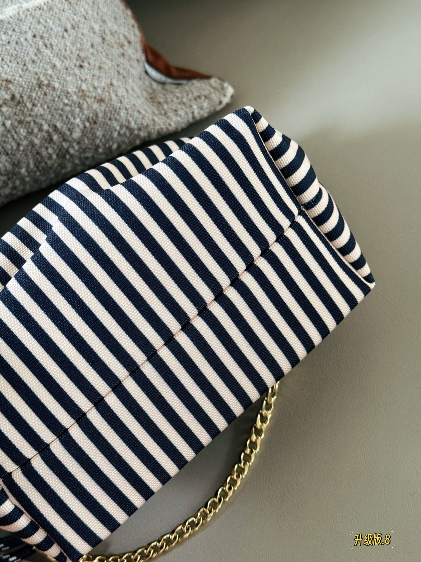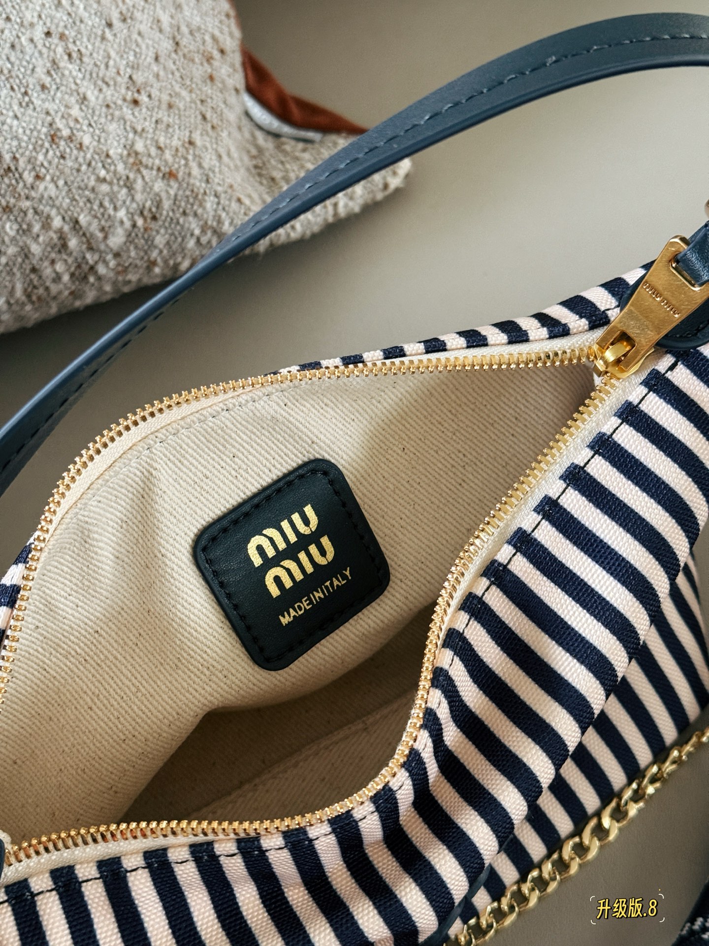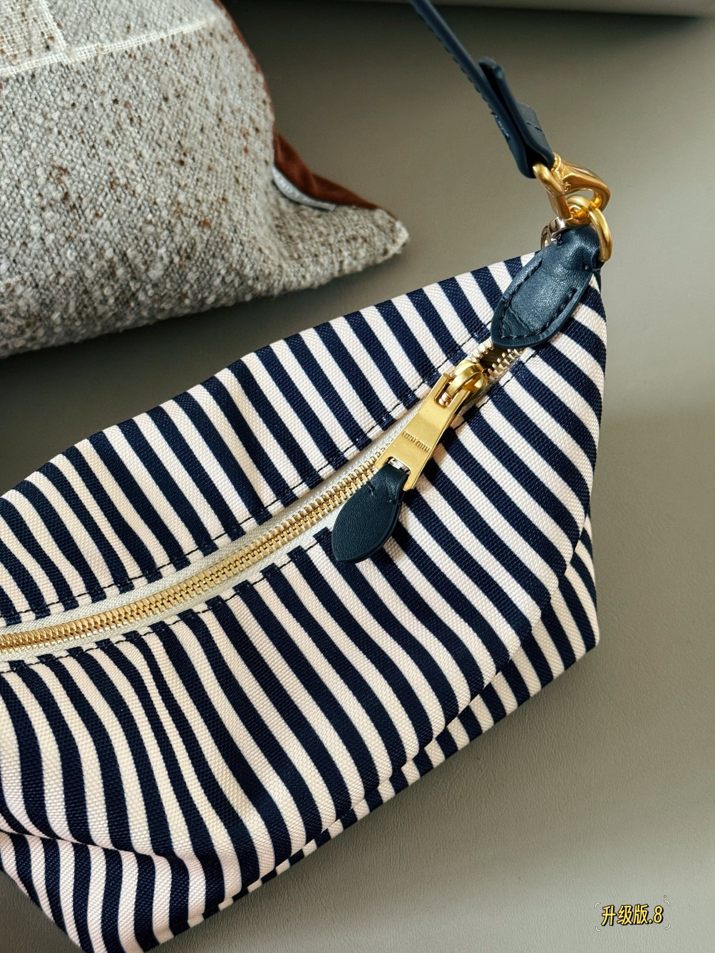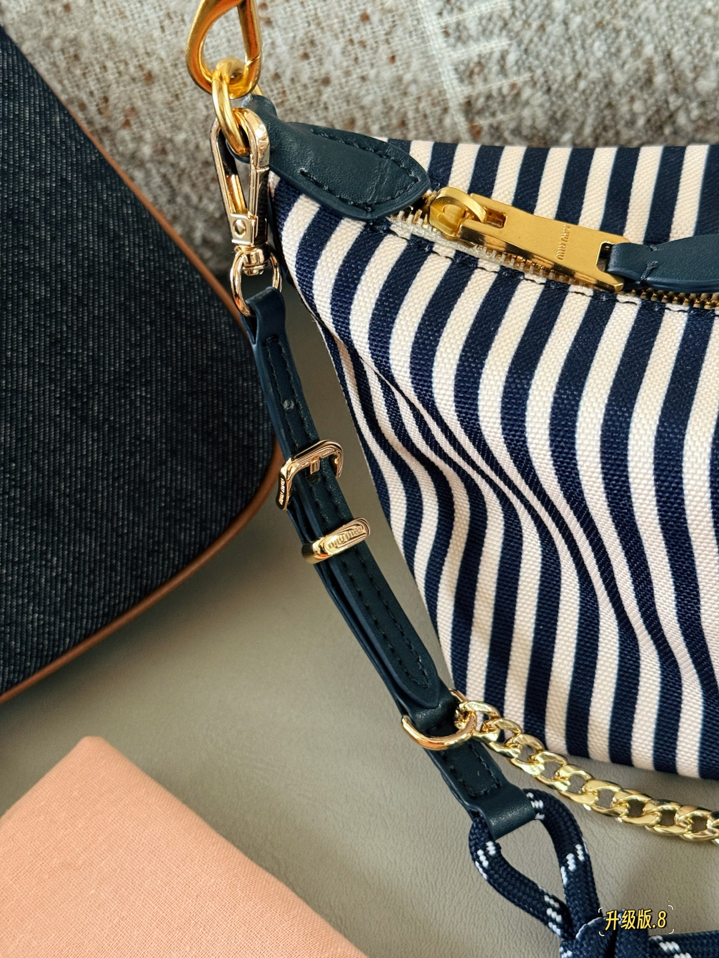 This Miu Miu canvas lunchbox bag is the perfect blend of playful design and high-end fashion. Its classic striped pattern will add a pop of color and style to your summer wardrobe.